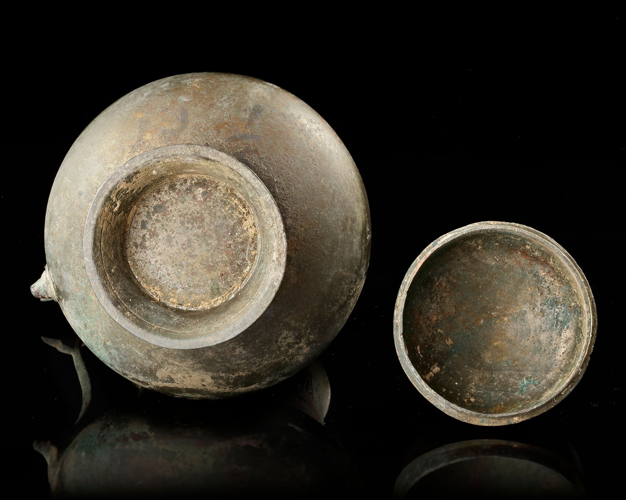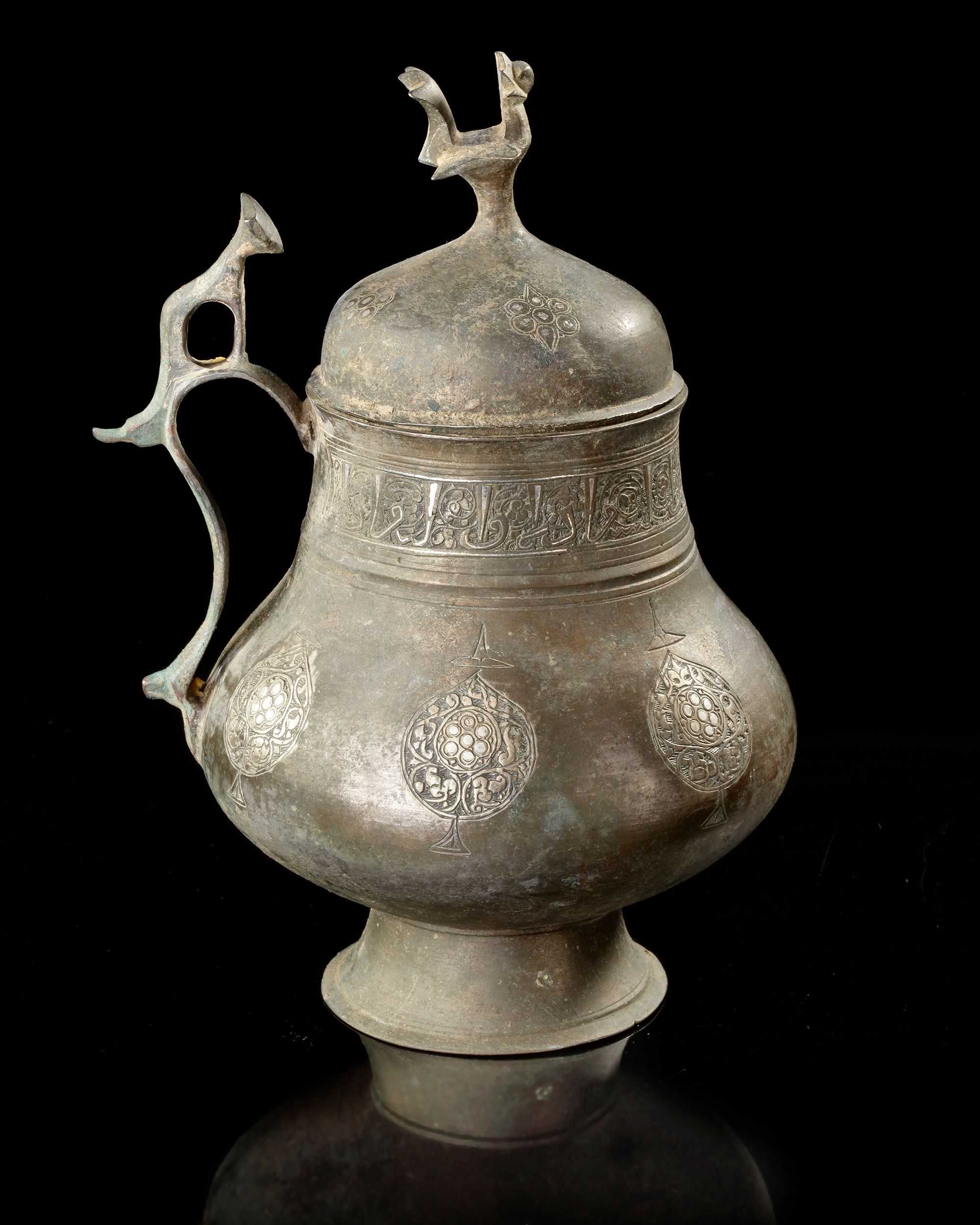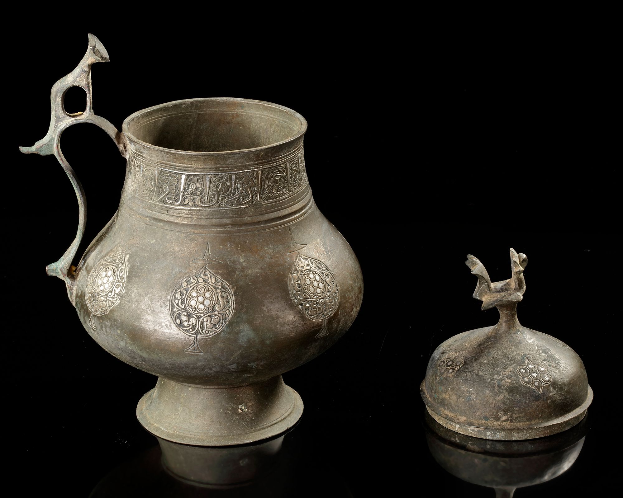 Of baluster form with vertical mouth on spreading trumpet foot, the associated handle linking the midriff and mouth with lion thumb piece, the faceted domed cover with bird finial, the body moulded with a band of flutes around the midriff, each flute engraved with a small floral motif, the shoulder with a crescent panel flanked by two large panels of dense foliage around foliated kufic inscriptions, a band of silver-inlaid benedictory naskh around the mouth against a scrolling ground.