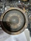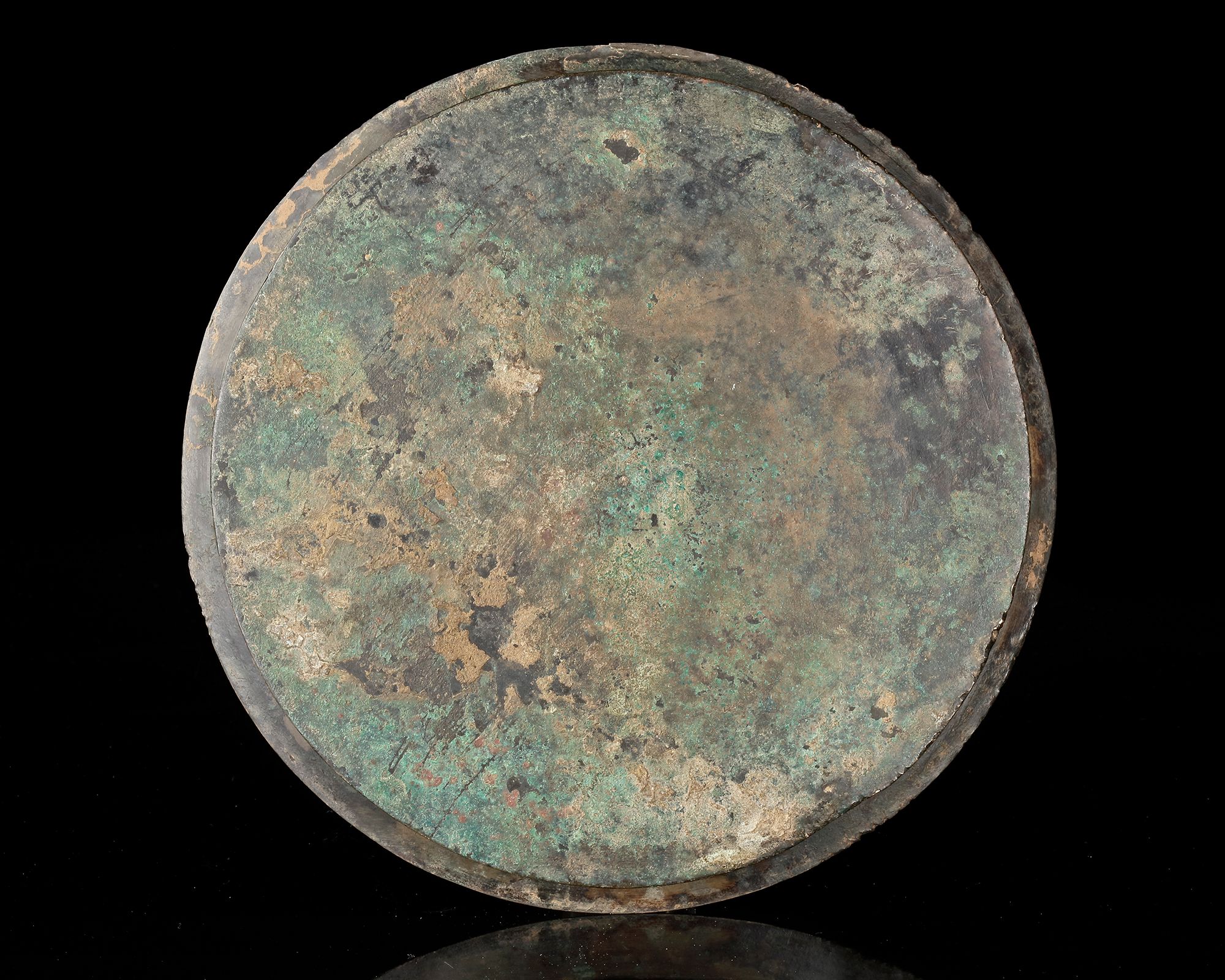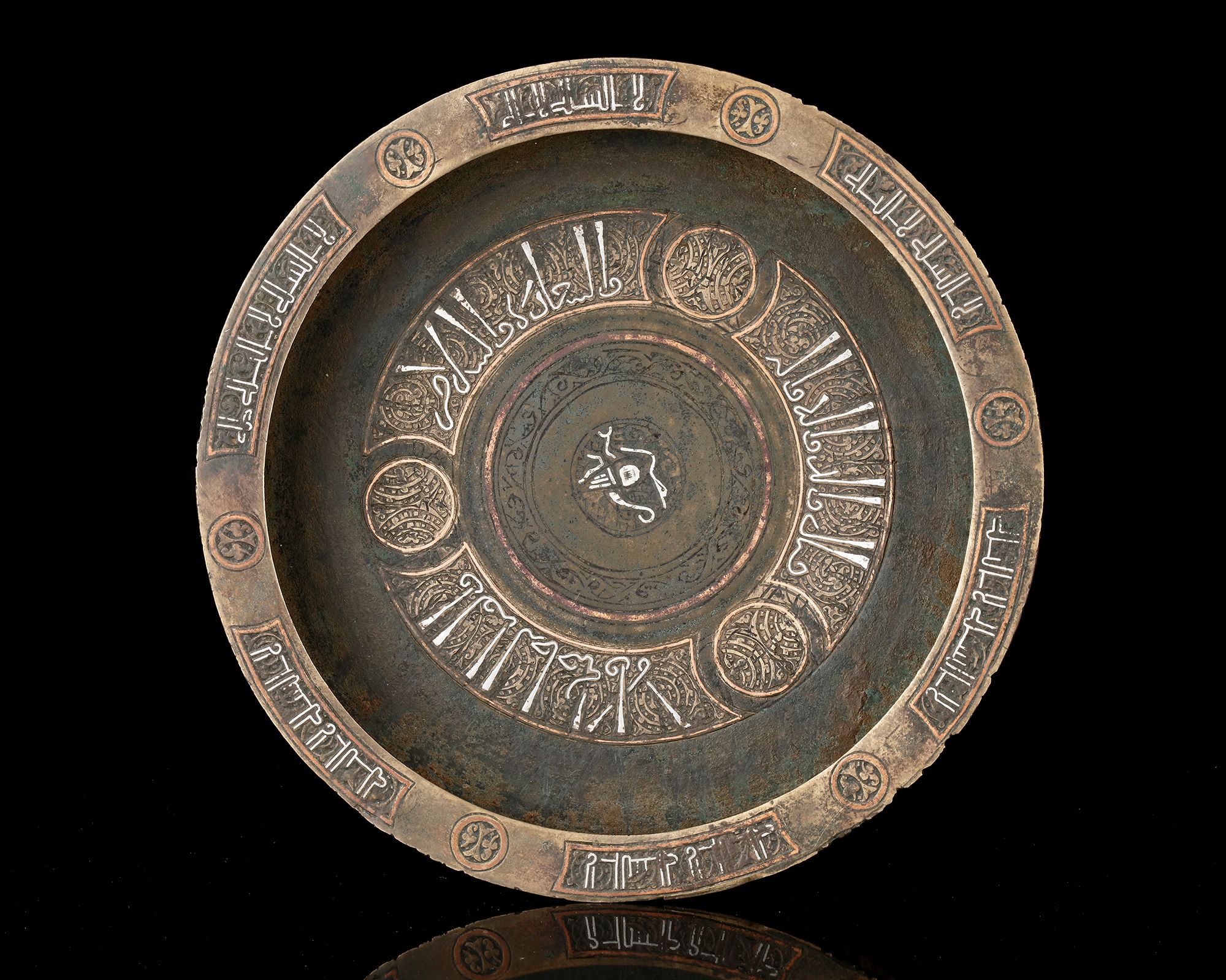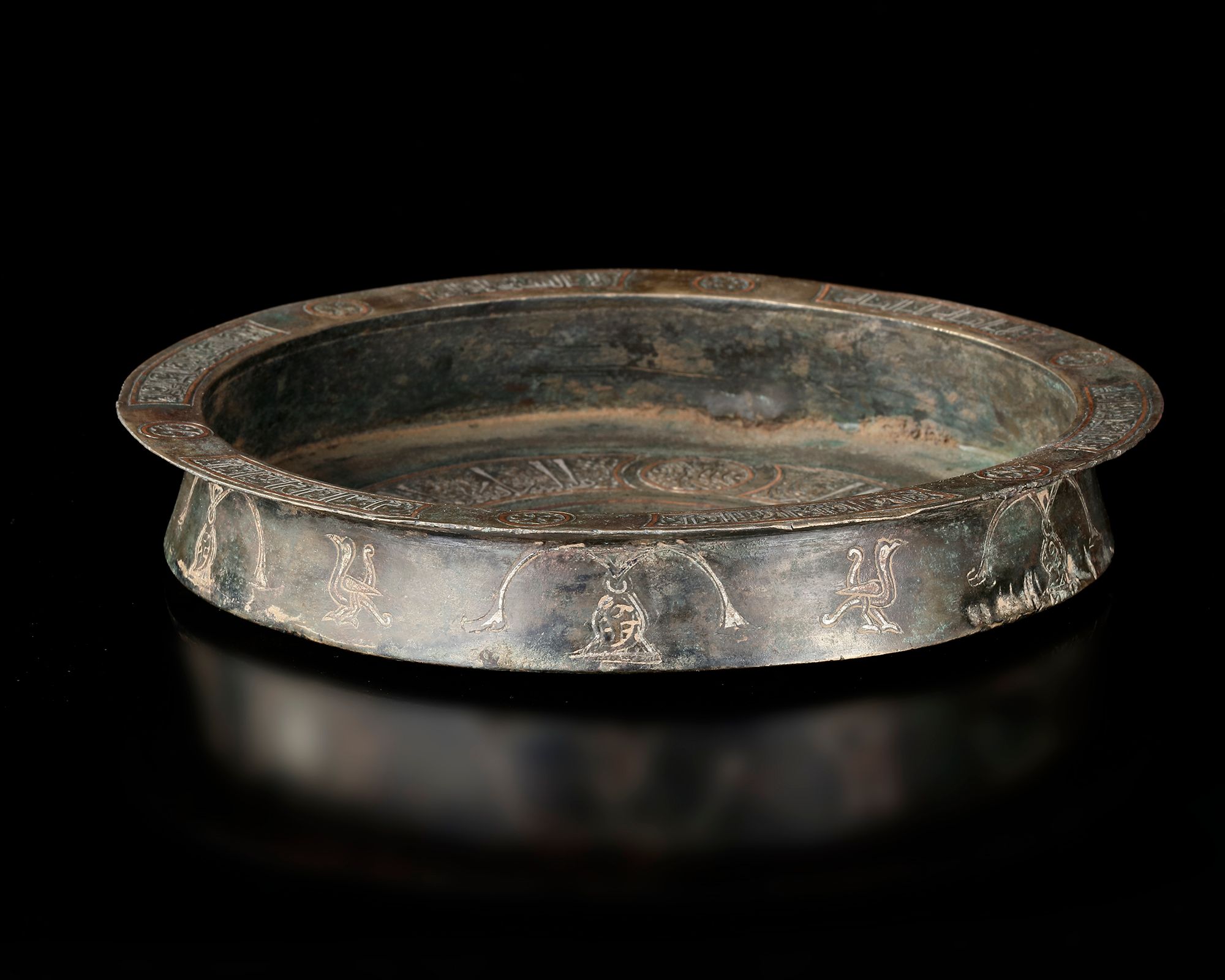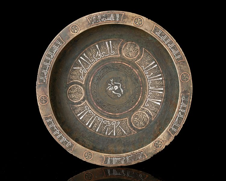A finely crafted bronze tray enriched with silver inlay, featuring a central medallion surrounded. The broad rim is adorned with interlacing motifs.