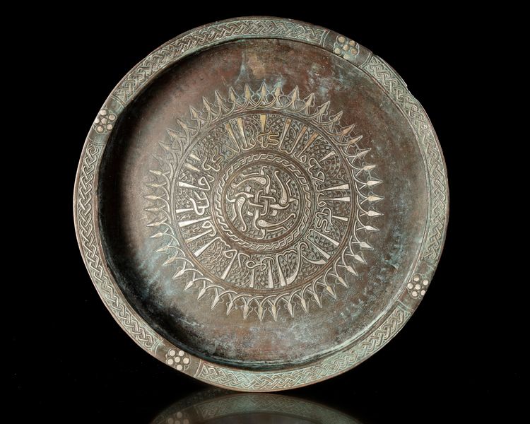 A finely crafted bronze tray enriched with silver inlay, featuring a central medallion surrounded by dense geometric and calligraphic decoration. the broad rim is adorned with interlacing motifs, reflecting the sophisticated metalworking traditions of Khorasan in the medieval period.