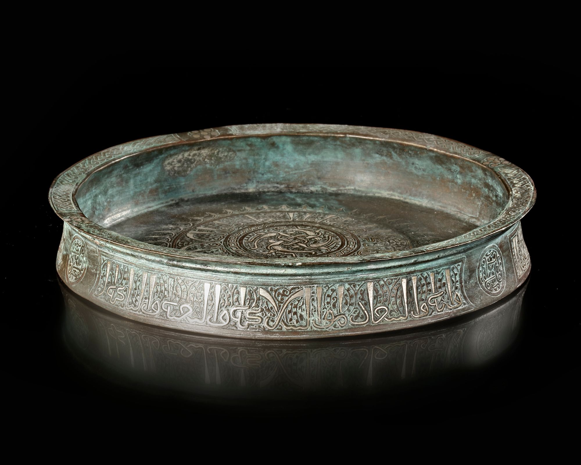 This tray is inscribed in Kufic with benedictory phrases in Arabic around the rim and the inside.