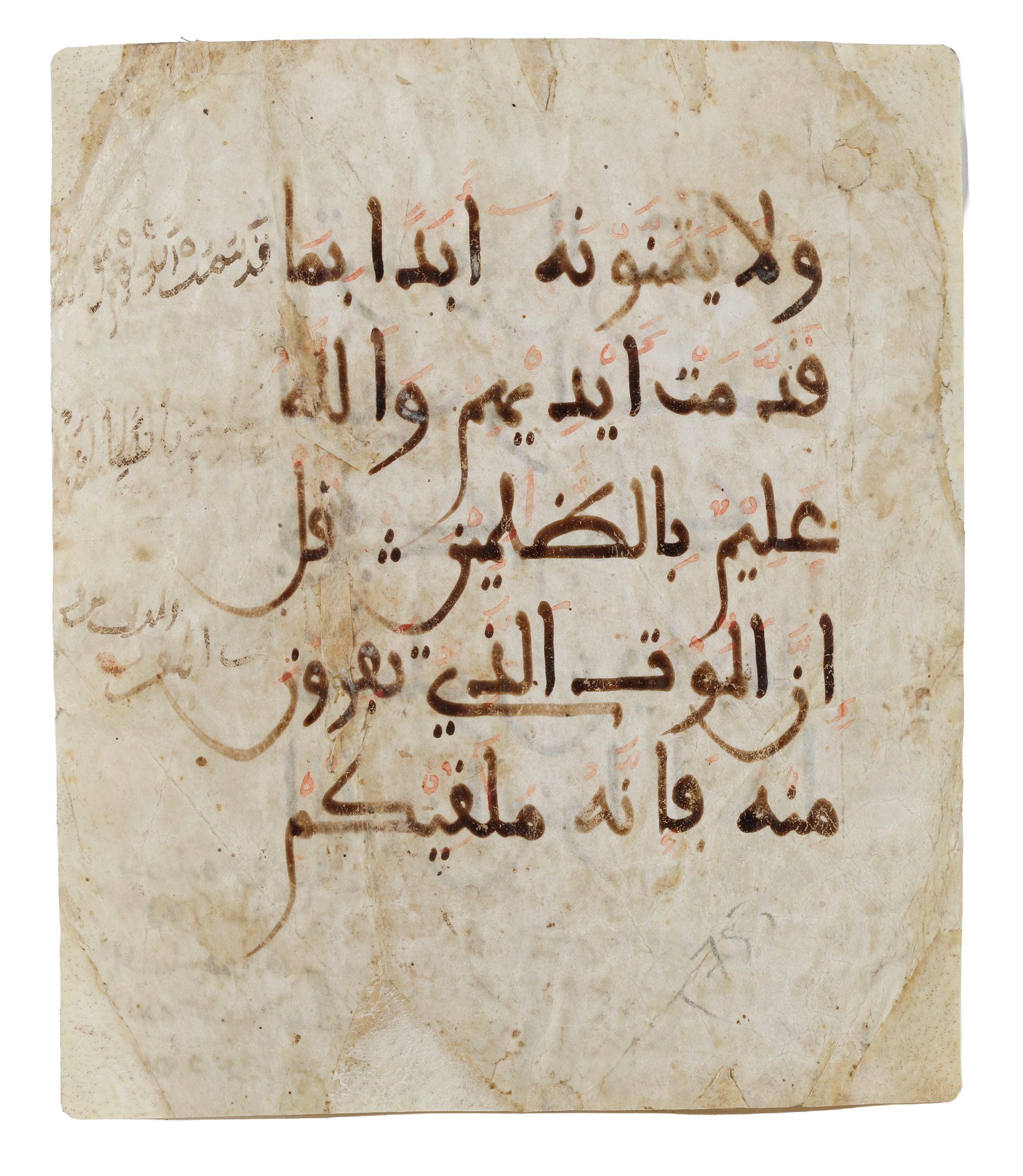 Arabic manuscript on vellum, five lines to the page written in Maghribi script in brown ink, with diacritics and vowel points in red, and verse markers formed by clusters of three dots. Small handwritten text in lighter brown ink in Naskh script appears beneath the main text. Inscription: Verses 7–8 from Surah al-Jumuʿah. Condition: Occasional creasing; edges frayed. 16.5 by 14.5 cm.