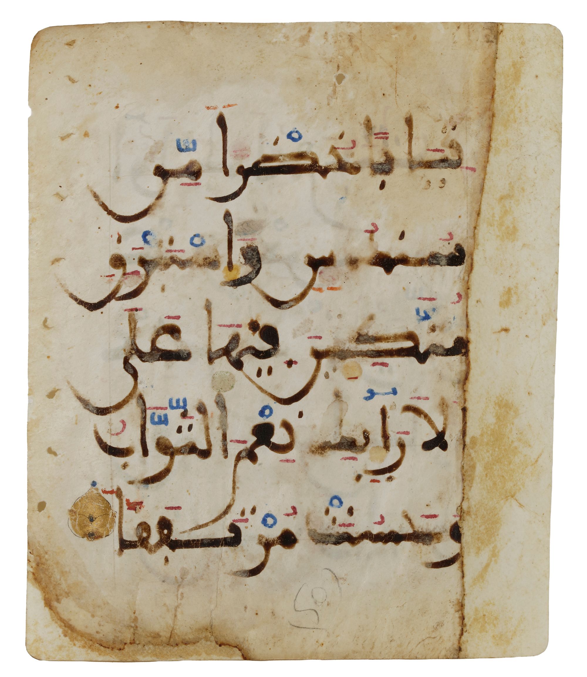 Arabic manuscript on vellum, five lines per page, written in Maghribi script in brown ink, with diacritics and vowel points in red and blue. Verse markers are formed by clusters of three gilt dots outlined in black. Inscription: Verse 31 from Surah al-Kahf. 17.5 × 14.5 cm.