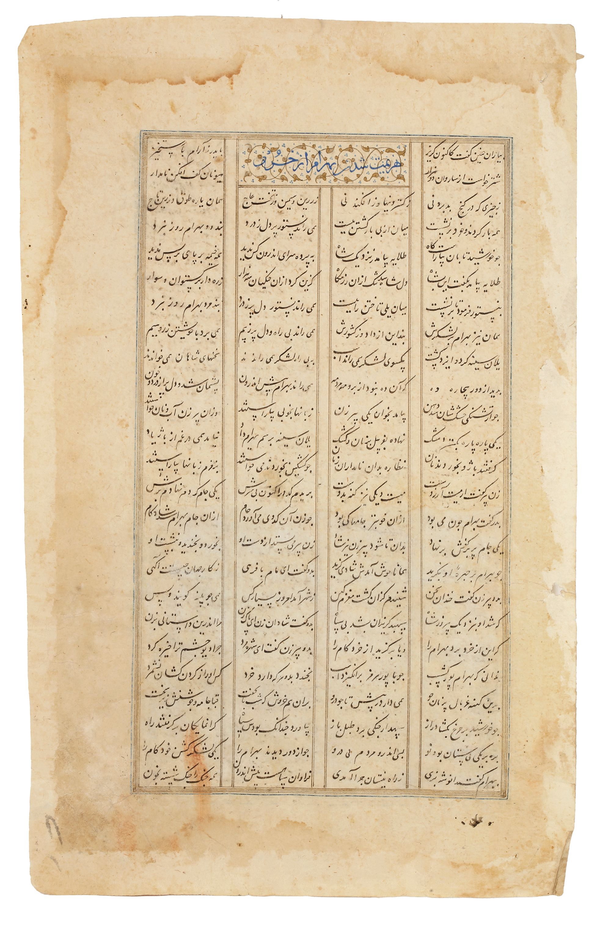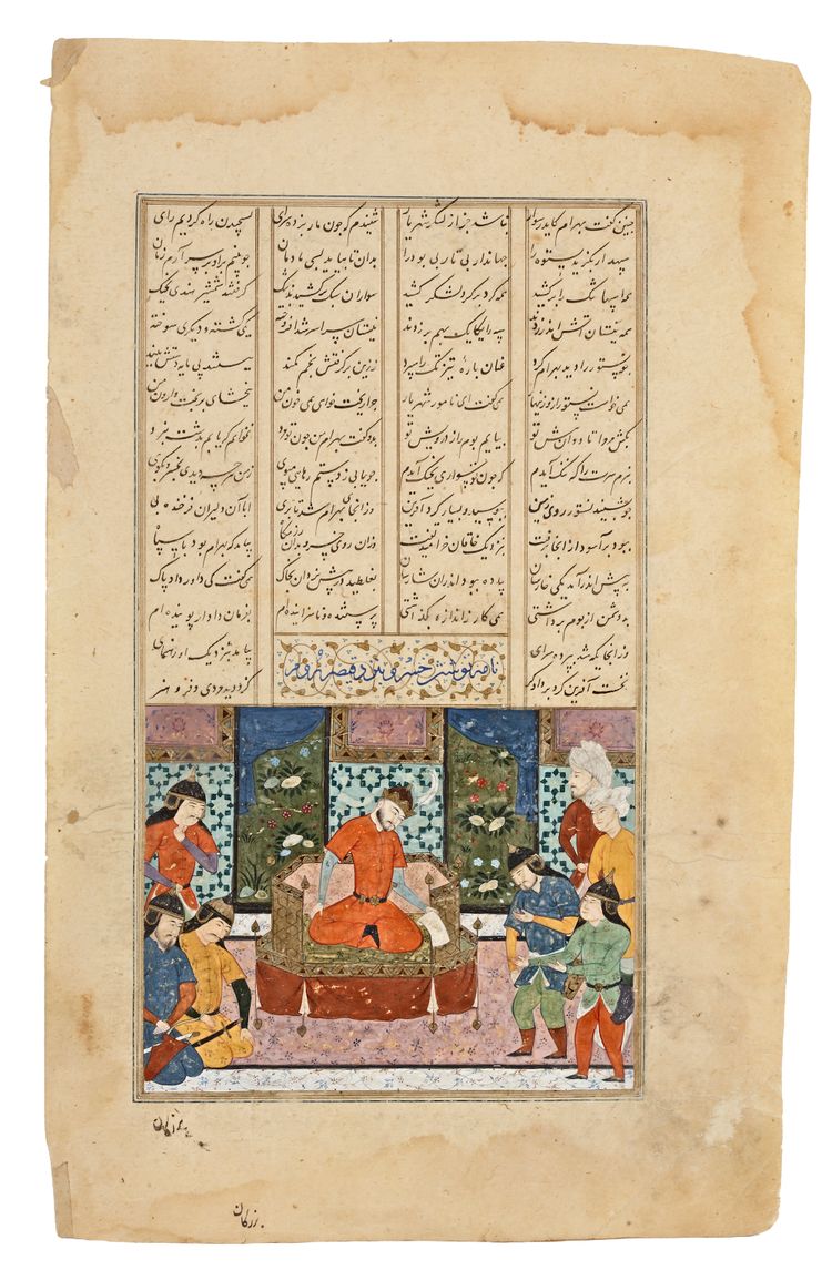 A manuscript page from Ferdawsi’s Shahnameh depicts a royal audience in which Kay Khosrow sits enthroned on a raised platform while a Turanian envoy is brought before him. The ruler is dressed in a brightly colored robe and holds a letter in his hand. The text is arranged in four columns in nasta‘liq script, with the painting executed in opaque pigments heightened with gold on paper. 31 × 19 cm.