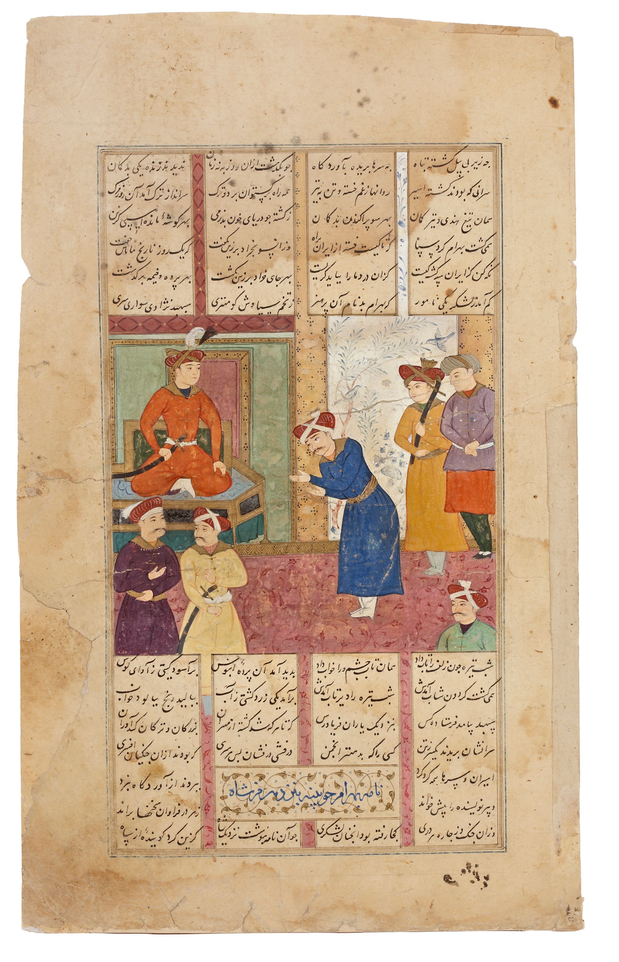 A manuscript page from Ferdawsi’s Shahnameh, depicts a royal audience in which Bahram Gur sits enthroned upon a raised platform while a man accused of wrongdoing is brought before him. The ruler, dressed in a brightly colored robe and plumed turban and holding a sword across his lap, presides over the proceedings with calm authority. Before him a figure bends forward in submission, while two attendants behind the prisoner carry a sword, indicating the imminent enforcement of the king’s judgment. The text is arranged in four columns in nasta‘liq script, with a painting executed in opaque pigments heightened with gold on paper.