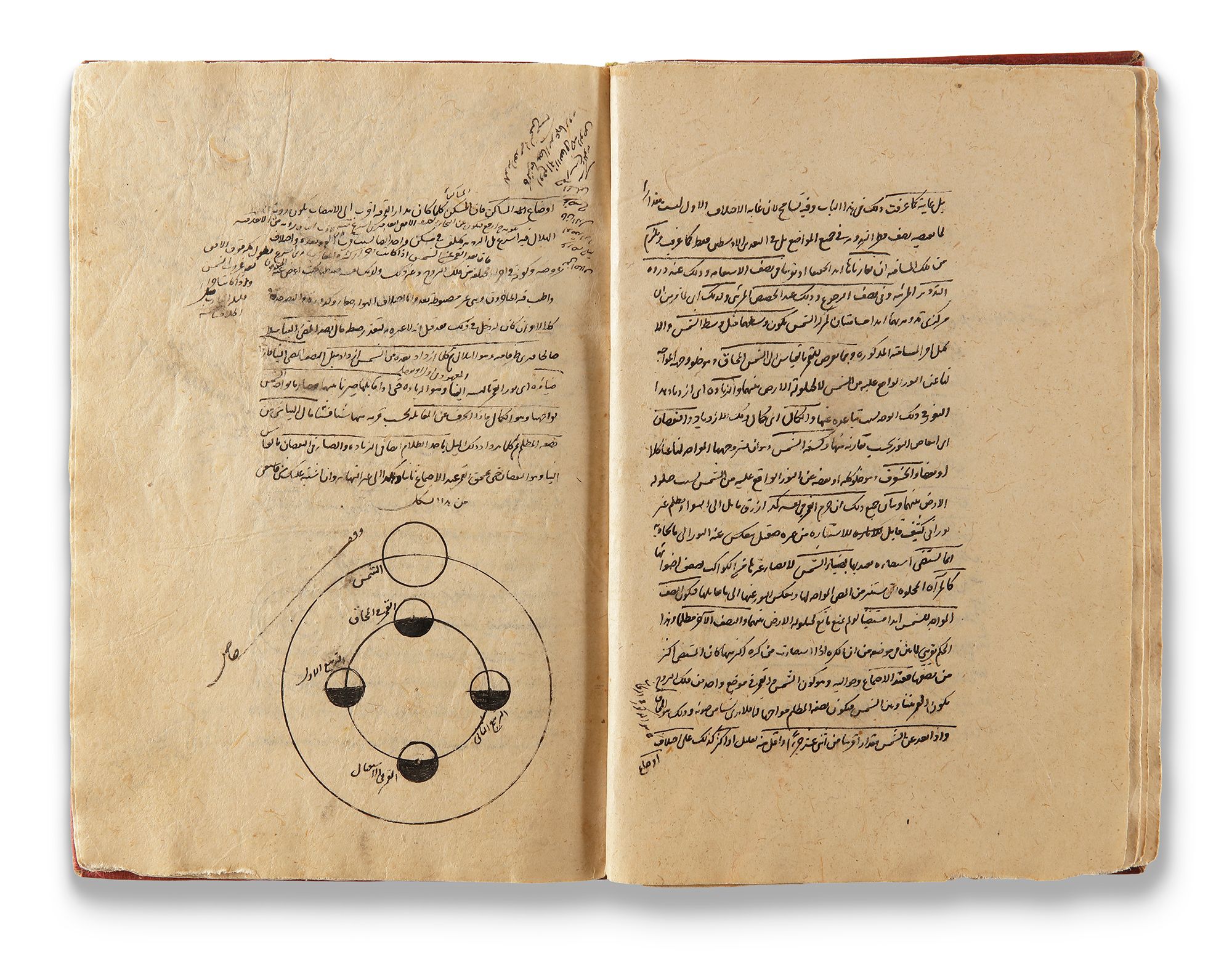 Arabic manuscript on paper, comprising 34 pages, each with 19 lines written in a neat naskh script in black ink. Headings and catchwords are executed in red ink. The manuscript contains two treatises and includes multiple astronomical drawings and diagrams, illustrating celestial spheres and planetary motions.