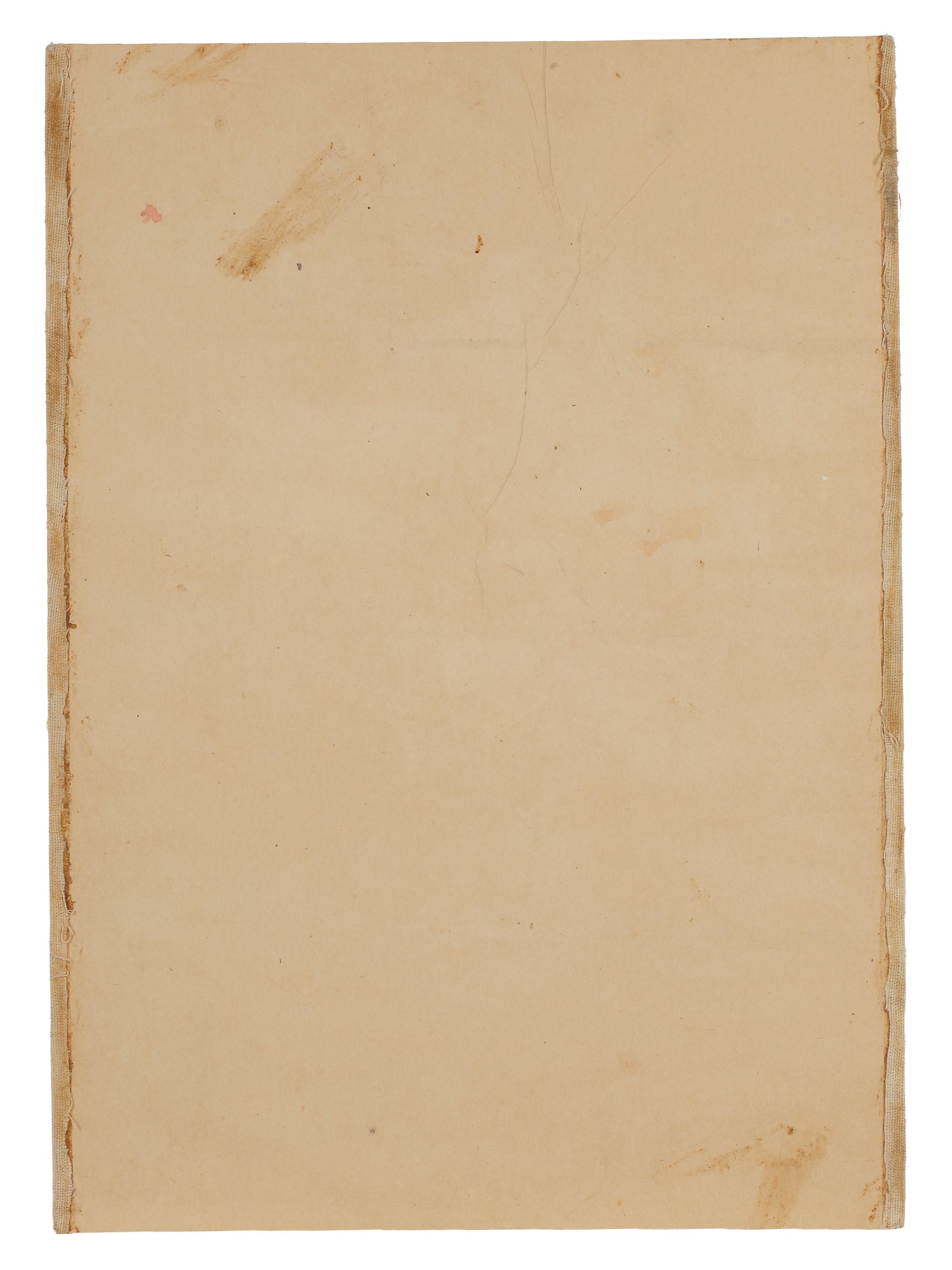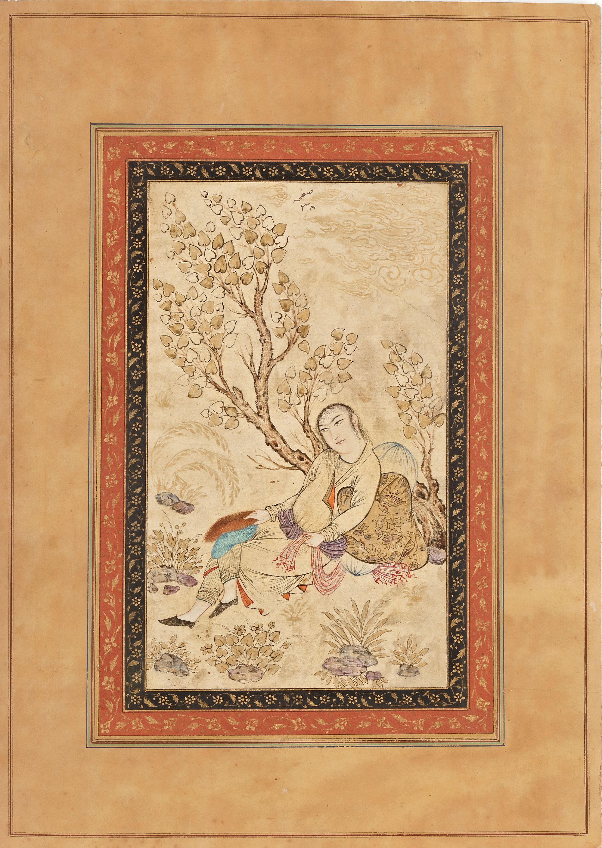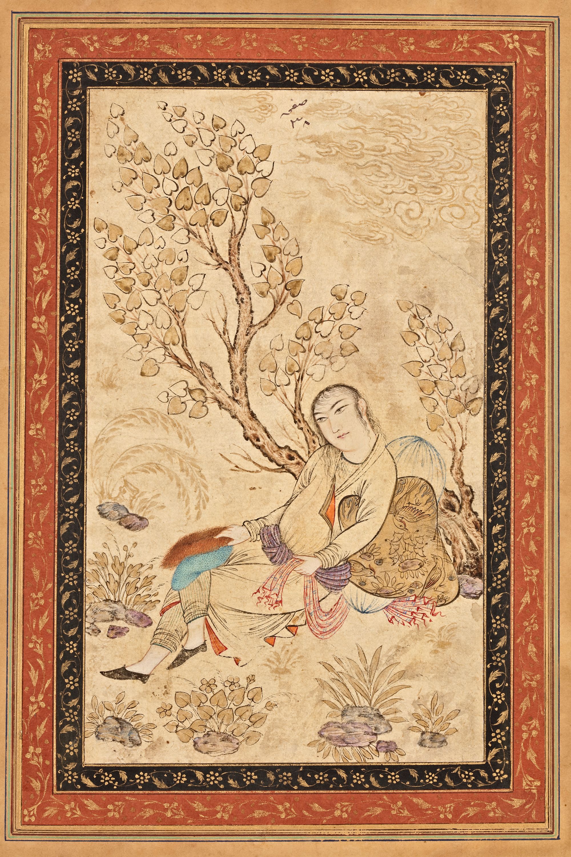 Opaque pigments heightened with gold on paper, set within double inner borders decorated with gilt floral scrolls on polychrome grounds, mounted on card. The painting depicts a youthful figure reclining beneath a slender tree with small, heart-shaped leaves. The figure’s posture is relaxed, leaning against a richly patterned cushion or bolster, with one leg extended and the other bent. The face is oval and softly modeled, with fine arched eyebrows and elongated eyes. The figure is dressed in a long, light-colored robe with decorative trim, layered garments visible at the sleeves, and patterned leggings. The fabric drapes gracefully, emphasized by fine ink outlines and gentle washes of color in muted blues, creams, soft reds, and gold tones. The cushion behind the figure features intricate floral designs, suggesting refinement and courtly luxury. 33 by 23.5 cm.