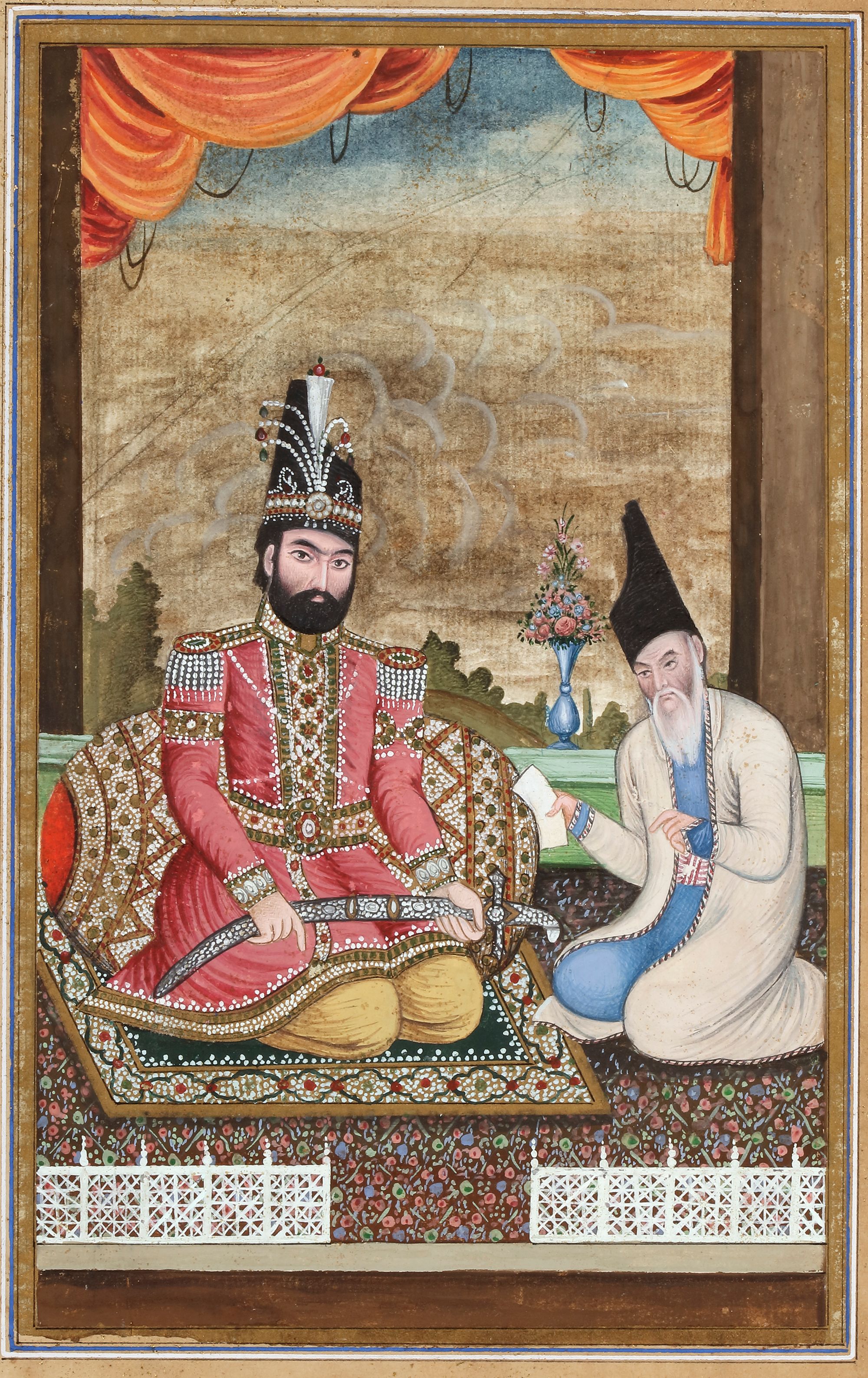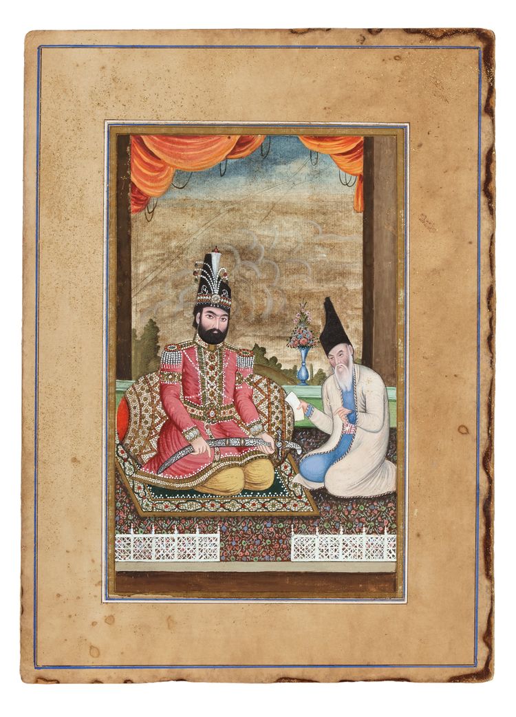 Gouache colour heightened with gold on paper, depicts Muhammad Shah, the third ruler of the Qajar dynasty (r. 1834–1848), sits gracefully on a verandah, clutching a jewel-studded sword that signifies his authority. Beside him, his loyal vizier, Haj Mirza Aghasi, leans forward to read a letter.