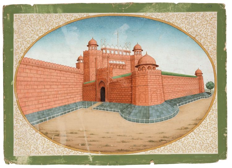 A miniature from around 1850 depicts the Red Fort in Delhi, built between 1638 and 1648. In 1857, it was the residence of the last Mughal emperor, Bahadur Shah Zafar. During the Indian Rebellion, mutinous soldiers (sepoys) and civilians sought his support, forcing him to become a symbolic leader of the uprising.