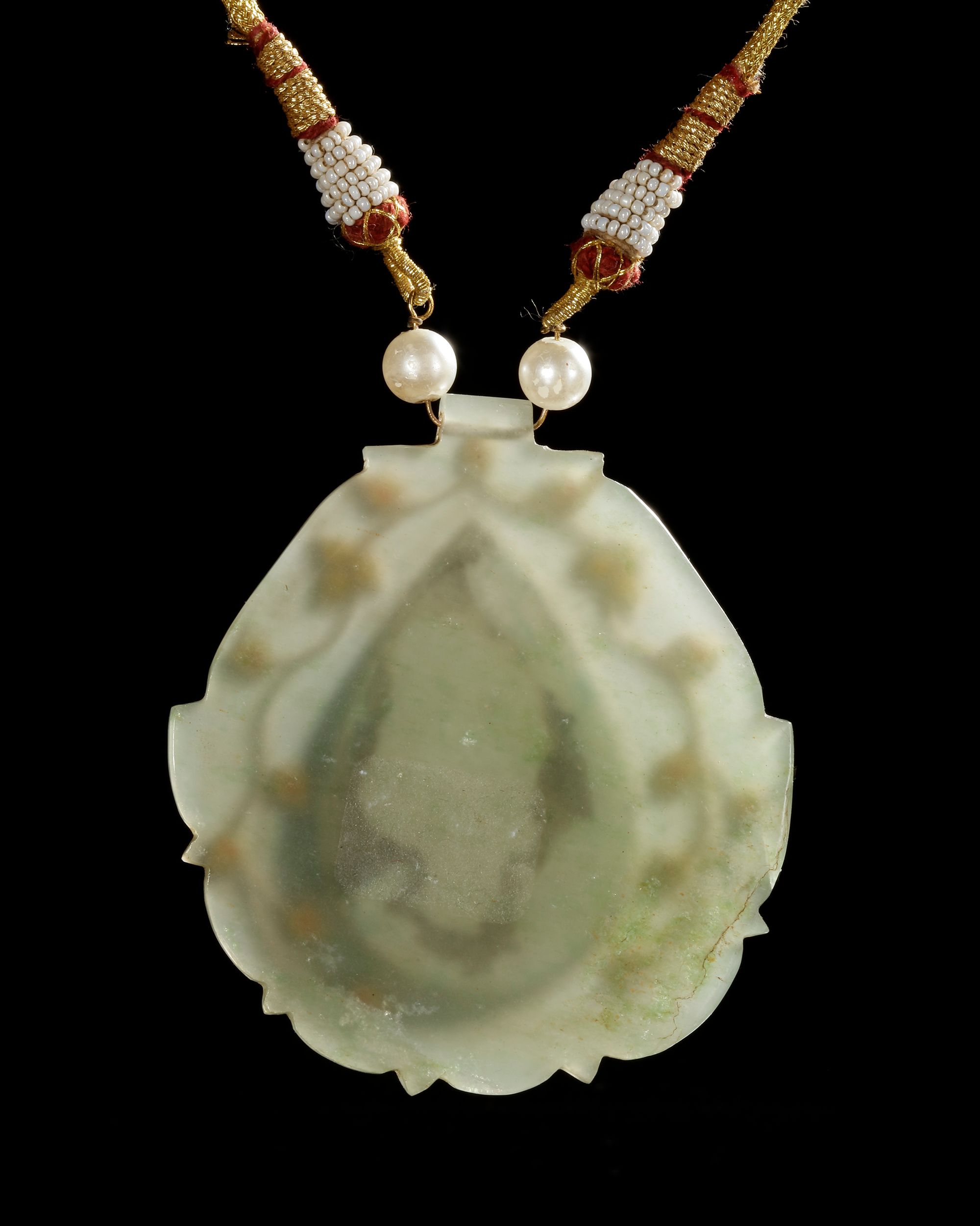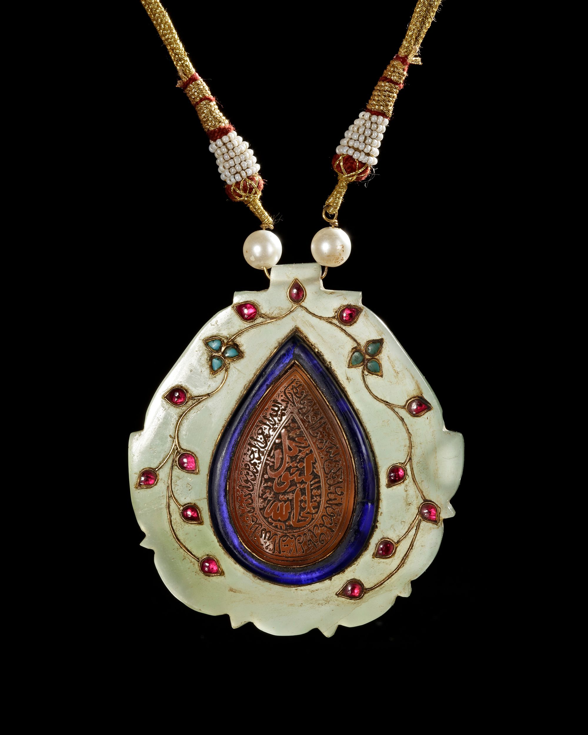 An Indo-Persian amulet pendant carved from celadon nephrite jade, set with a carnelian medallion engraved with a Qur’anic verse. The medallion is framed by a dark blue glass border with floral decoration and suspended from a cord ending in mother-of-pearl bead tassels. Inscription: surah al-Ikhlas Size: 8 × 7 cm.