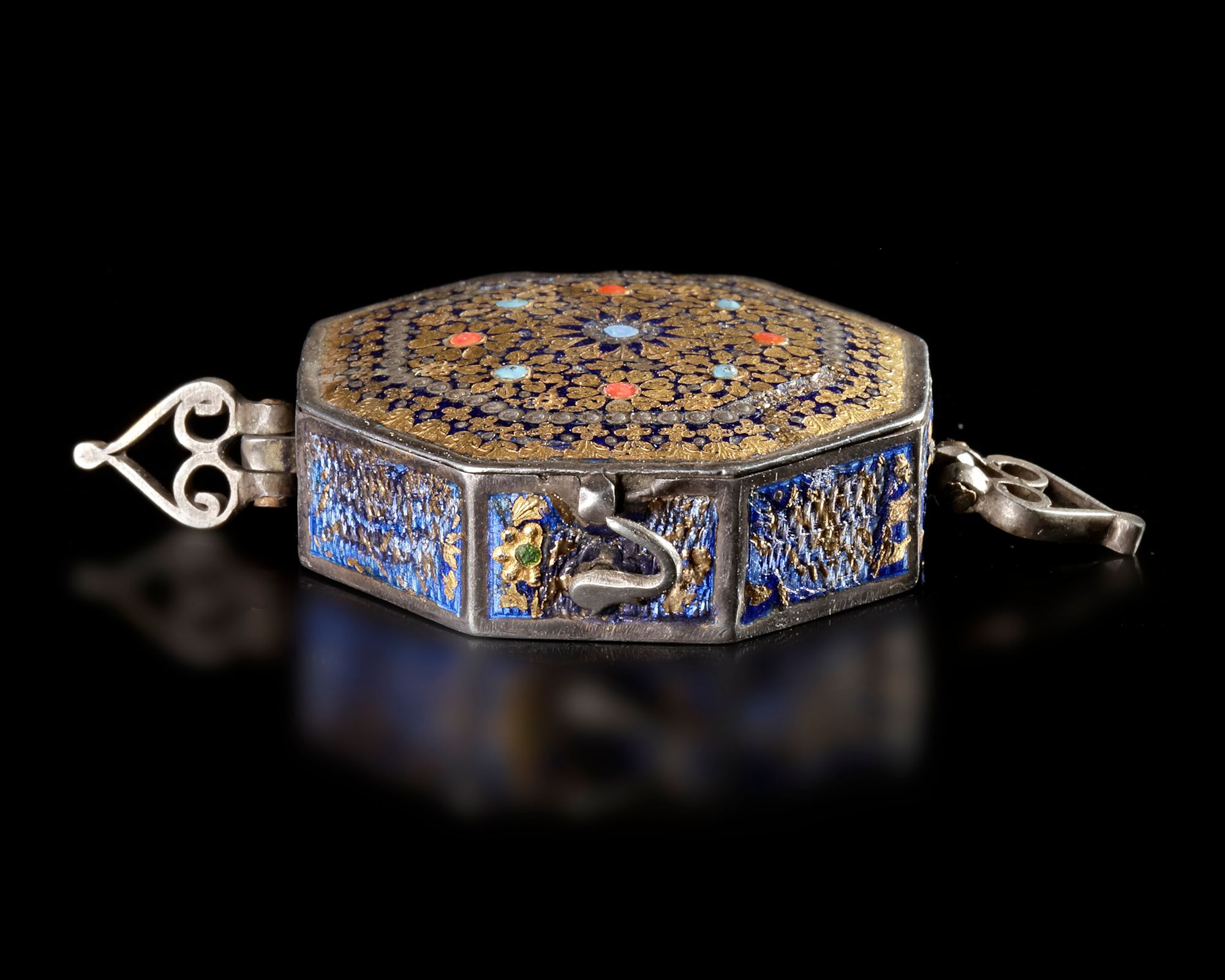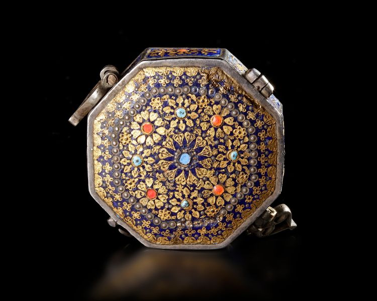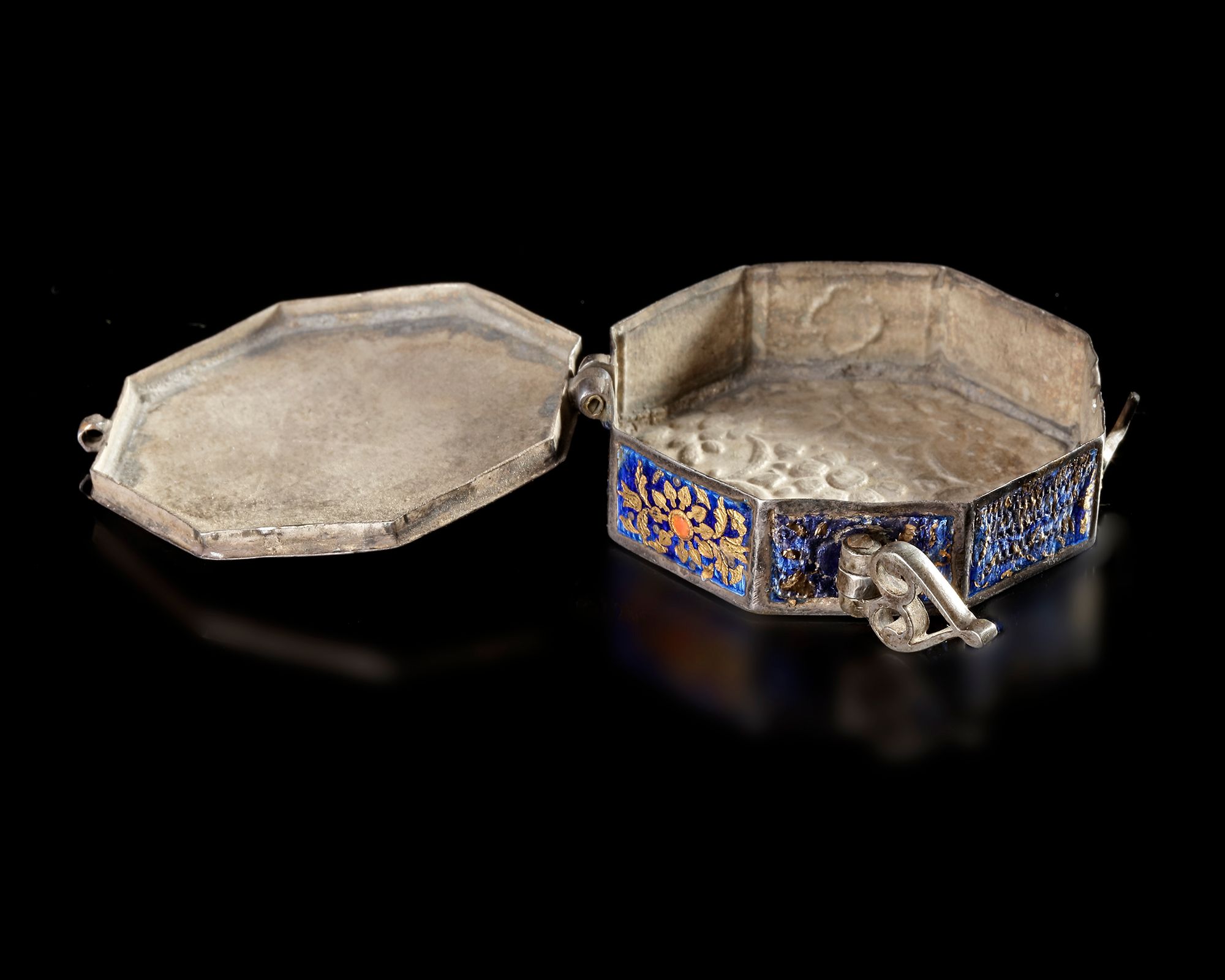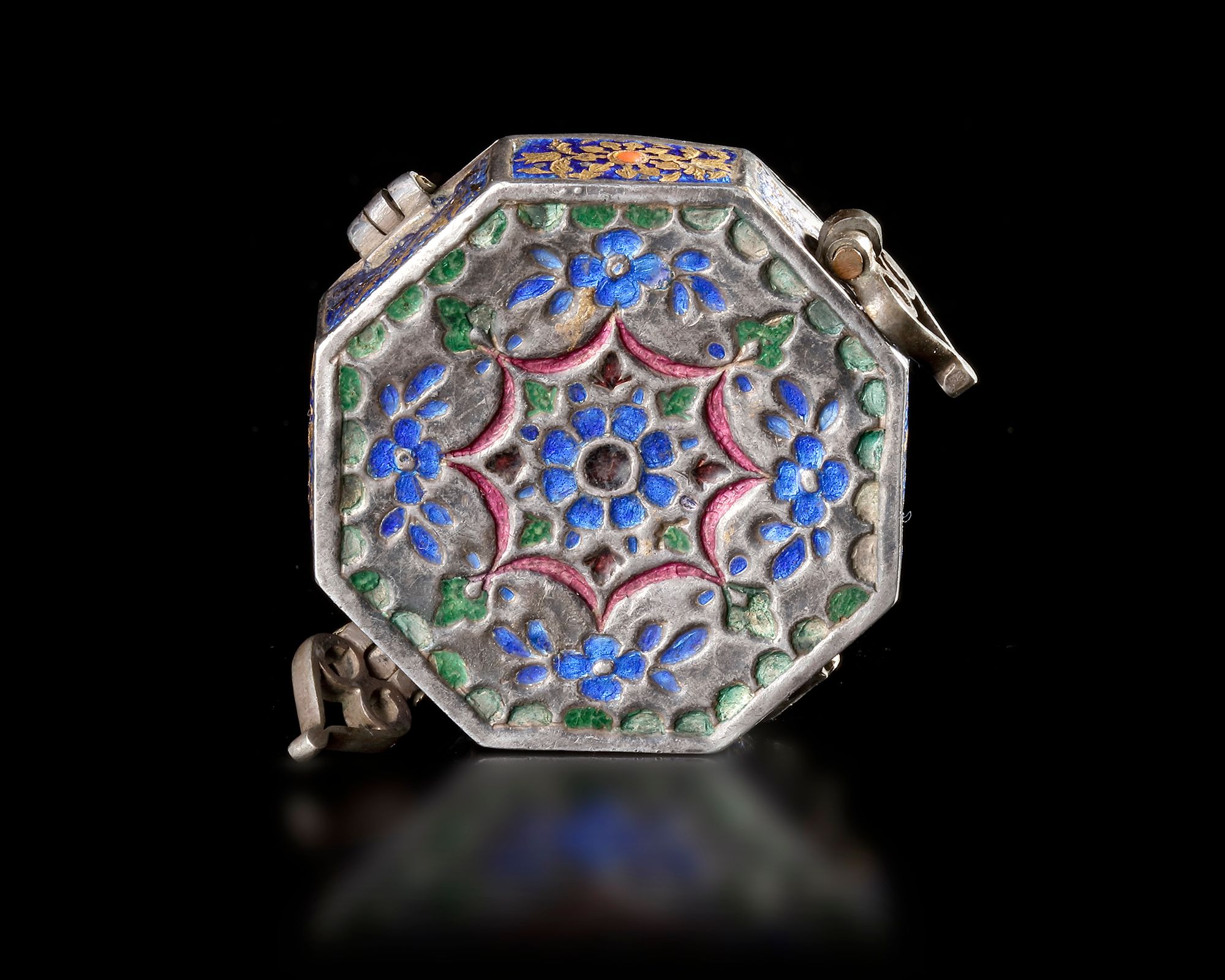 A finely crafted octagonal Indian silver box from the 19th century, richly decorated with colorful enamel. The lid displays an intricate floral rosette design in gold over deep blue enamel, accented with red and turquoise details. The sides feature enamel panels, while the reverse shows a delicate polychrome floral motif.