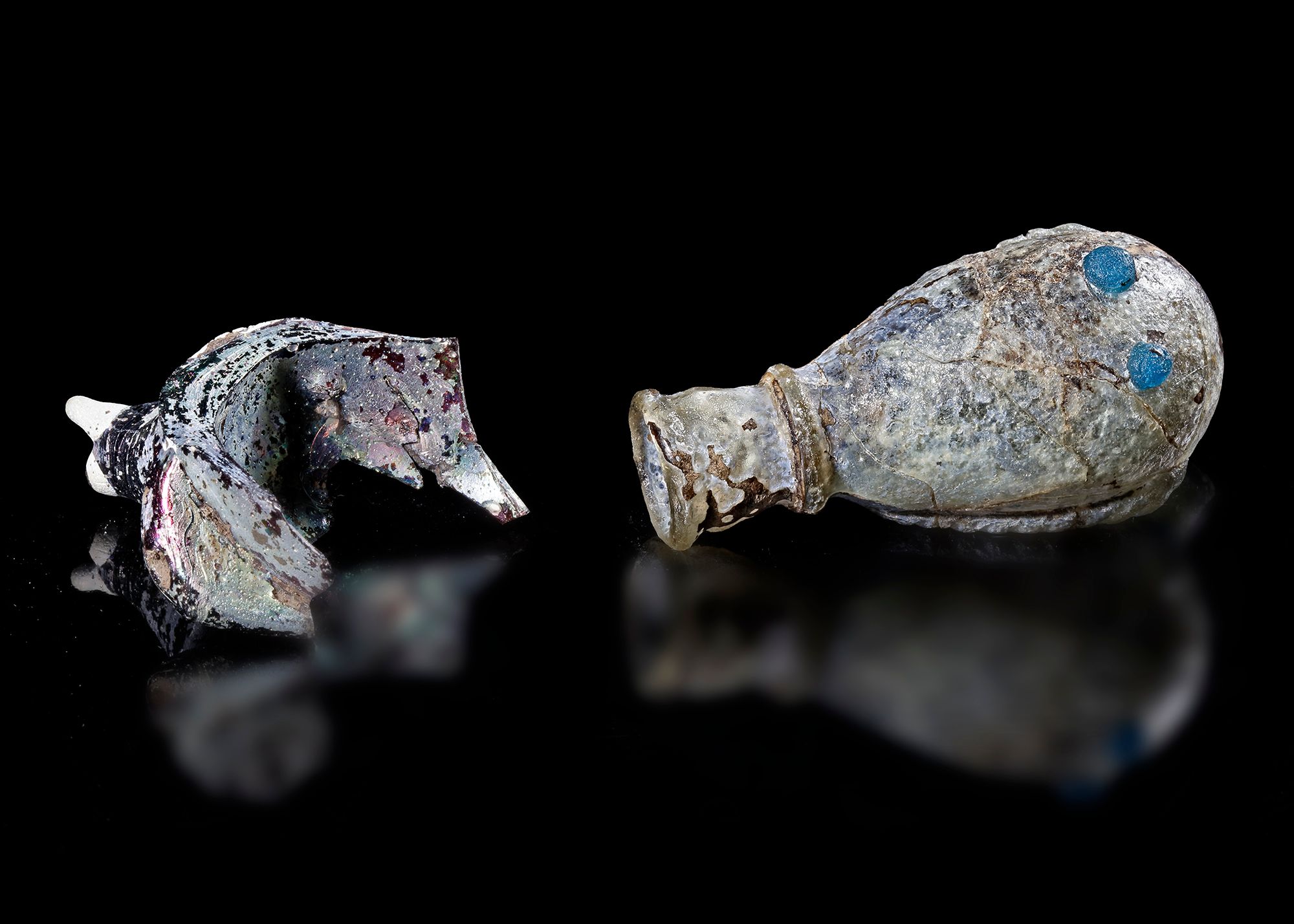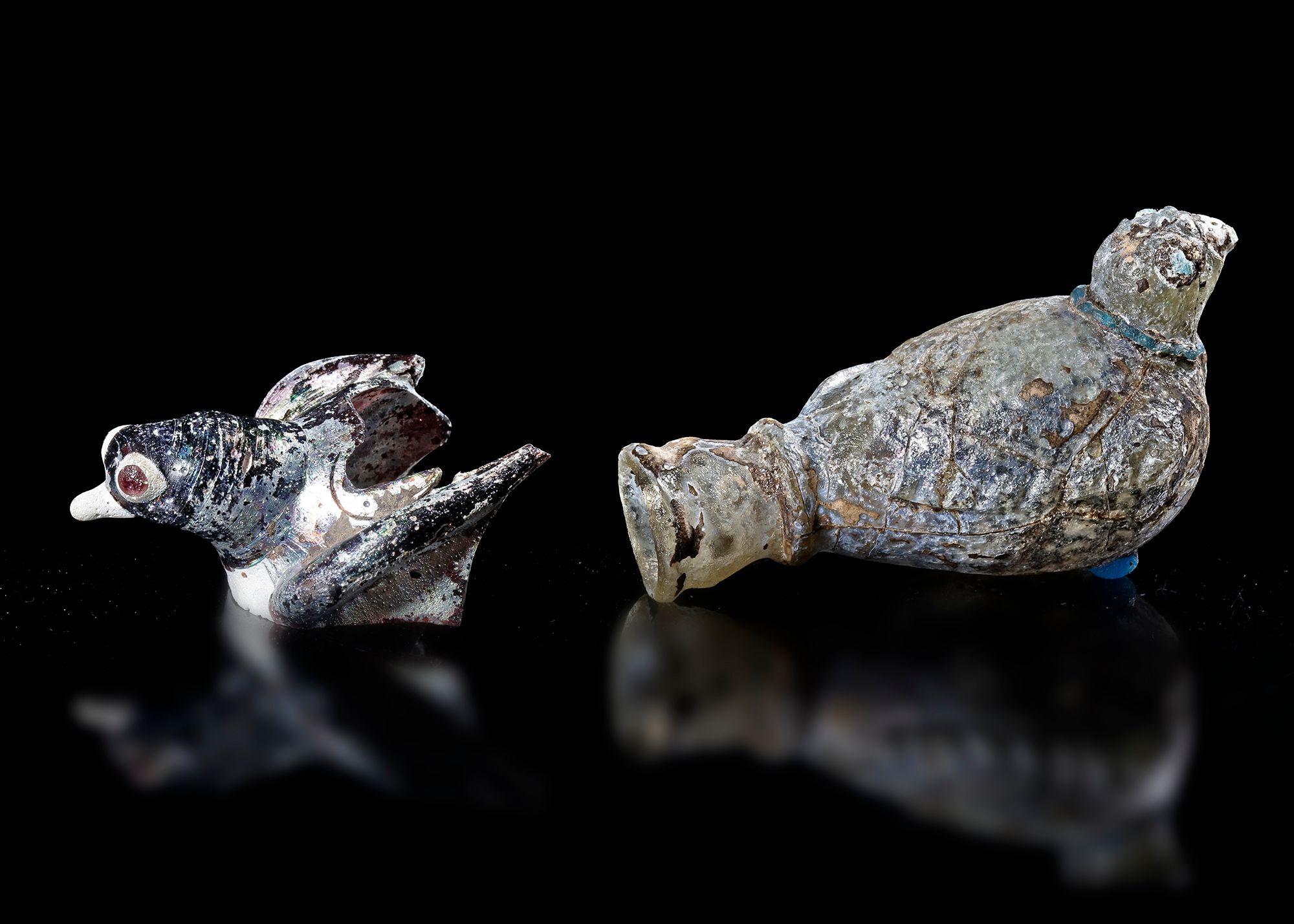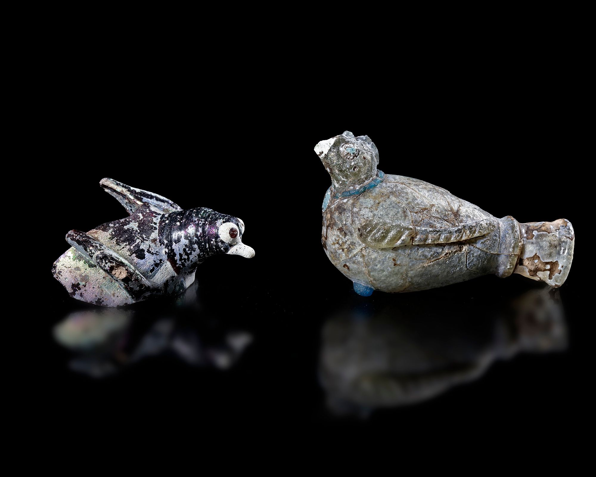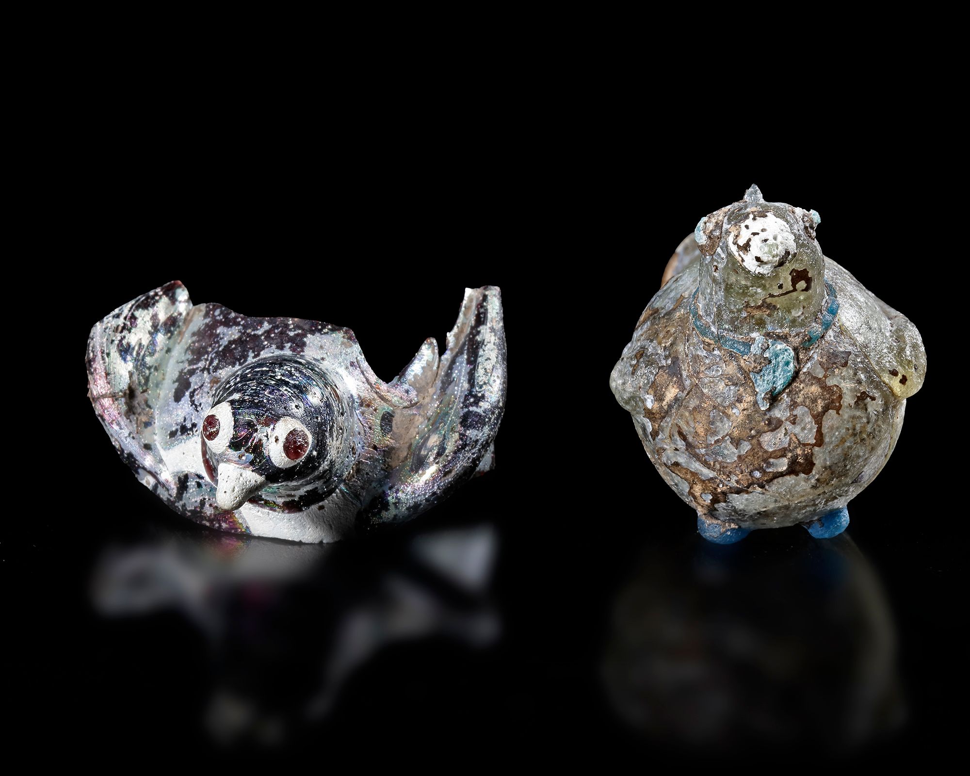 A remarkable pair of 9th-century Near Eastern glass birds, crafted with delicate blown forms and vivid applied details. Their iridescent surfaces and expressive features highlight the artistic creativity of early Islamic glassmakers.