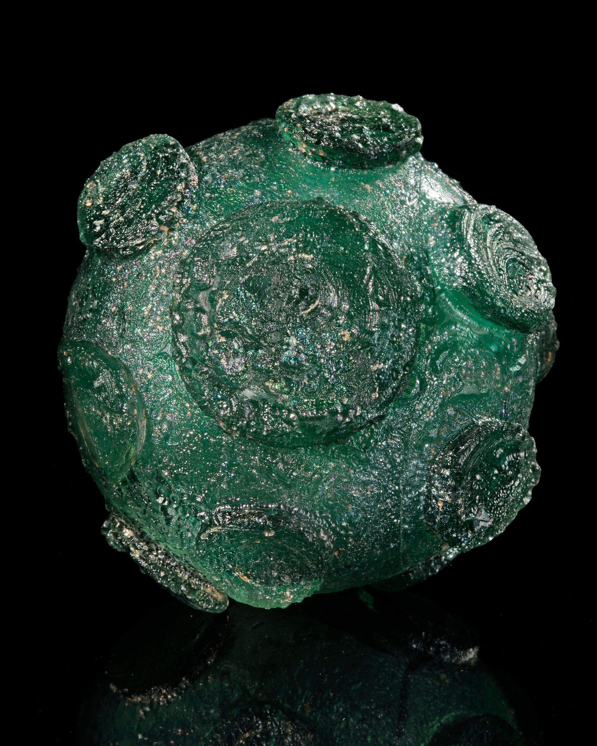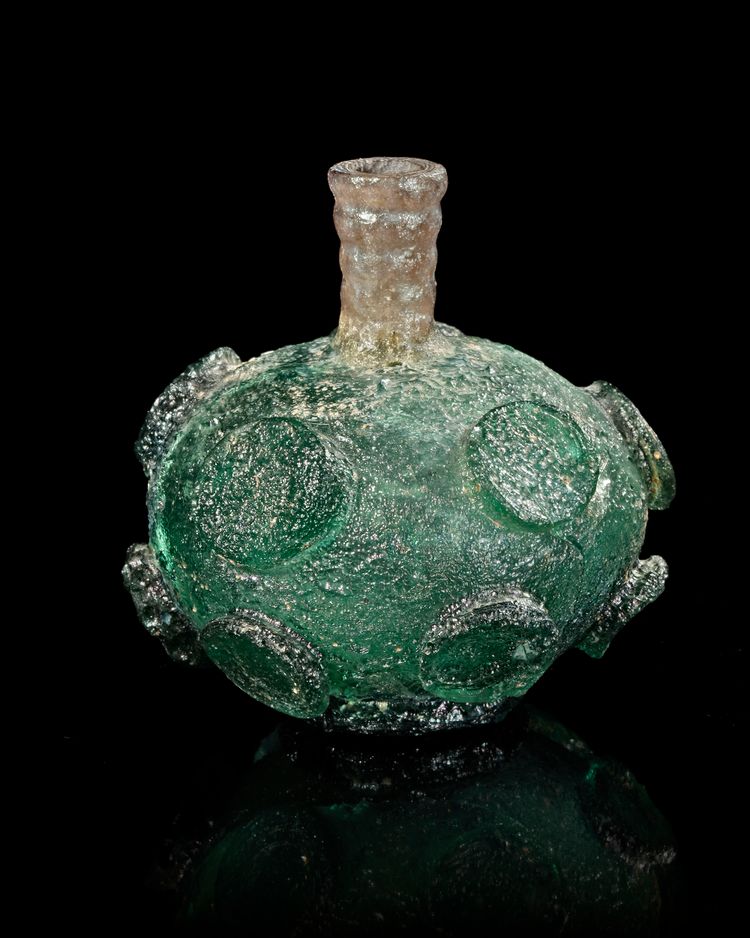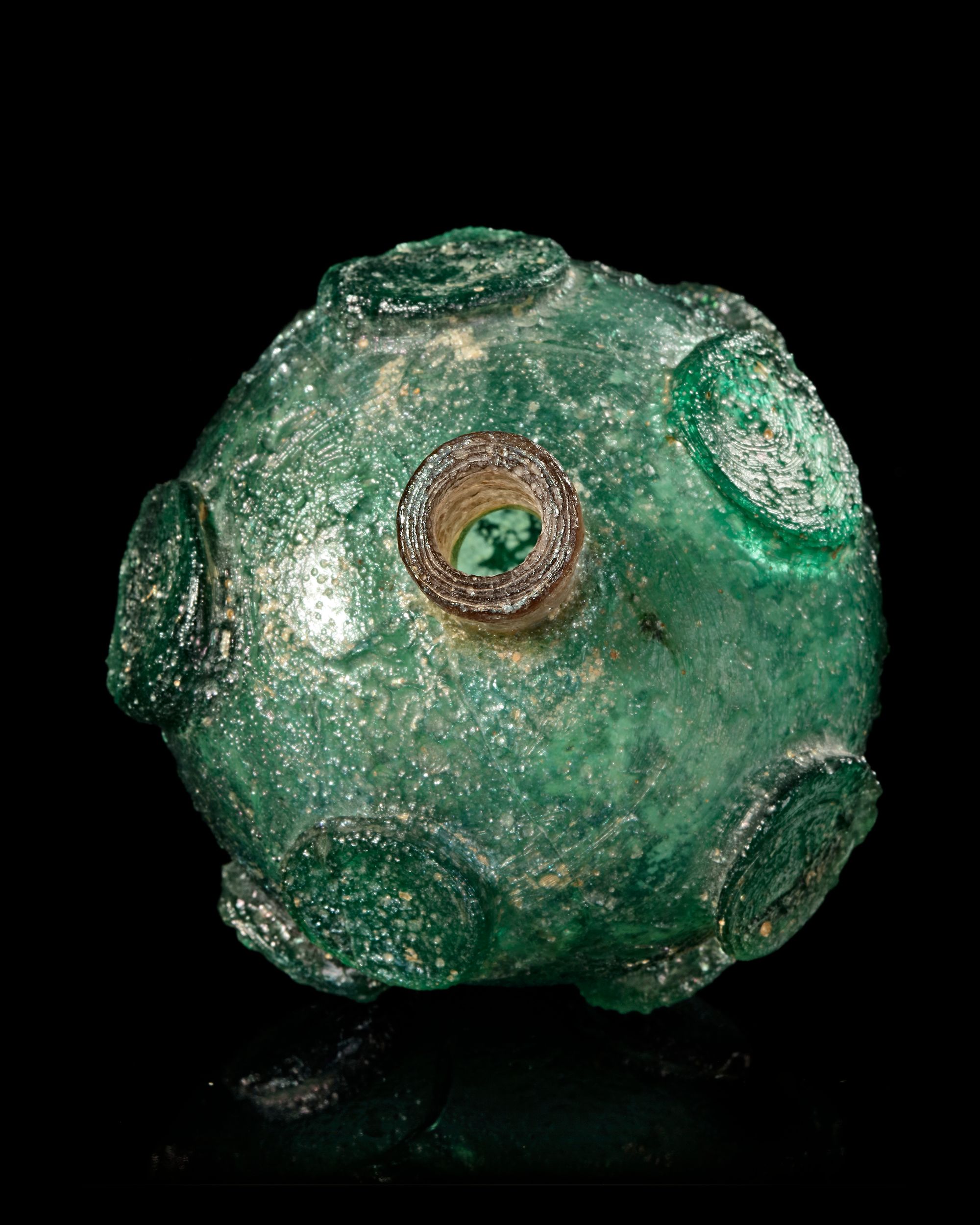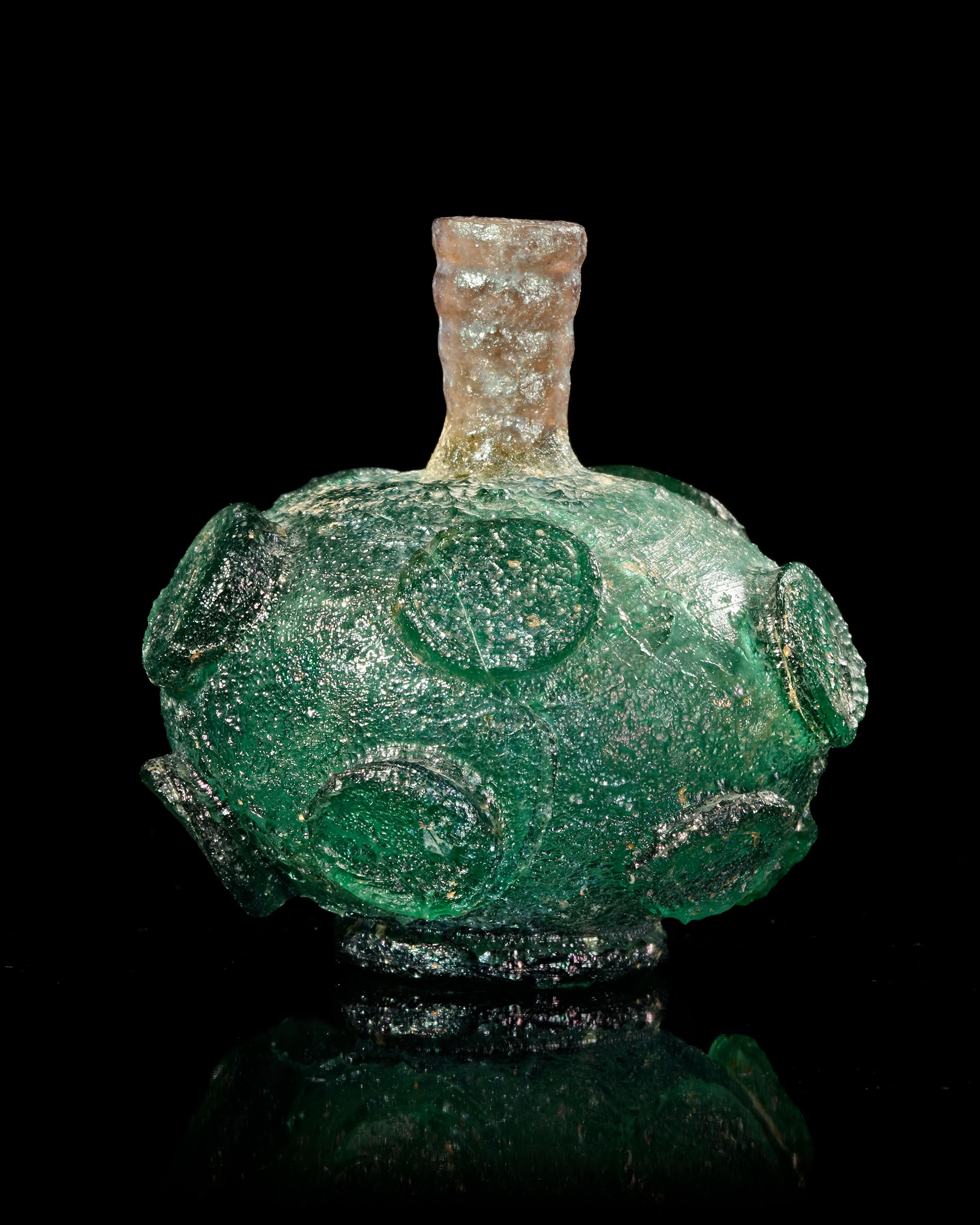 A rare and finely crafted medieval Persian glass flask featuring a globular body adorned with applied circular medallions. The vessel displays a striking green hue with shimmering iridescence, a result of centuries of burial and chemical weathering. Its short cylindrical neck, tinted in warm amber tones, contrasts beautifully with the body.