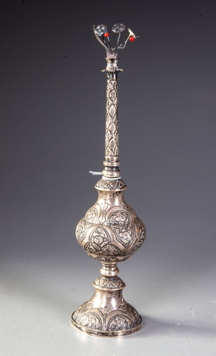 An Ottoman rosewater bottle consisting of a globular base, a long slender neck, and a decorative finial. The rounded base is decorated with repoussé floral and scrolling vegetal motifs arranged in symmetrical panels. From it rises a tall, narrow neck articulated by moulded rings and decorated with spiral, rope-like relief, which enhances the sense of height. The bottle is topped with a small finial of stylized leaf forms around a bud, echoing the floral decoration of the body and reinforcing its association with rosewater.
