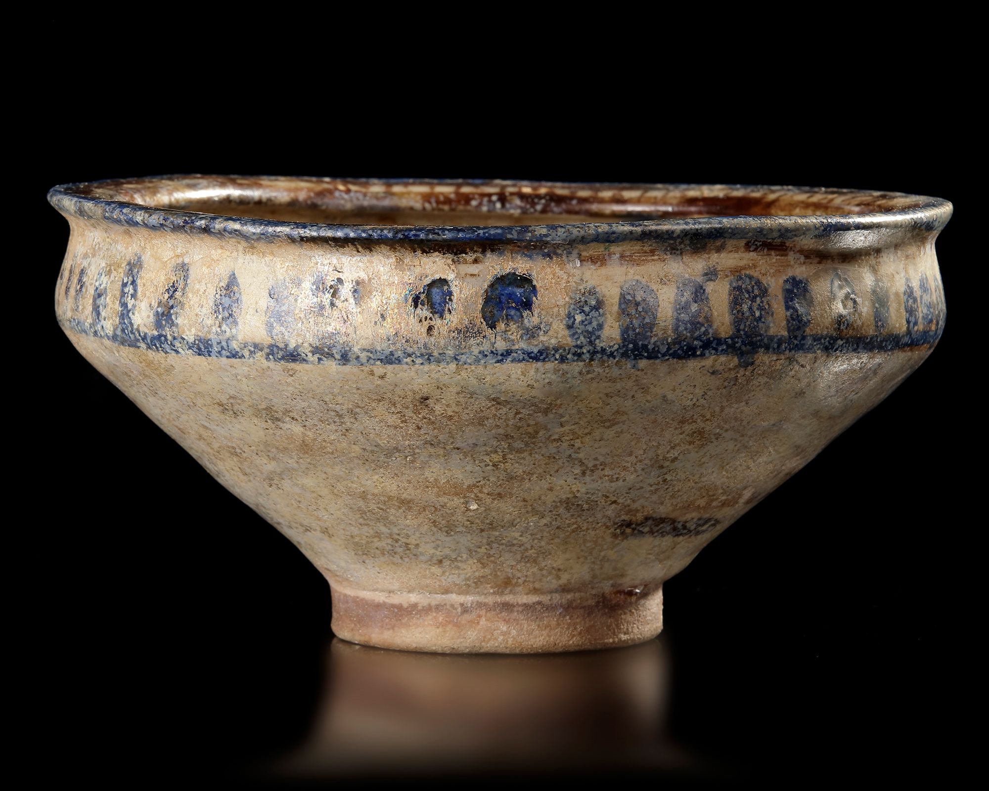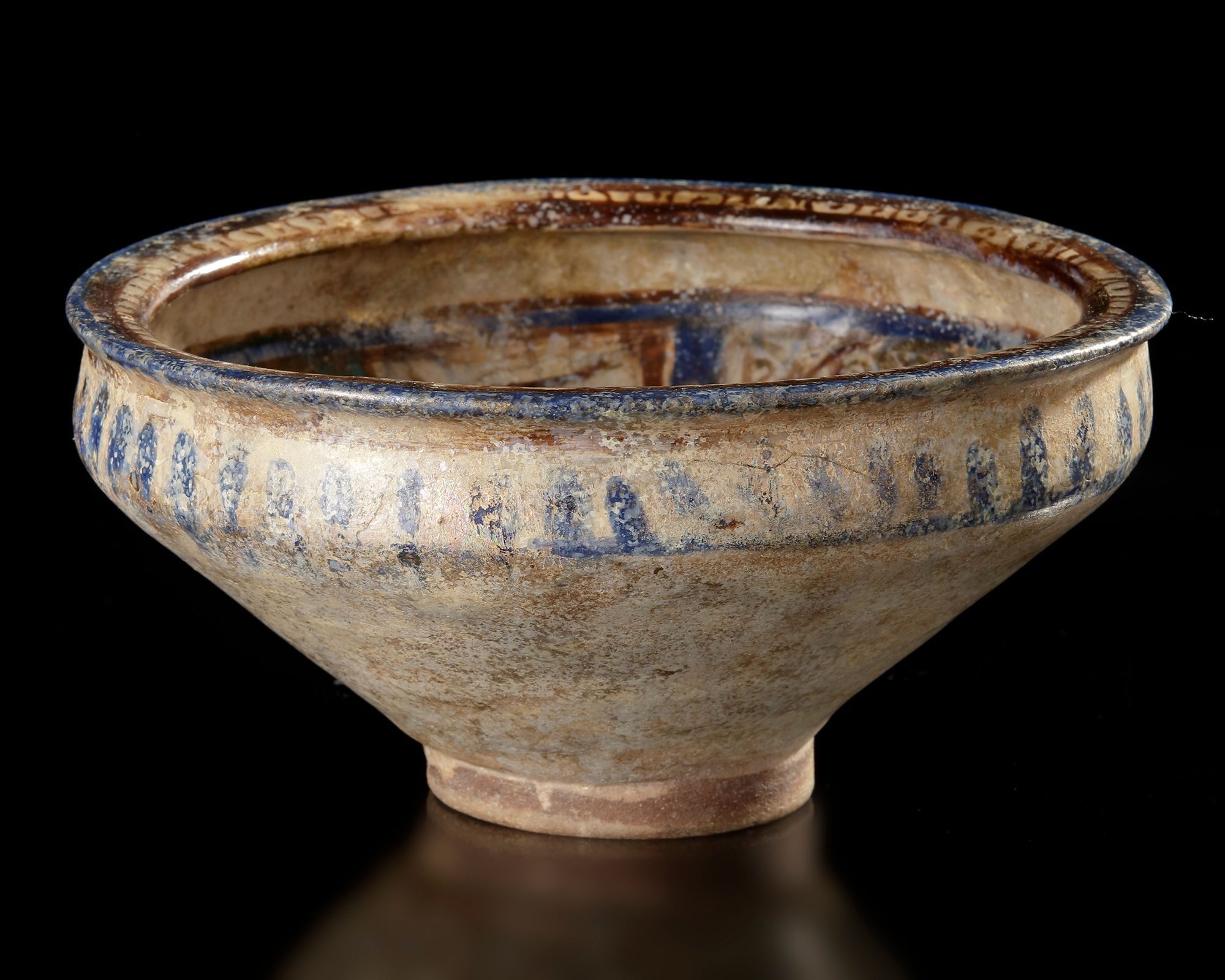 A Persian pottery bowl on a small foot ring with gently flaring sides and a slightly thickened rim. The interior is organized in a radial composition of wedge-shaped panels converging at the center, divided by turquoise and cobalt-blue bands. The segments alternate between stylized Arabic calligraphy and scrolling vegetal ornament, framed by a narrow calligraphic band beneath the rim. The exterior is sparsely decorated with a frieze of repeating blue arch-like motifs below the lip. Diameter: 19 cm.
