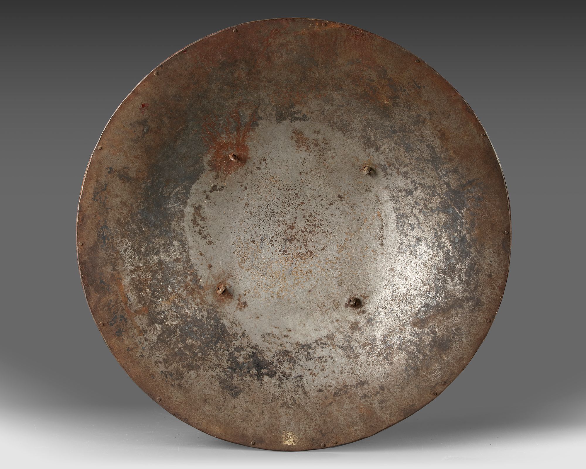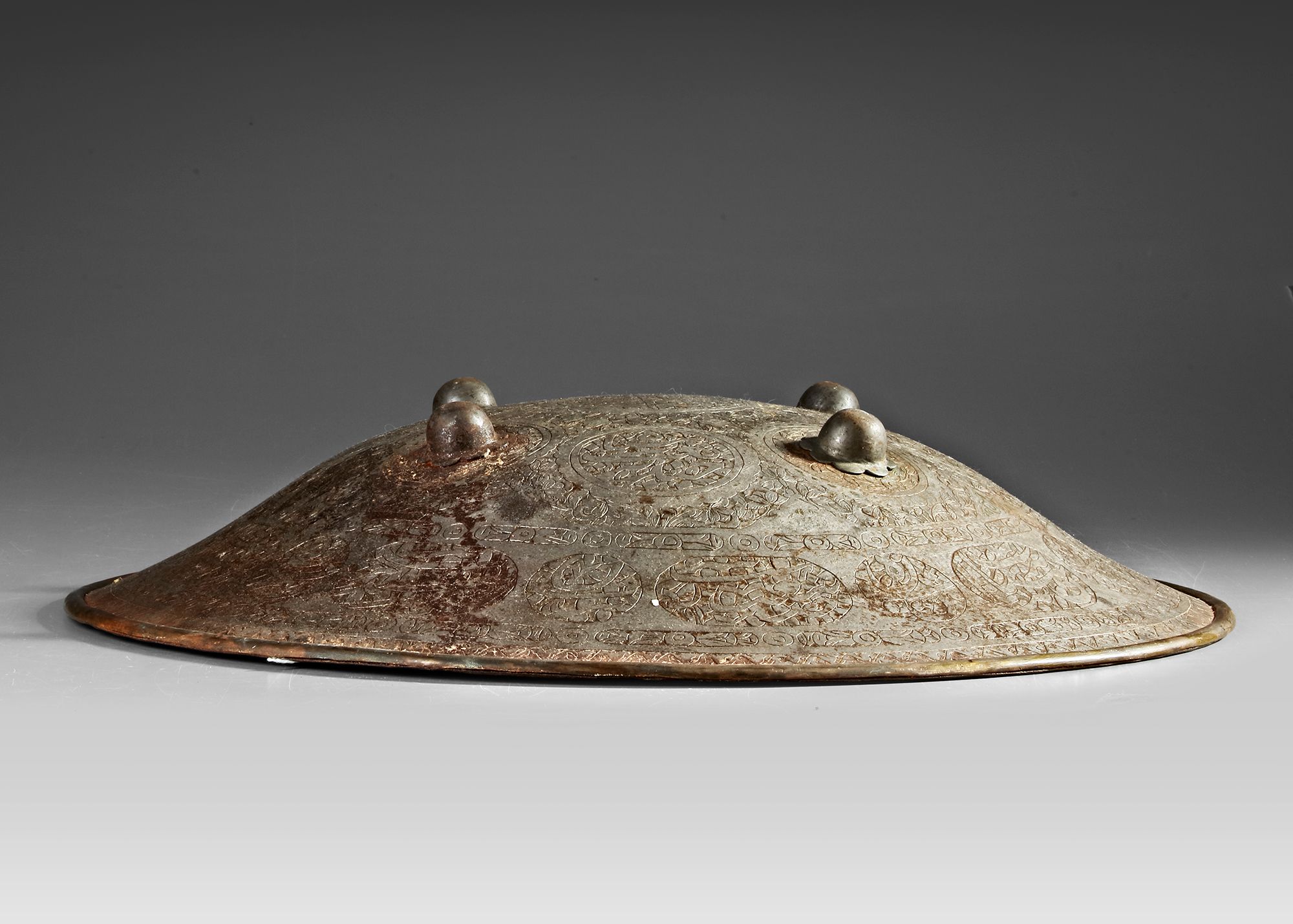 The shield with four applied gilt decorated bronze bosses, the finely carved decoration with a central roundel with cartouches and roundels filled with floral leafy sprays and Persian inscriptions, surrounded by three diaper bands containing cartouches and roundels Persian inscriptions in large nastaliq script. Diameter: 50 cm.