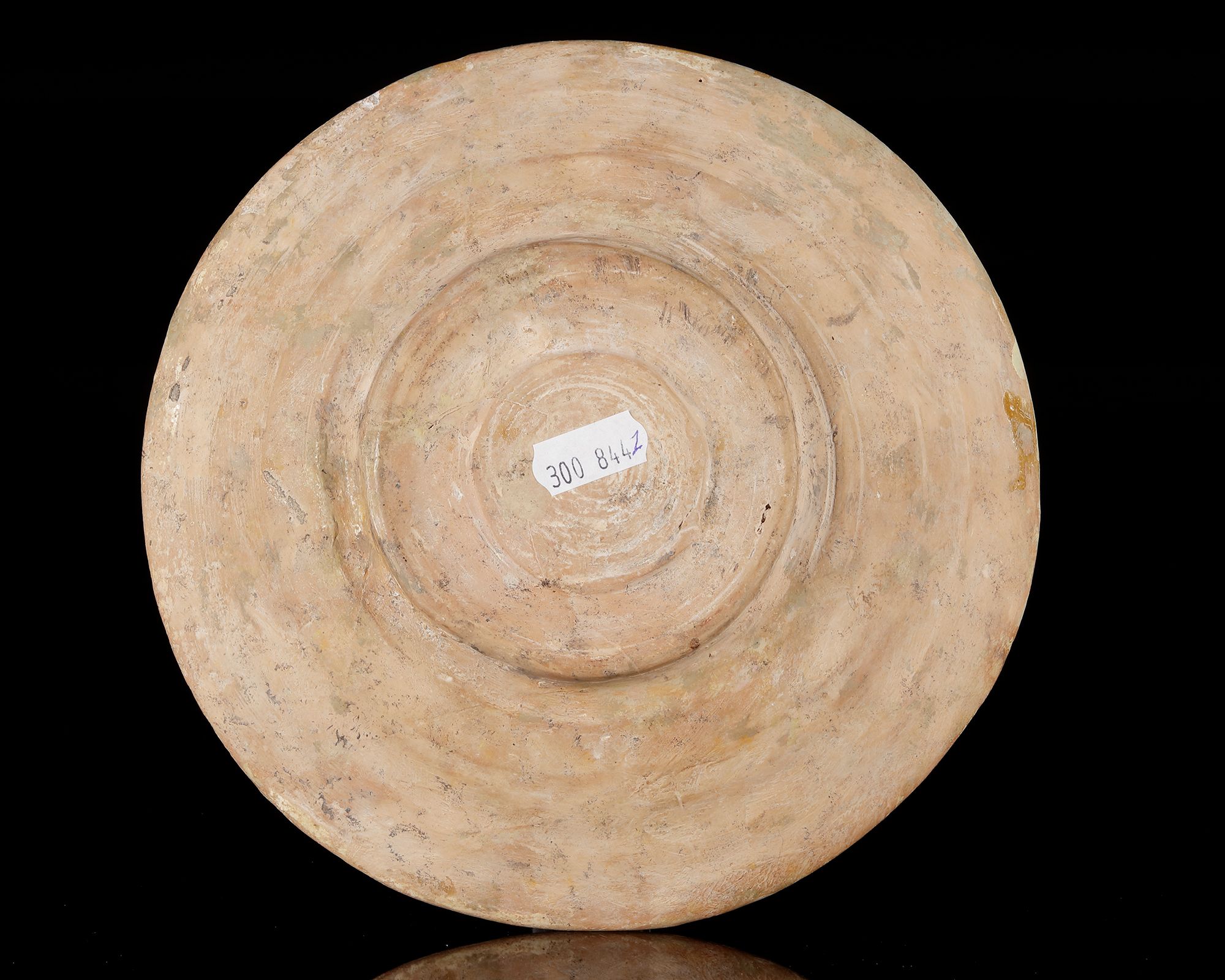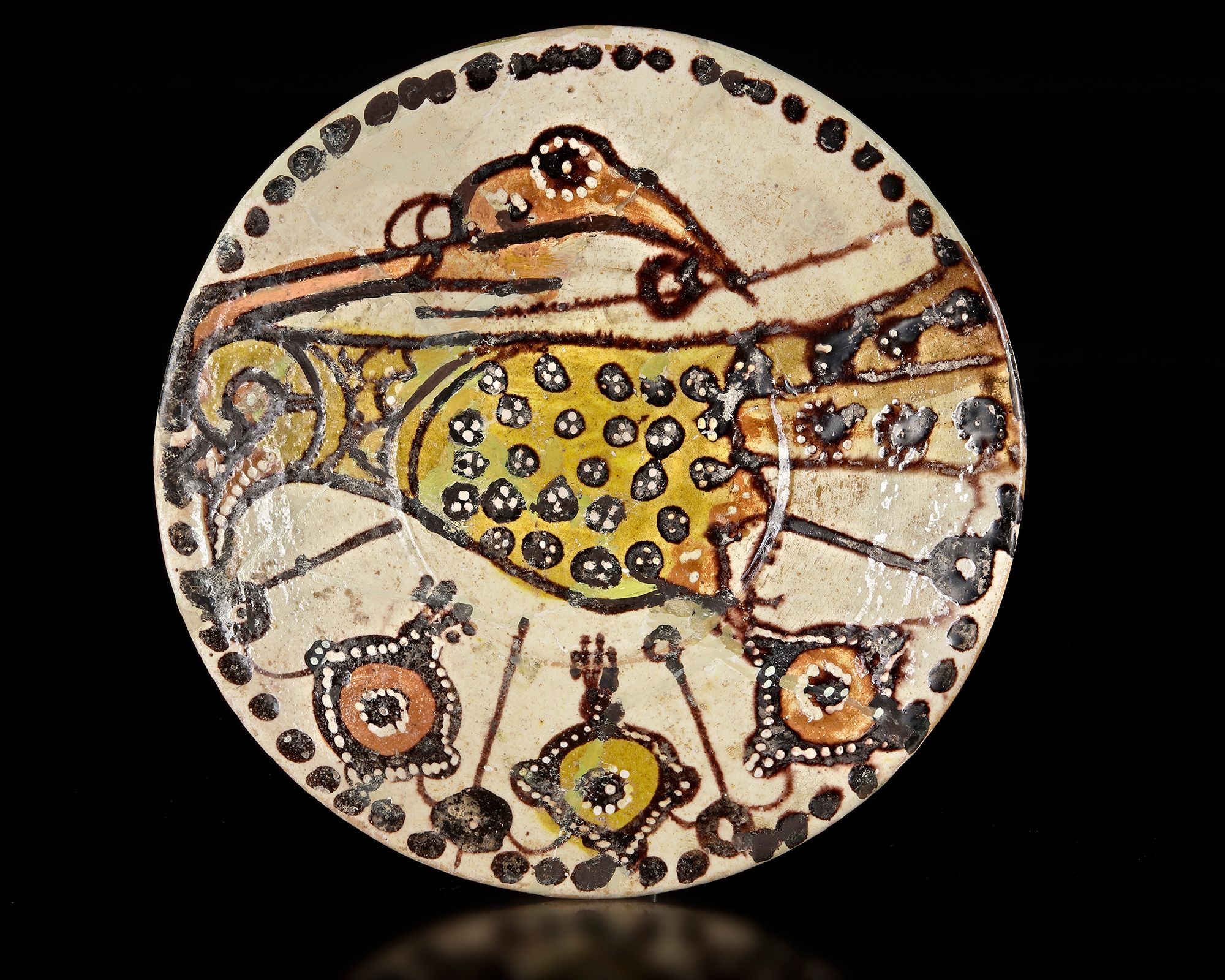 Of deep form, this earthenware bowl is coated with a white slip and decorated in black, red, and yellow staining slips beneath a transparent glaze. The interior features a large, stylized peacock with spotted wings stretching across the center of the vessel. The bird’s elongated neck and pointed beak extend toward the rim, while its body is filled with black circular spots over a yellow ground. Surrounding the central figure are radiating floral and geometric motifs rendered in black and red, each dotted with small white accents. A band of bold black circular markings lines the rim. Diameter: 20 cm.