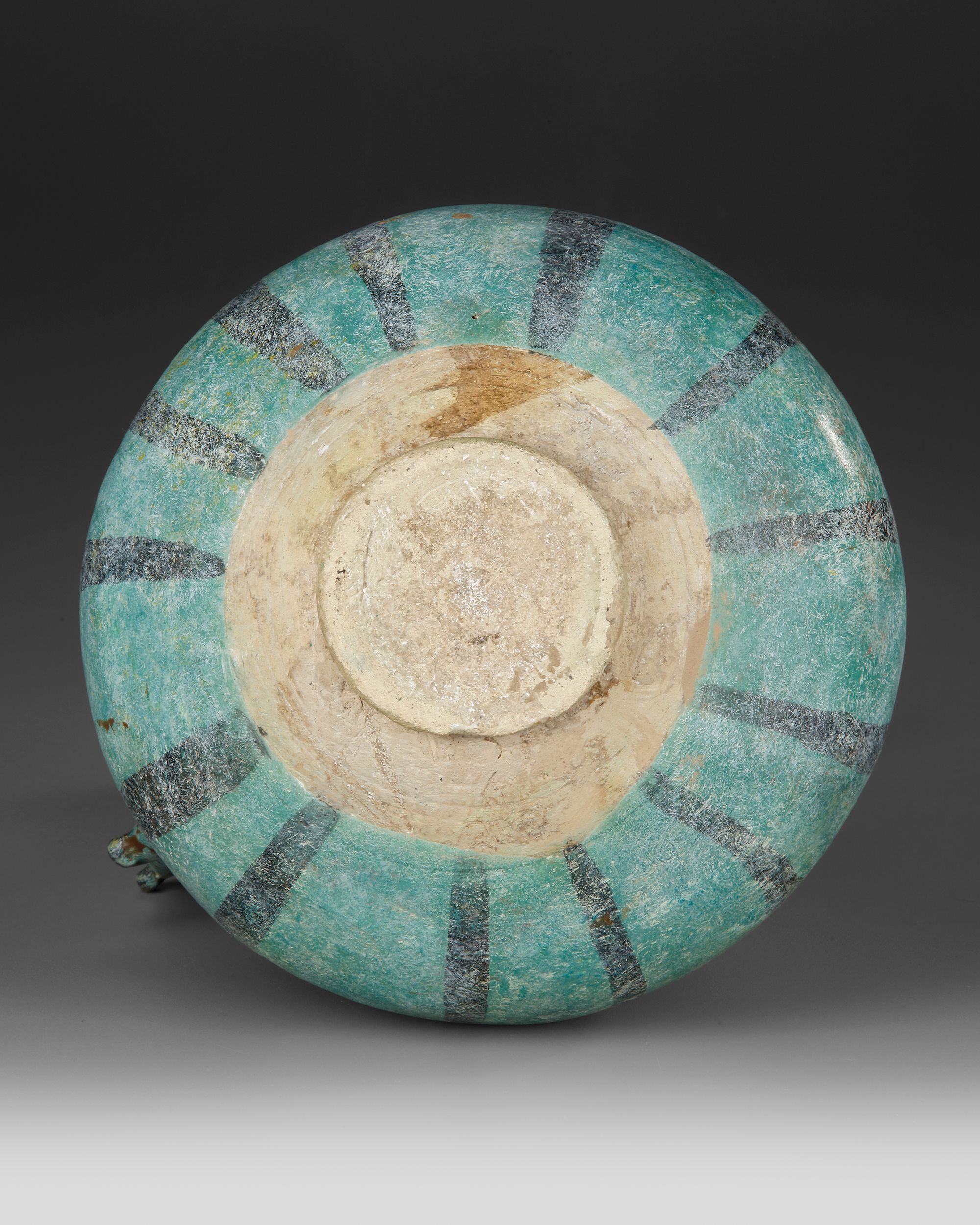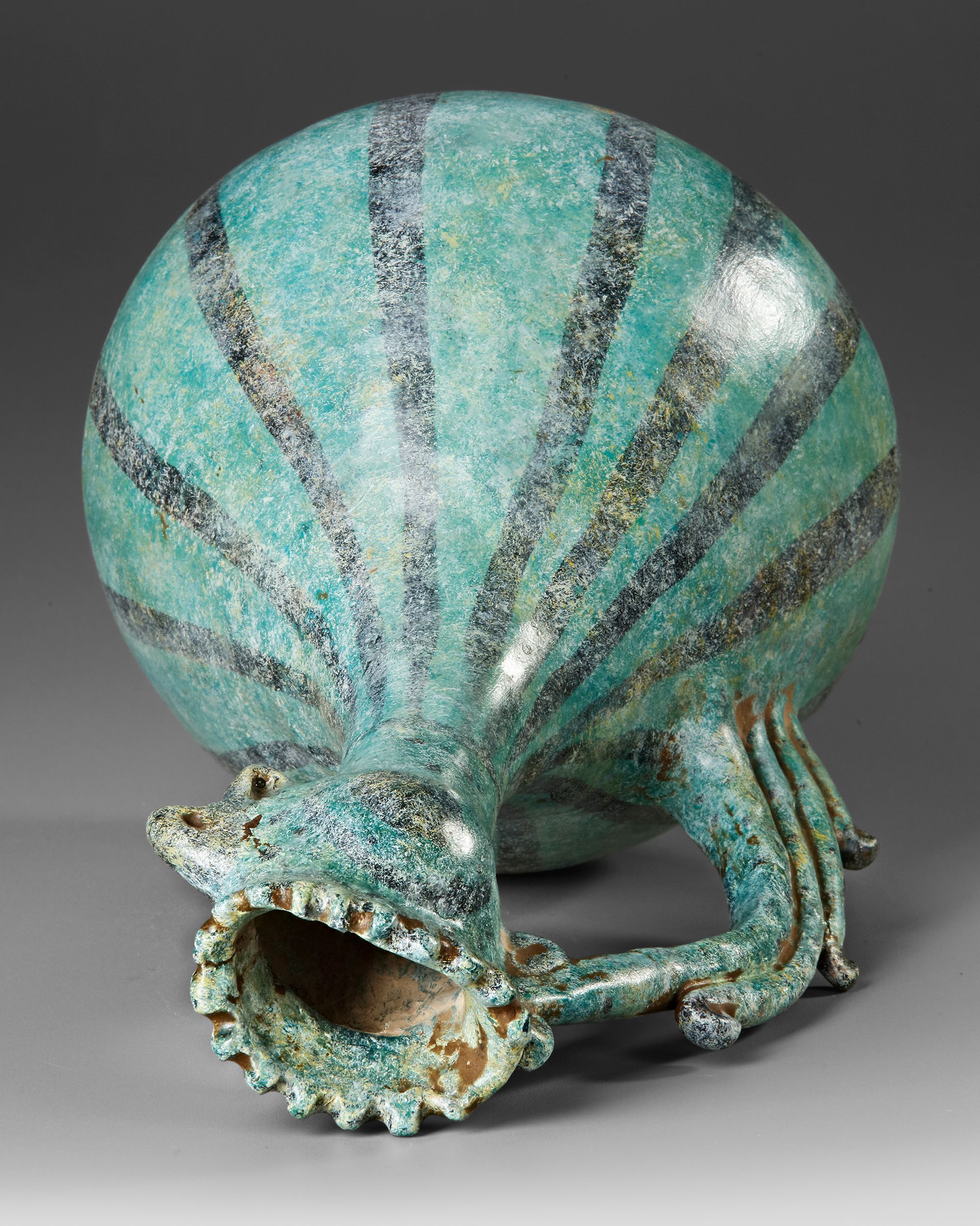 A pottery ewer with a spherical body and tubular neck, the mouth formed as a cockerel’s head with a flaring comb. The handle takes the form of a rising, tapering, curving tail. The vessel is covered with turquoise glaze and decorated with black lines tapering from the neck along the body to the base.