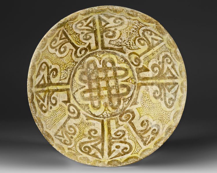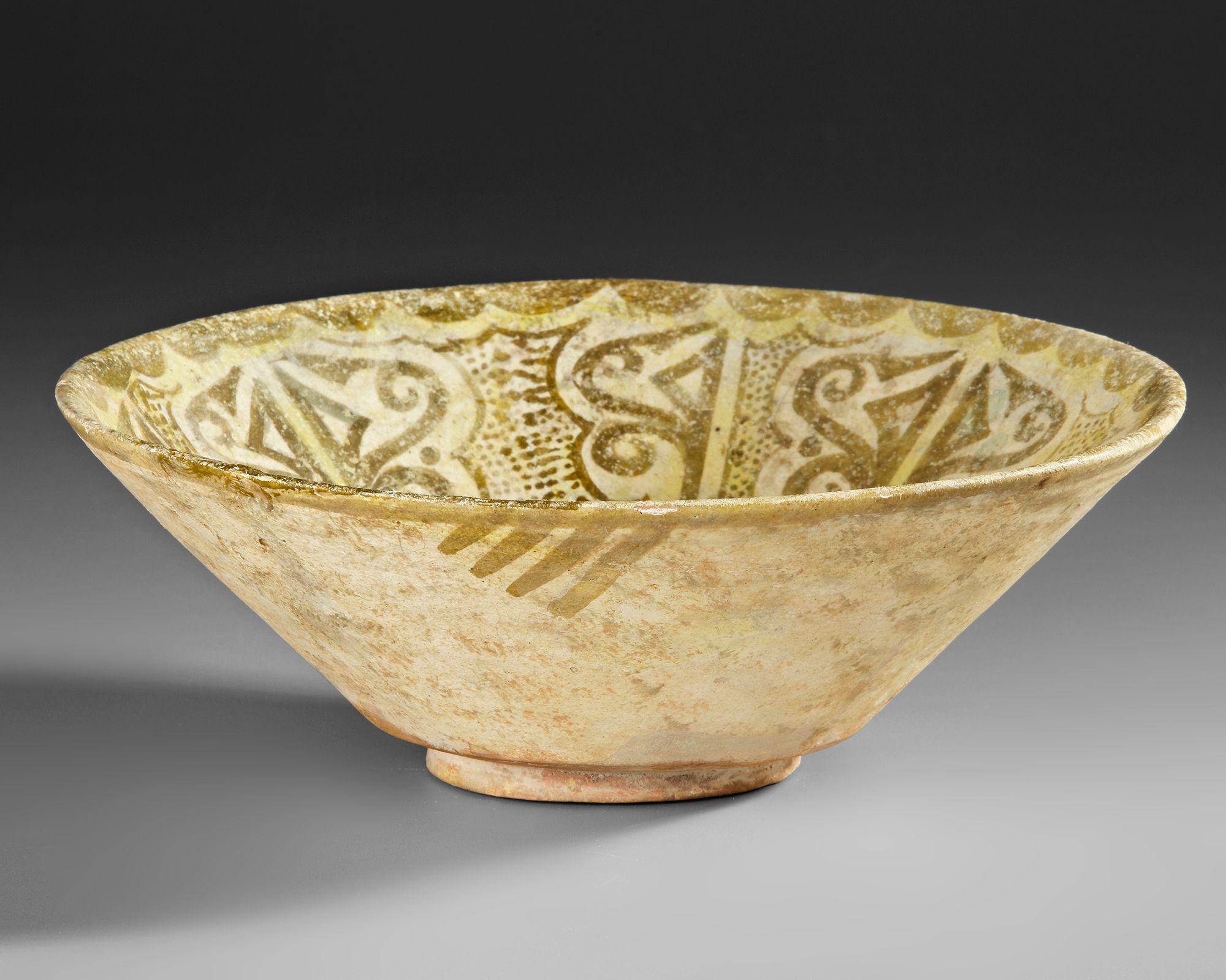 A refined Nishapur painted pottery bowl, elegantly shaped with a broad, shallow conical body and a neatly defined foot ring. The interior is animated by a harmonious radial composition of stylized, Kufic-inspired motifs, triangular forms, scrolling elements, and dotted textures, encircling a central medallion, rendered in earthy brown and olive tones against a creamy slip ground. The exterior remains largely plain, enhancing the contrast between its restrained form and richly decorated interior.