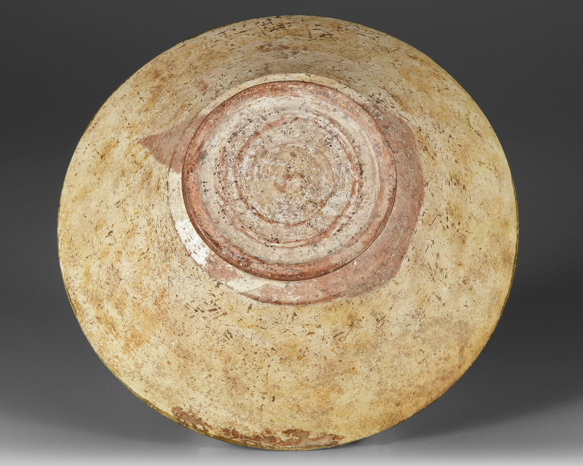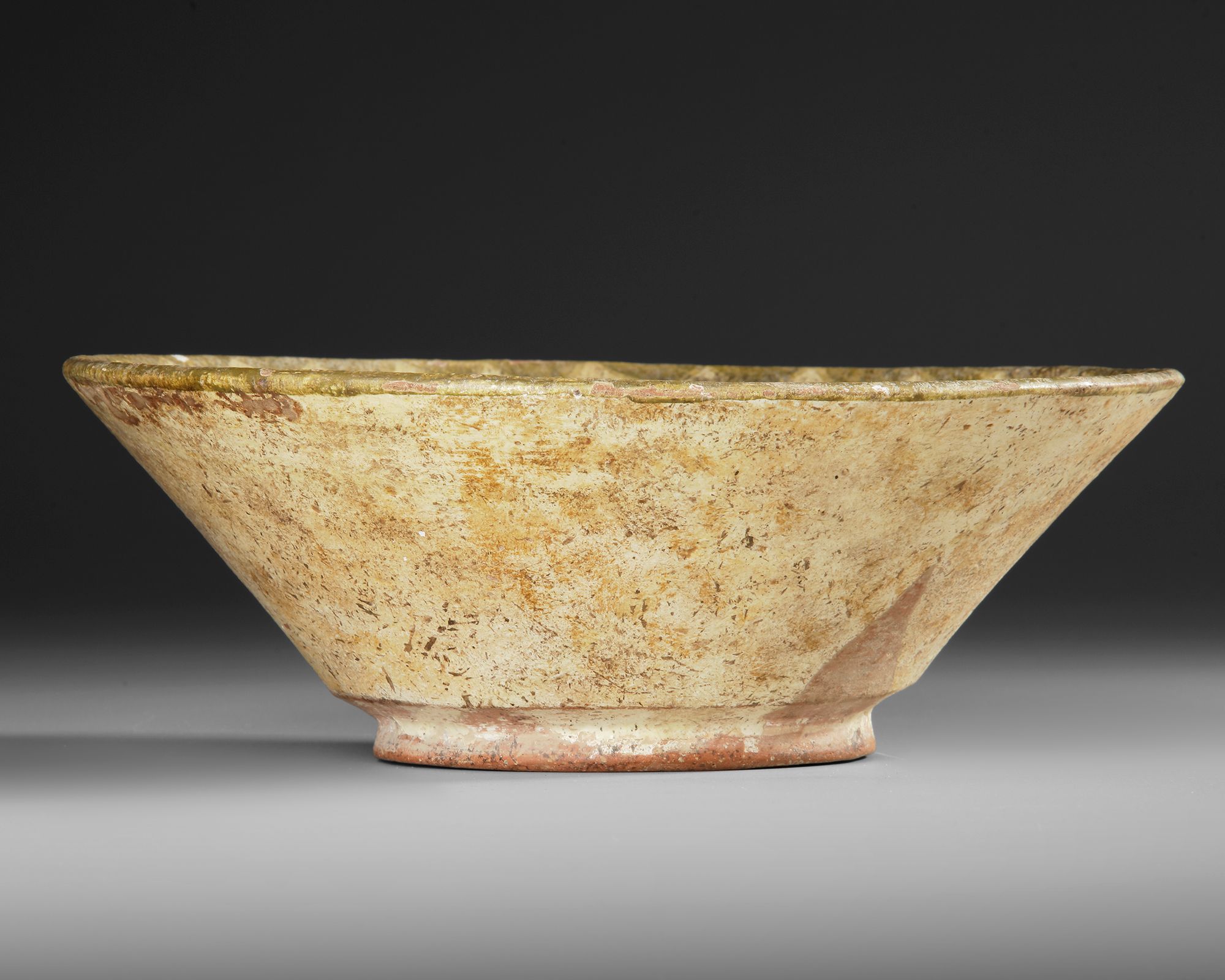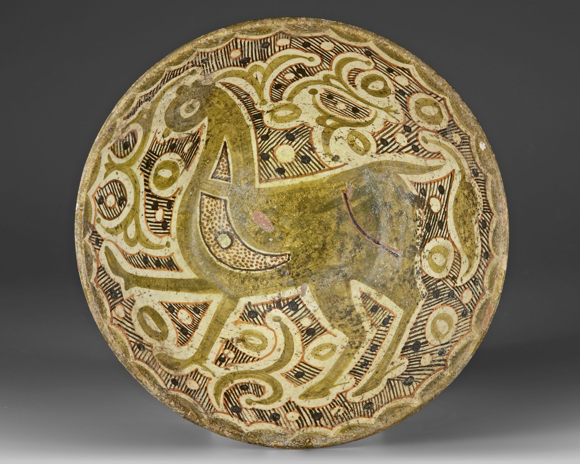 A Nishapur slip-painted pottery bowl of shallow, flaring form on a low foot, the buff slip ground decorated in olive green, brown, and black pigments. The interior centers on a stylized quadruped rendered in bold, fluid brushwork, surrounded by dense scrolls, dots, and hatched motifs beneath a patterned rim band. The exterior remains largely plain. The lively surface decoration evokes the effect of lustreware.