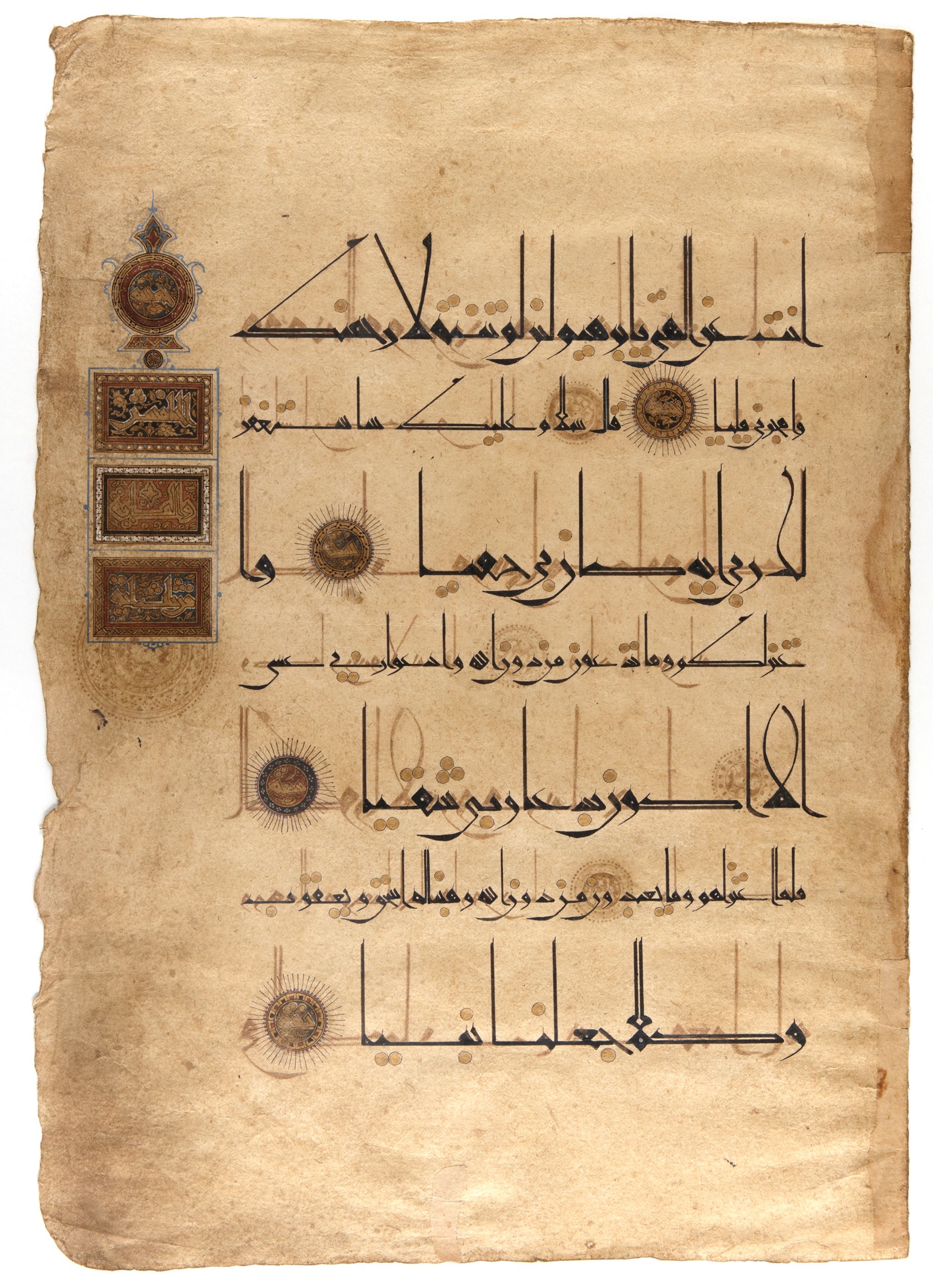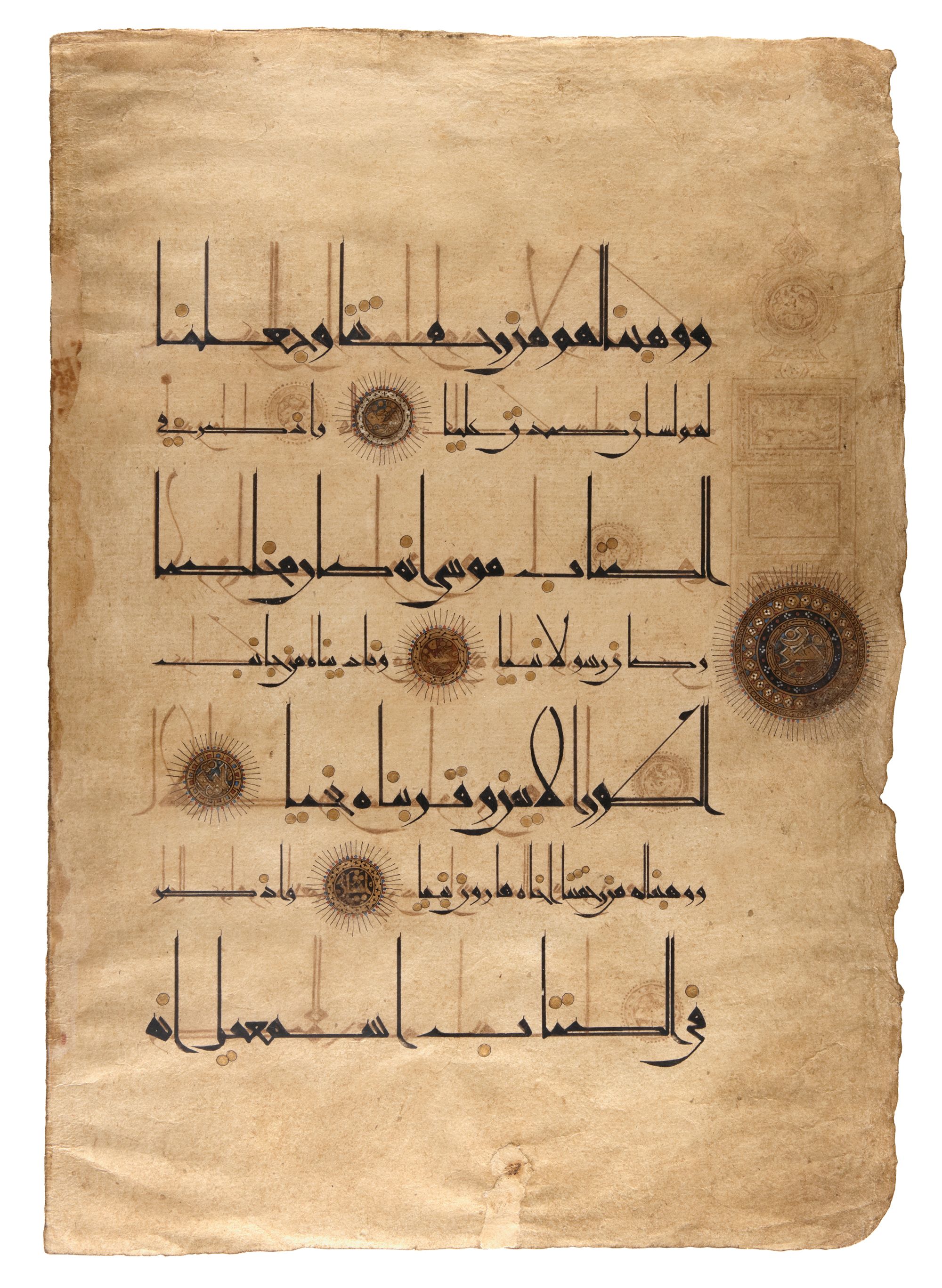 Arabic manuscript on paper, 7 lines to the page, written in elegant Eastern Kufic in black ink. Diacritical marks rendered as gold dots outlined in black. Verses separated by finely executed gold rosettes with blue and red detailing. Larger illuminated devices mark the khams and ‘ashr, while the margins bear richly decorated medallions indicating juz’ divisions. The composition is distinguished by elongated verticals and measured spacing, characteristic of the Eastern Kufic tradition. A refined example of early Islamic calligraphy, combining clarity of script with restrained yet luminous ornamentation. Inscriptions: v.46 till v.54 from surah Maryam 33.5 by 47 cm