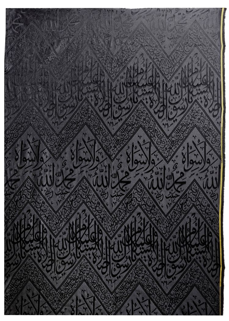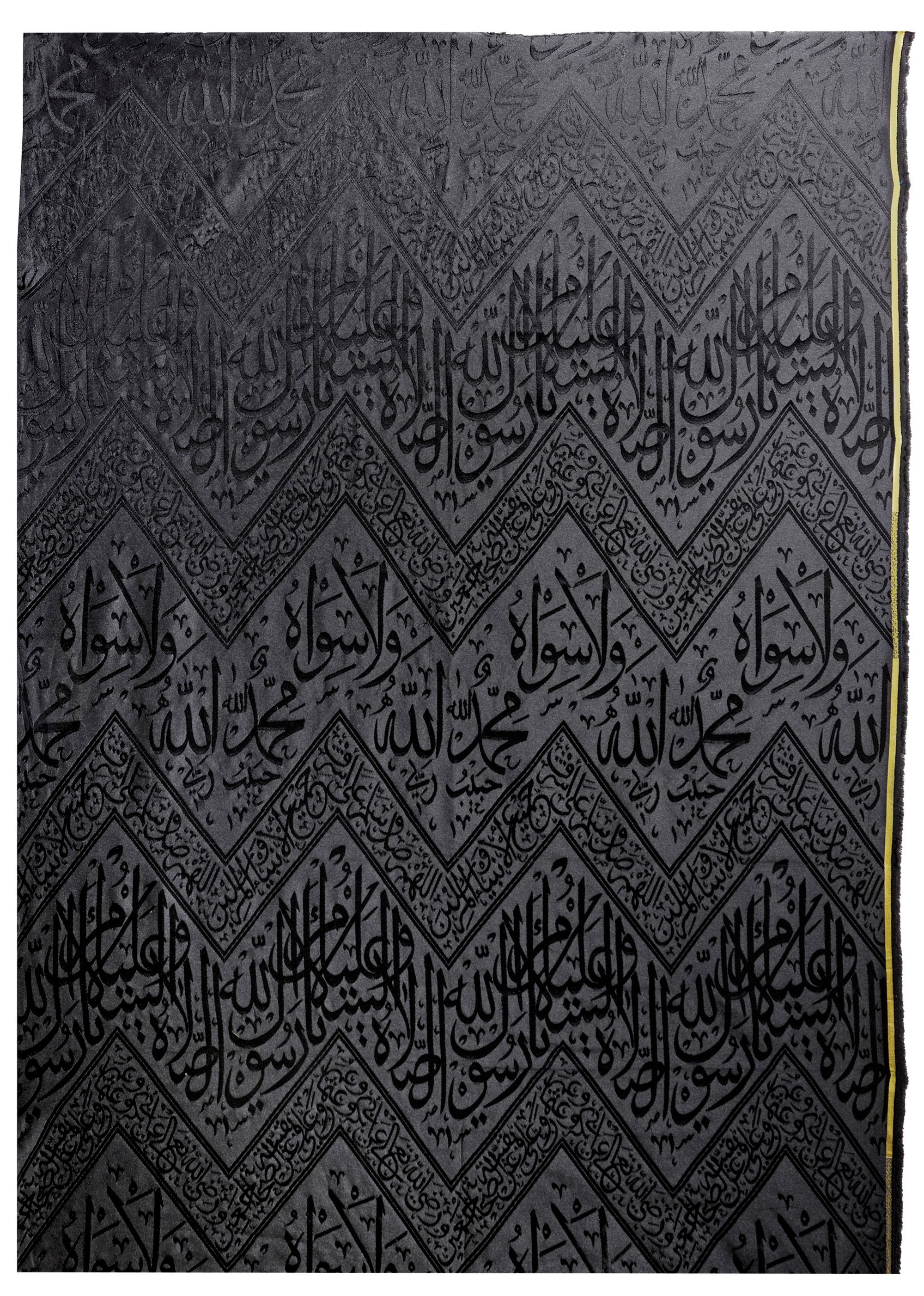A fragment of the inner curtain of sacred kiswa for the inner wall of the Kabaa with an inscribed weave in silver-colored silk over a dark black ground. Embellished with a prominent inscription within a broad border in thuluth script of praise of the prophet ‘Prayer and peace be upon you, O Messenger of Allah’. Below with a narrow band containing prayers for the four righteous caliphs Abu Bakr, ‘Umar, ‘Uthman and ‘Ali as well as for the companions of the Prophet. At the top with a narrow band enclosing ‘O Allah, bless the Prophet Muhammad, the Seal of Prophets and Messengers.