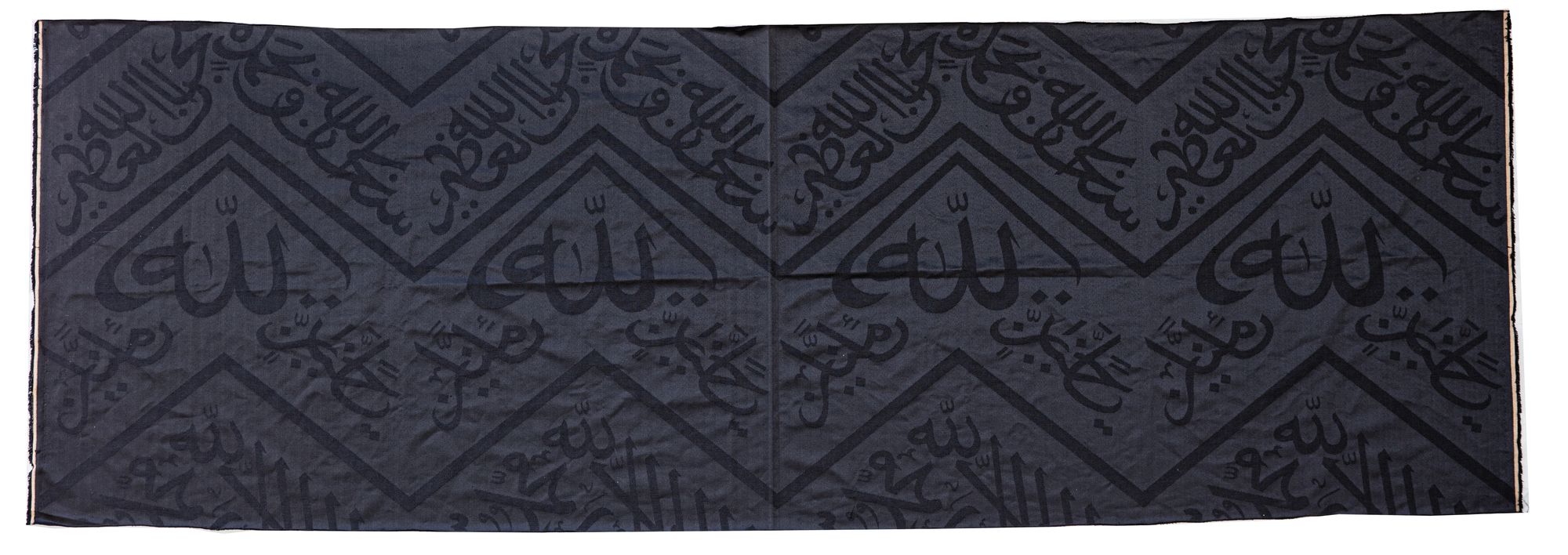 A fragment of the outer curtain of the sacred Kiswa for the outer wall of the Kaaba, featuring an inscribed weave over a deep black ground. It is embellished with undulating bands running from the beginning to the end of the cloth, enclosing various inscriptions. Inscriptions (in large Thuluth script): Kalimat al-Tawhid. “O Allah, O Most Compassionate (Al-Hannan), O Most Generous/Bestower (Al-Mannan)”. “Glory be to Allah and praise be to Him; glory be to Allah, the Most Great”. Dimensions: 100 × 292 cm