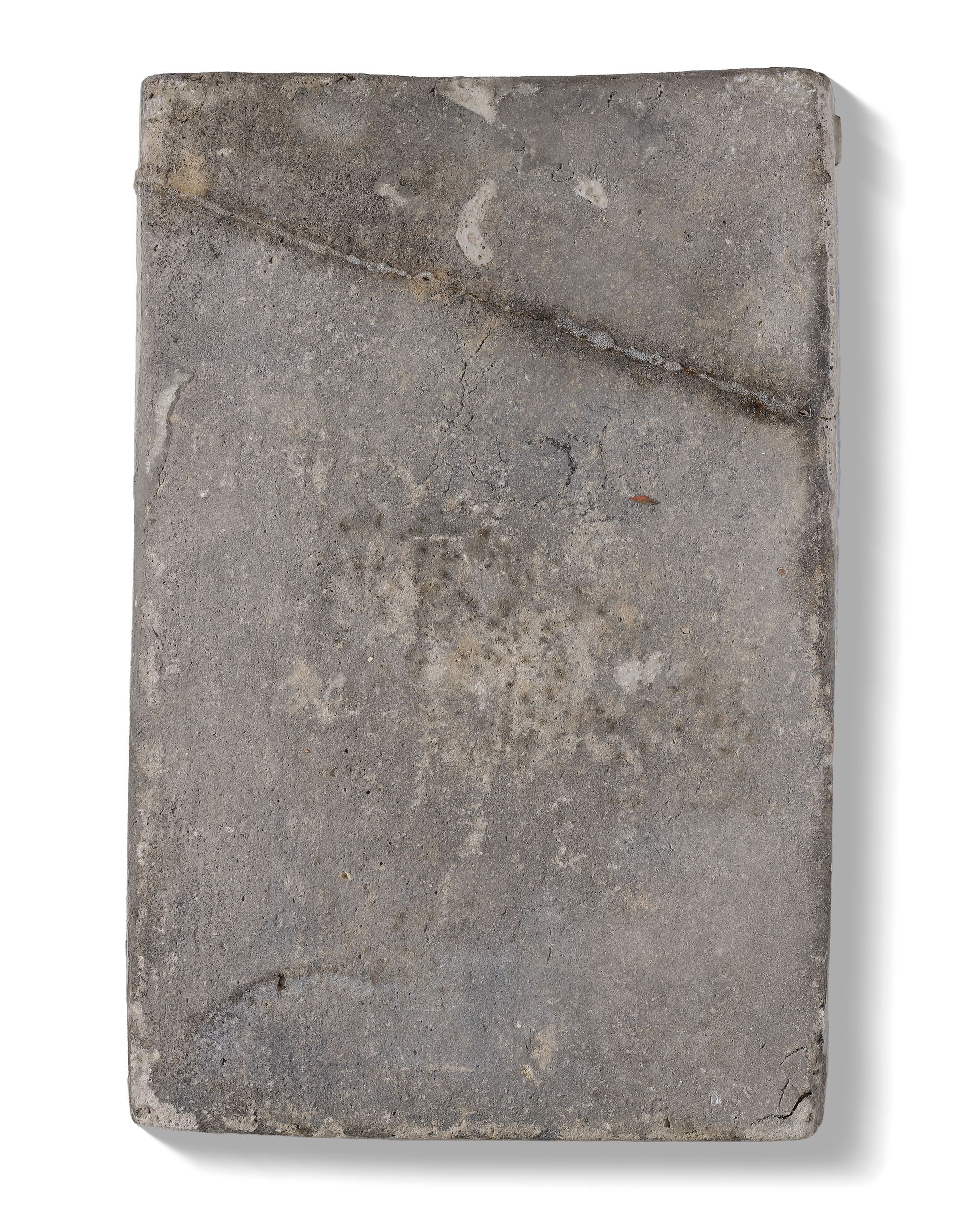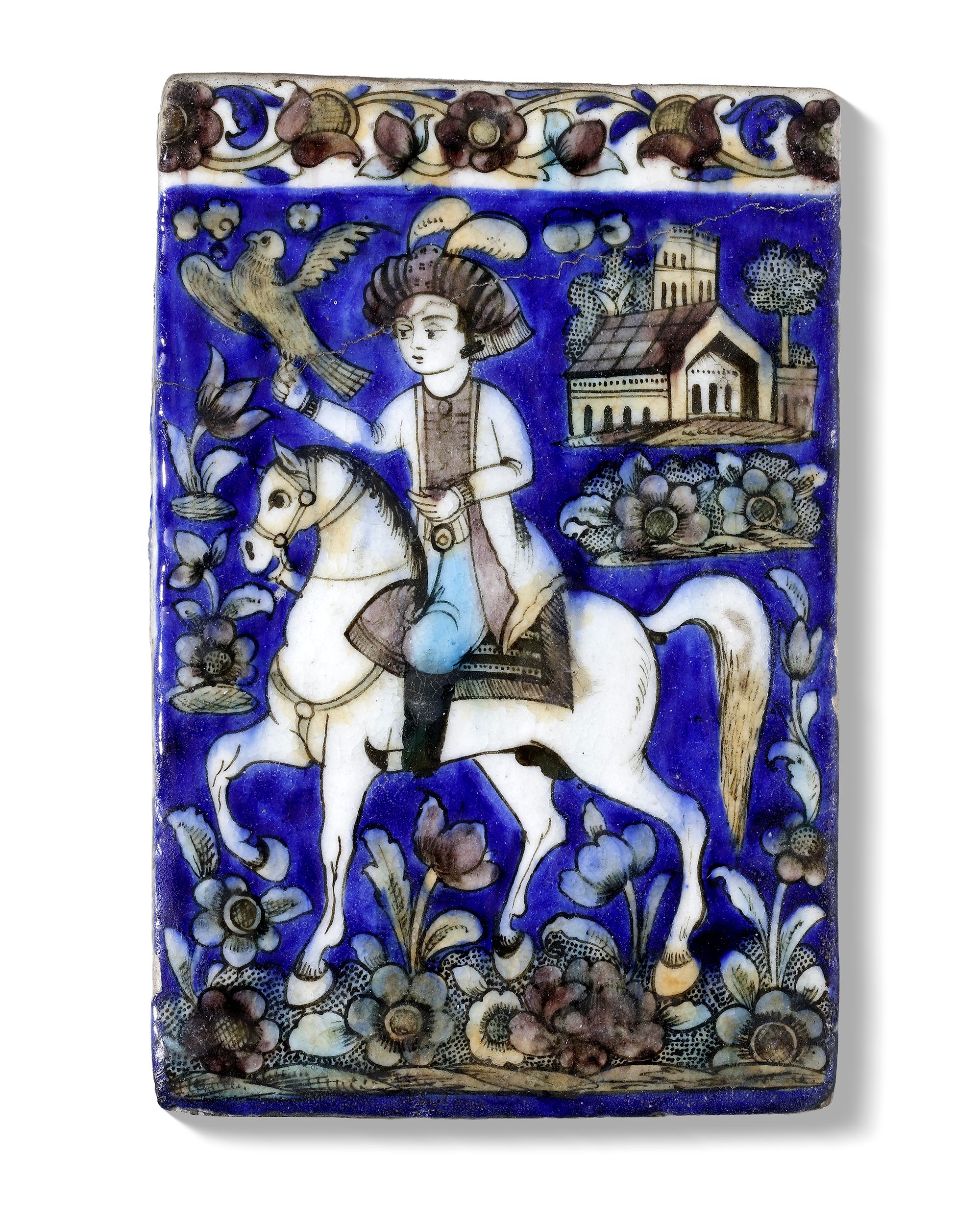 A finely painted Qajar Persian tile, decorated in underglaze blue, turquoise, and green, depicting a youthful falconer riding a white horse within a stylized landscape. Set against a rich cobalt-blue ground, the figure—rendered in a delicate miniature style—is surrounded by dense floral motifs, small birds, and a charming architectural vignette, all framed by a scrolling floral borde Tile: 14 by 19 cm.
