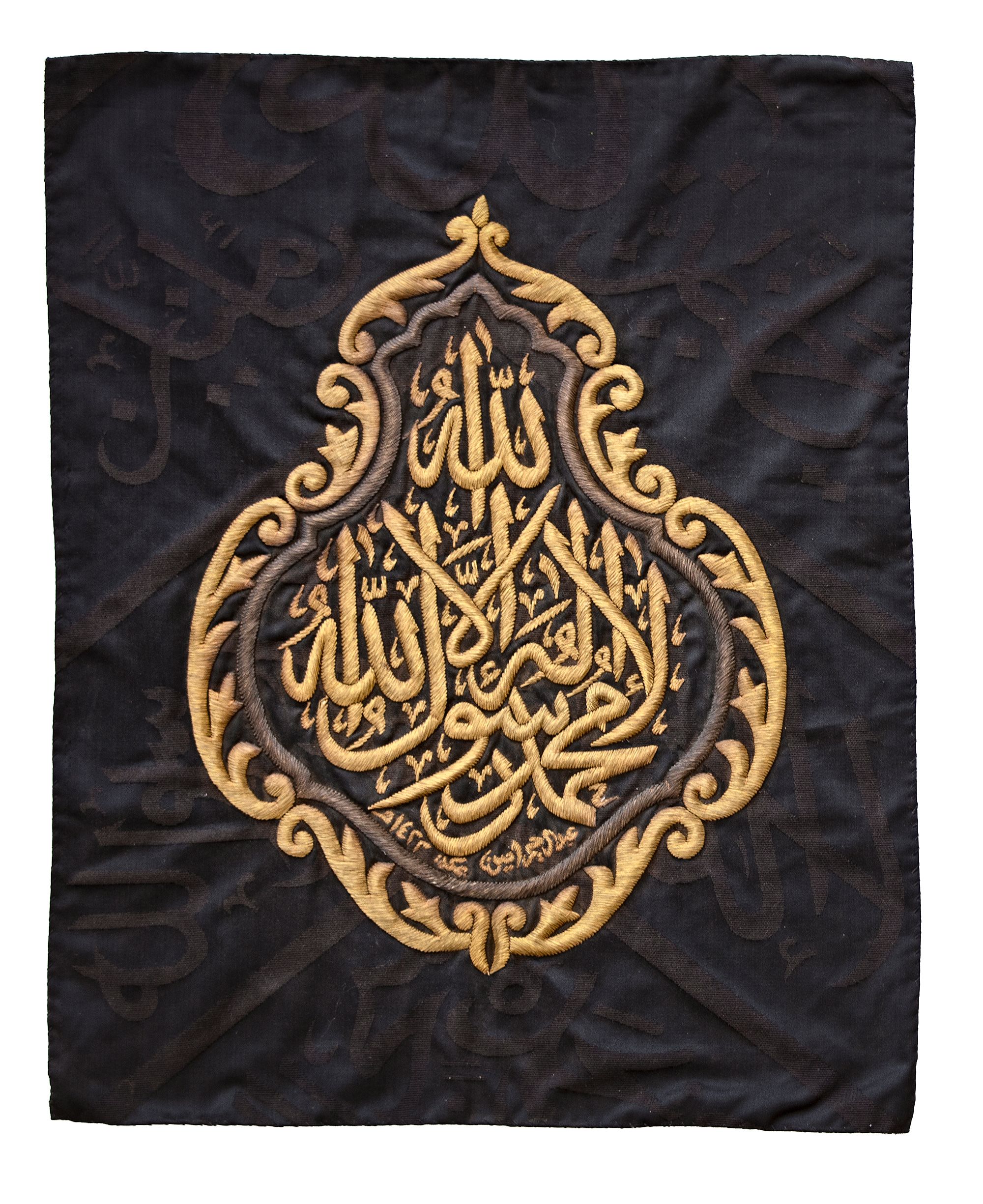 Of rectangular form, embroidered in gilt and silver metal thread on a black silk ground, this panel features a central cartouche inscribed in thuluth script, surrounded by intricate arabesque motifs. Dimensions: 69 by 85 cm Inscriptions: ( Al-Shahadah/ Kalimaat al-Tawhid)