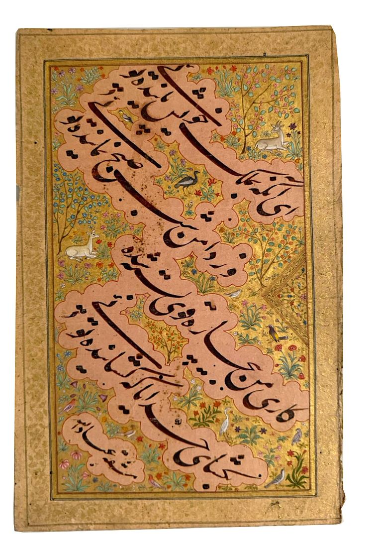 Ink and gold on paper, the composition features four lines of elegant black nastaʿlīq calligraphy arranged diagonally across the page. Each line rests within softly contoured cloud bands. The luminous gold ground is intricately adorned with delicate scrolling palmettes and floral motifs, interspersed with small birds and seated deer, creating a rich ornamental backdrop that contrasts beautifully with the bold, fluid script. The whole is framed by a narrow gilt border and signed in the lower left corner. 27 by 17 cm.