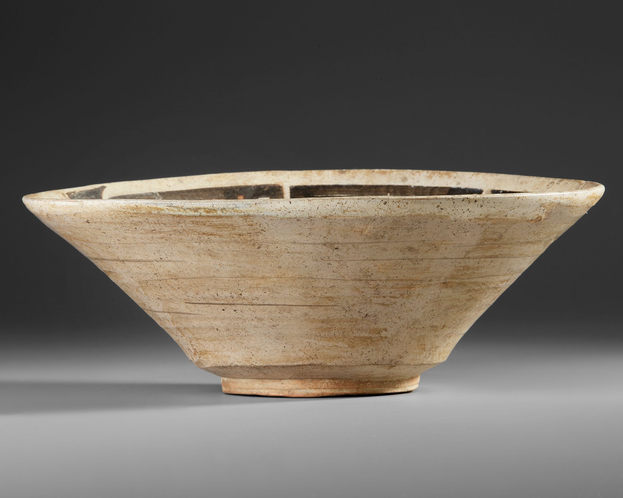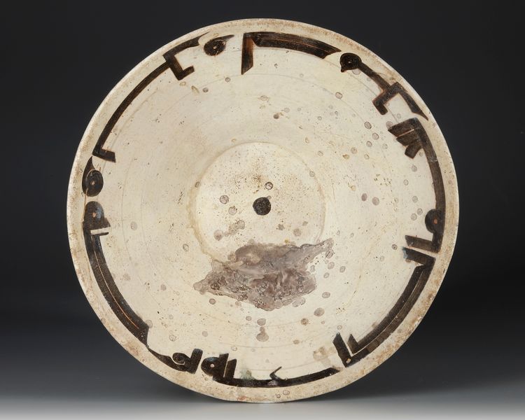 Of broad, conical form rising from a short foot to a gently flaring rim, the bowl covered in a creamy white slip and decorated to the interior with a bold band of stylized Kufic calligraphy in dark brown slip, encircling a plain well. The exterior left unadorned, with visible turning rings. The surface with characteristic firing speckling and areas of wear consistent with age. Height: 10.5 cm Diameter: 30.5 cm
