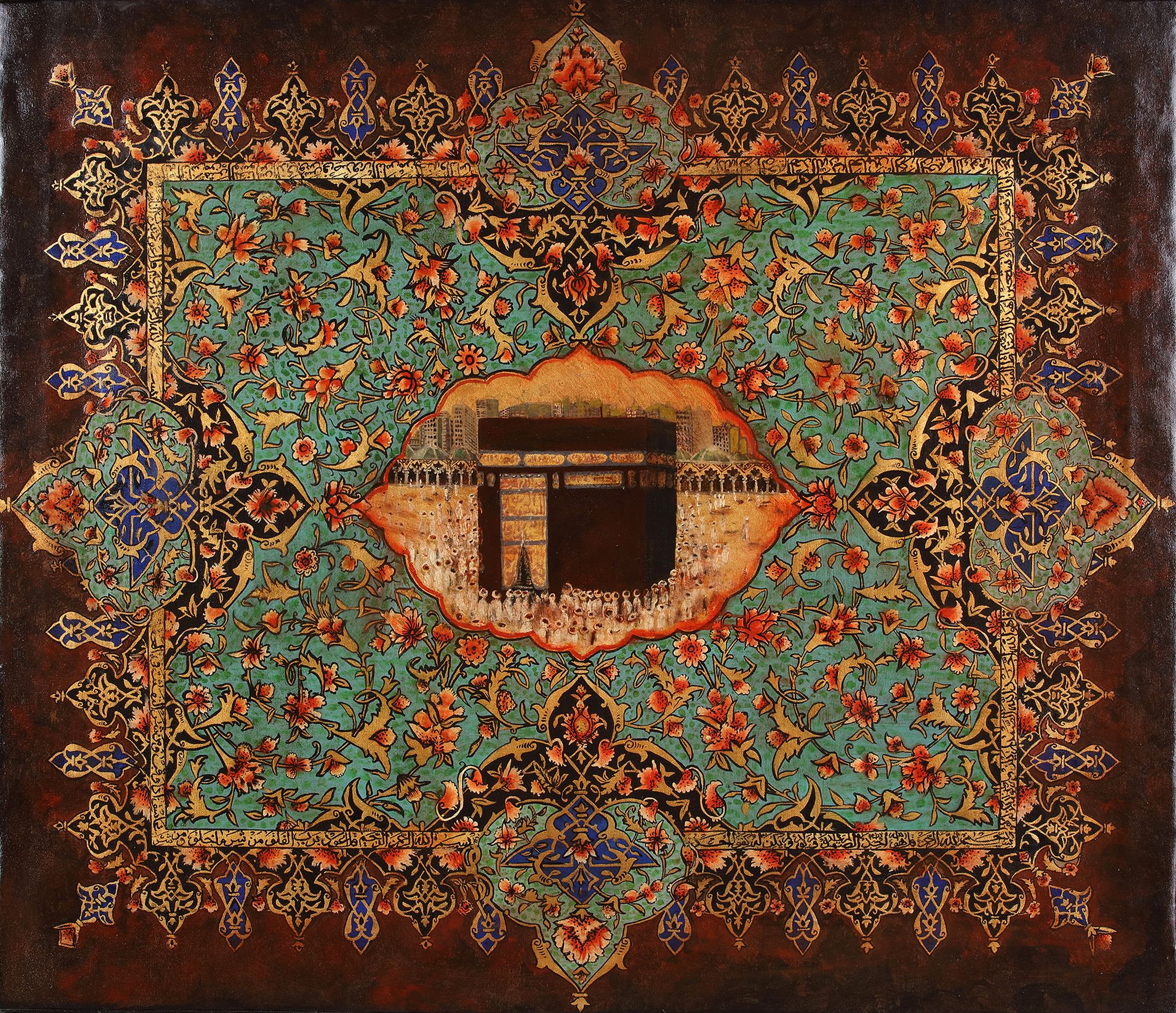 Surrounded by a dense design of flowers and foliage on a turquoise ground with a narrow band enclosing Quran verses with laterns containing floral designs.