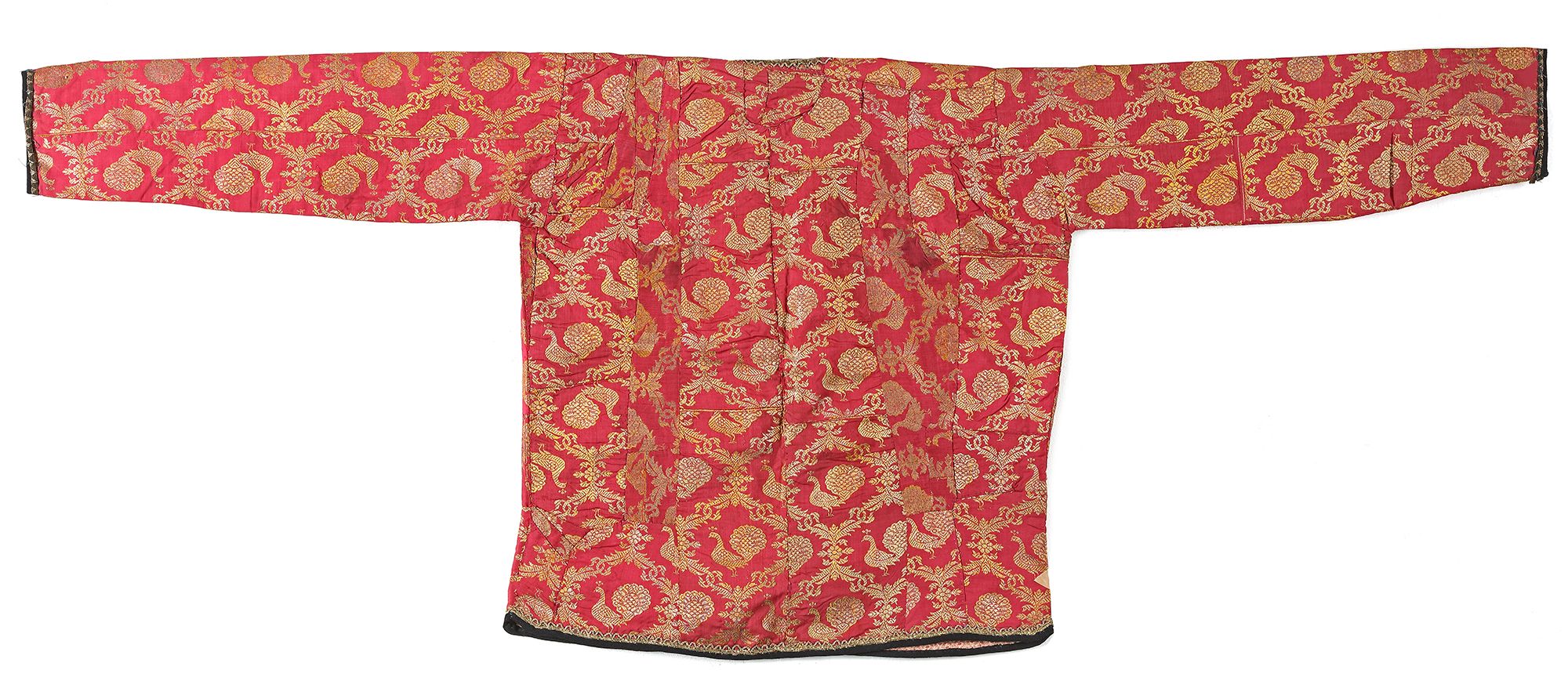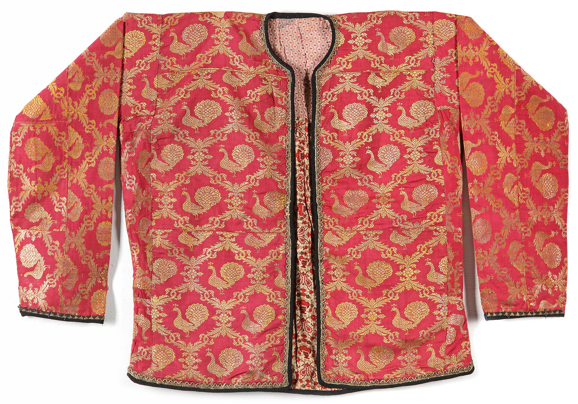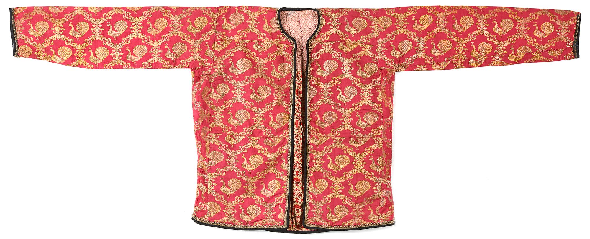 A Persian red with gilt quilted children's waistcoat, gilt with pheasants and foliage. 125 by 50 cm.