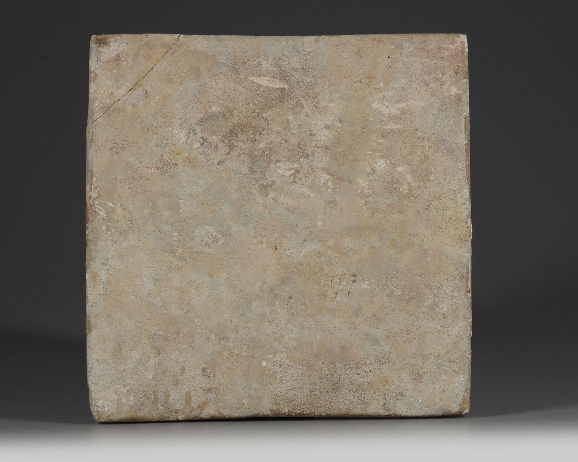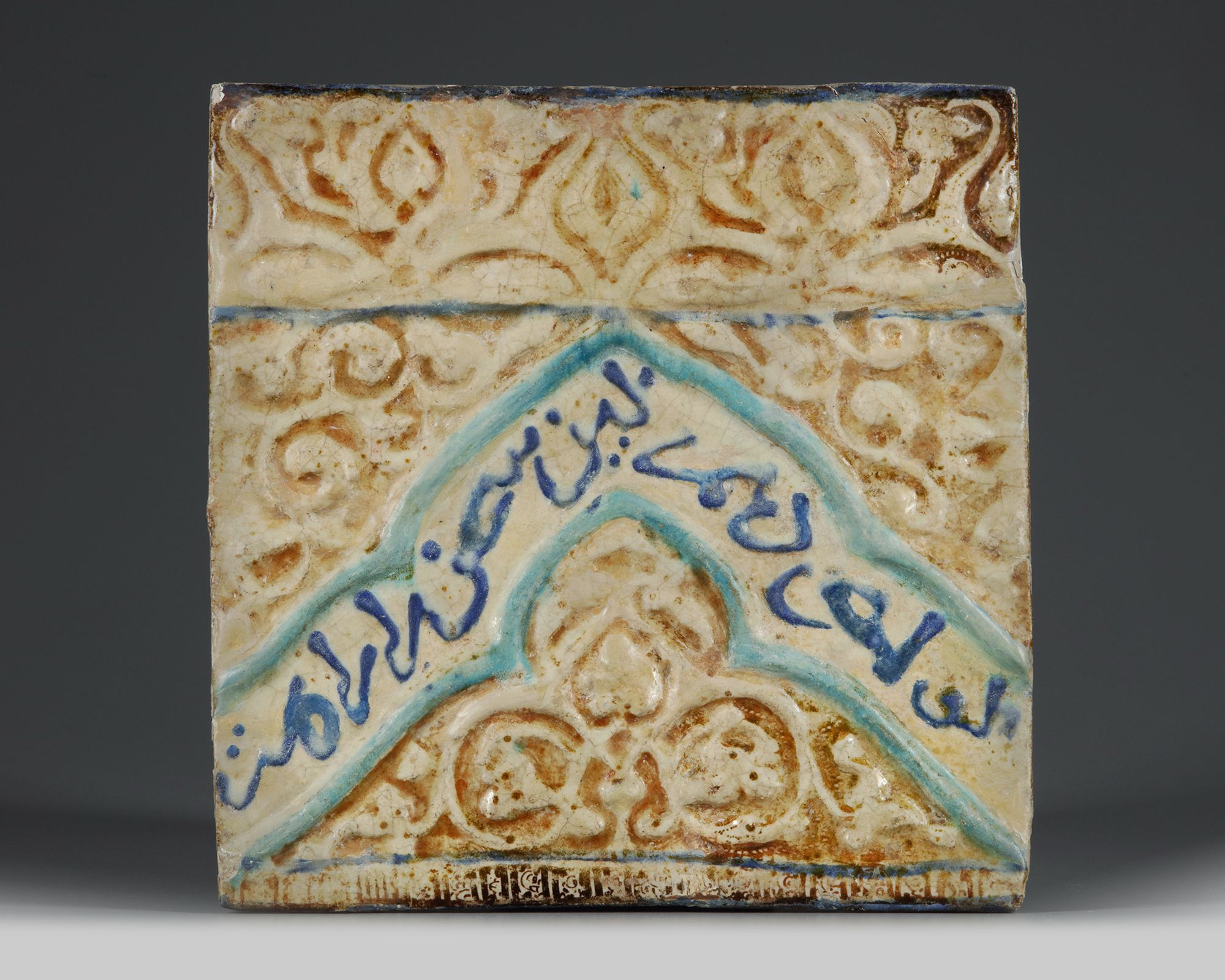 A Kashan lustre pottery square tile, decorated in cobalt blue and turquoise with calligraphy, the upper register with inverted palmettes issuing leafy swags.