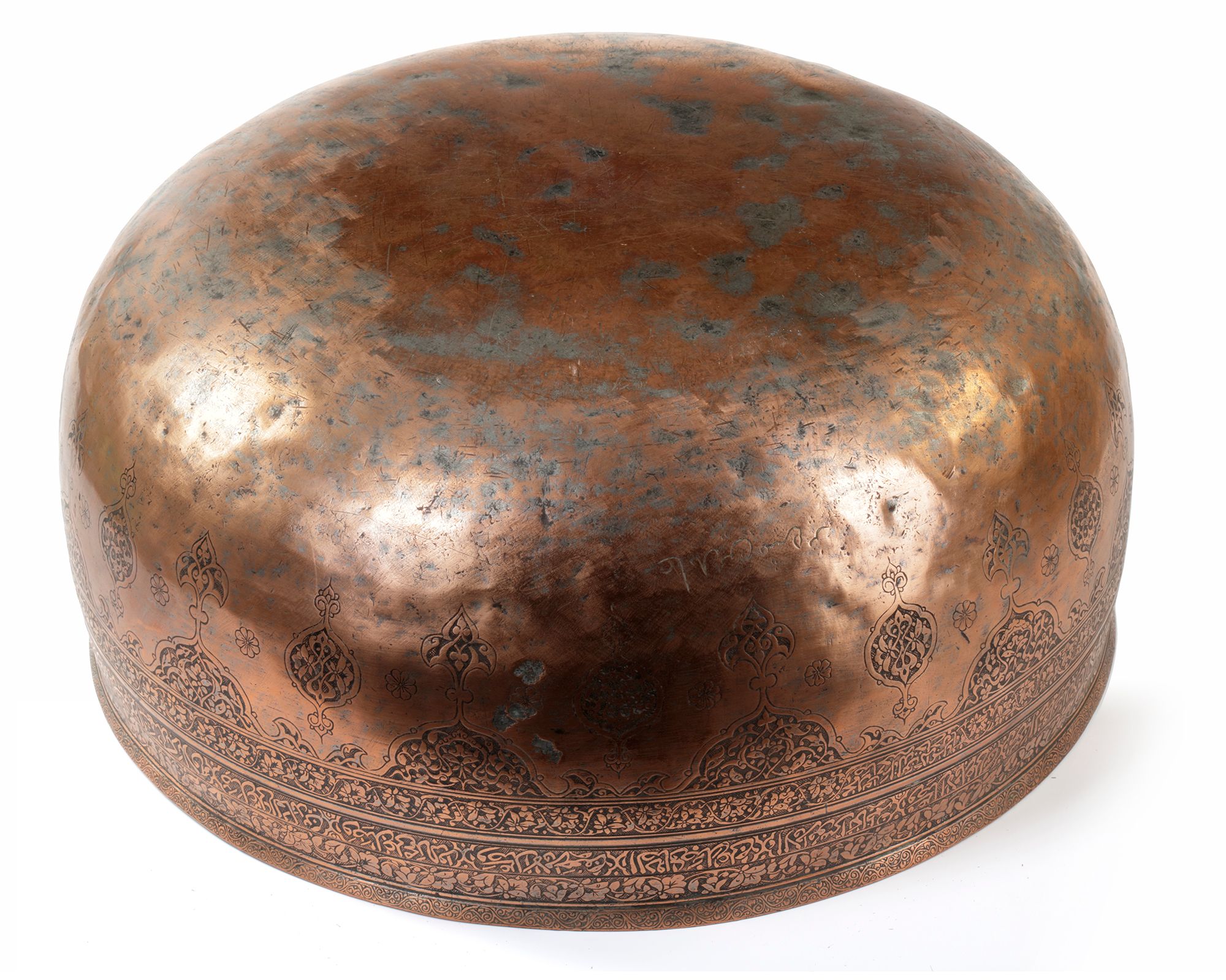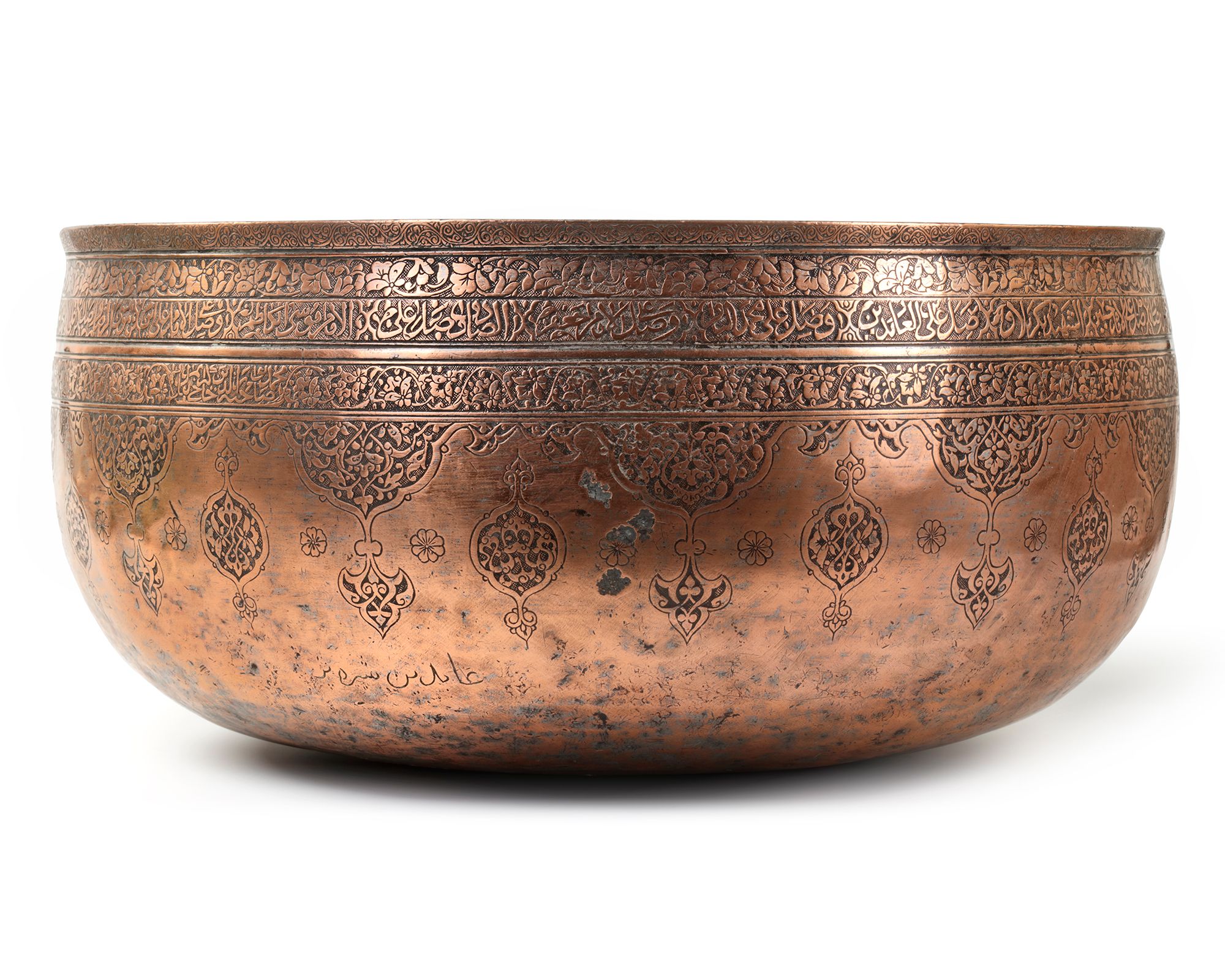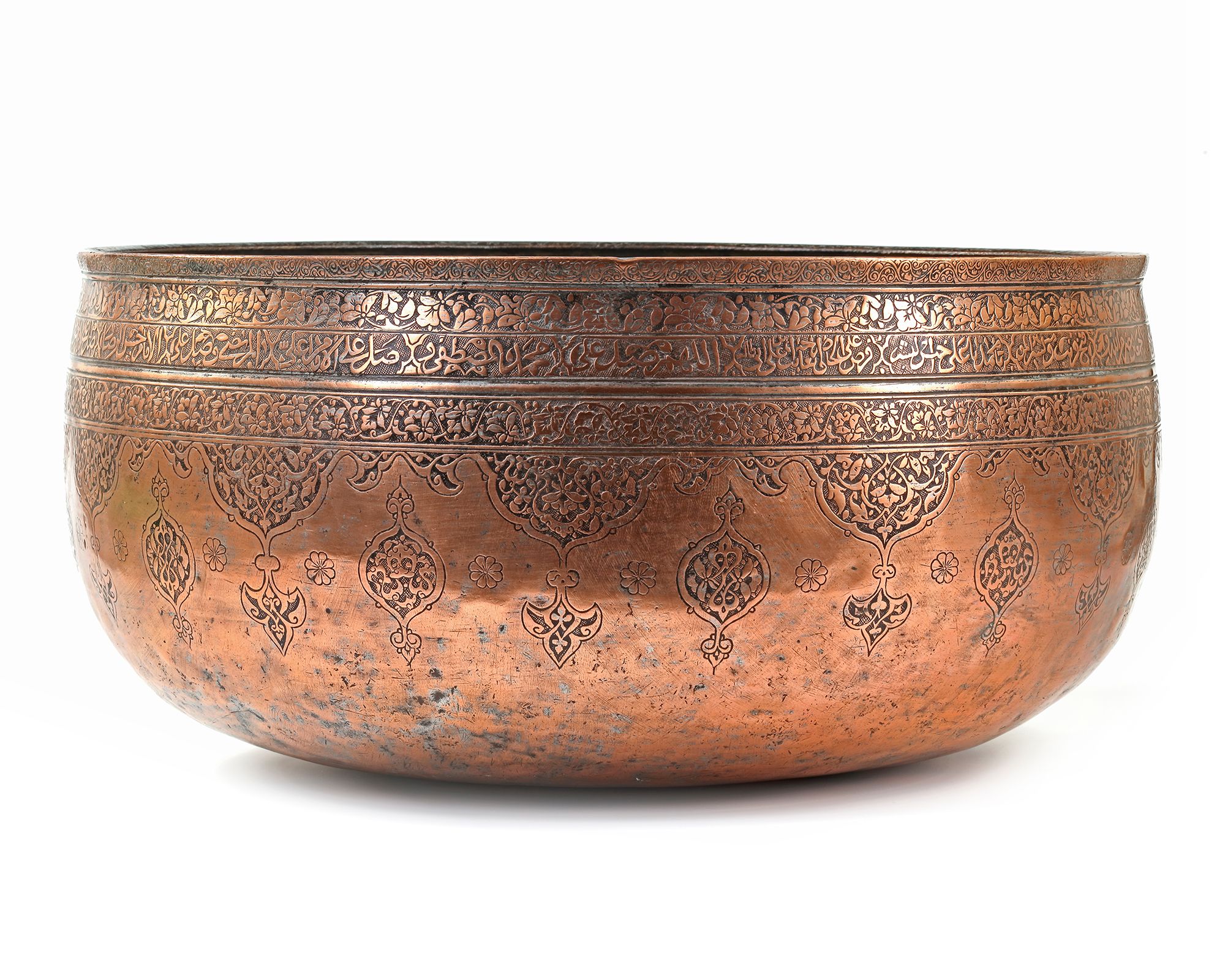 Of typical form, the rounded body engraved with elegant floral sprays on hatched ground within hanging medallions with palmettes finials, interspersed with rising medallions with loose quatrefoils and floral sprays, a register of elongated calligraphic cartouches in thuluth script with religious prayer.