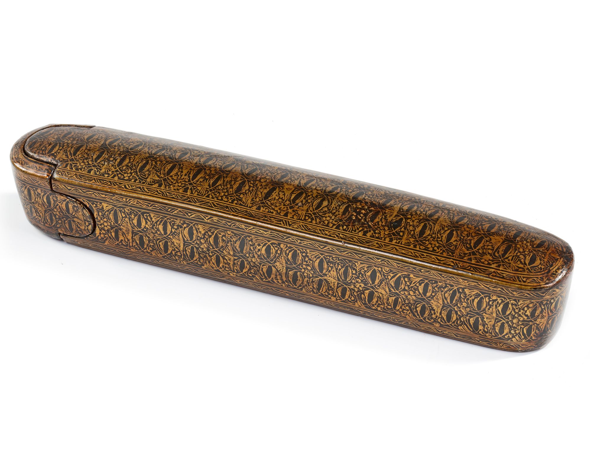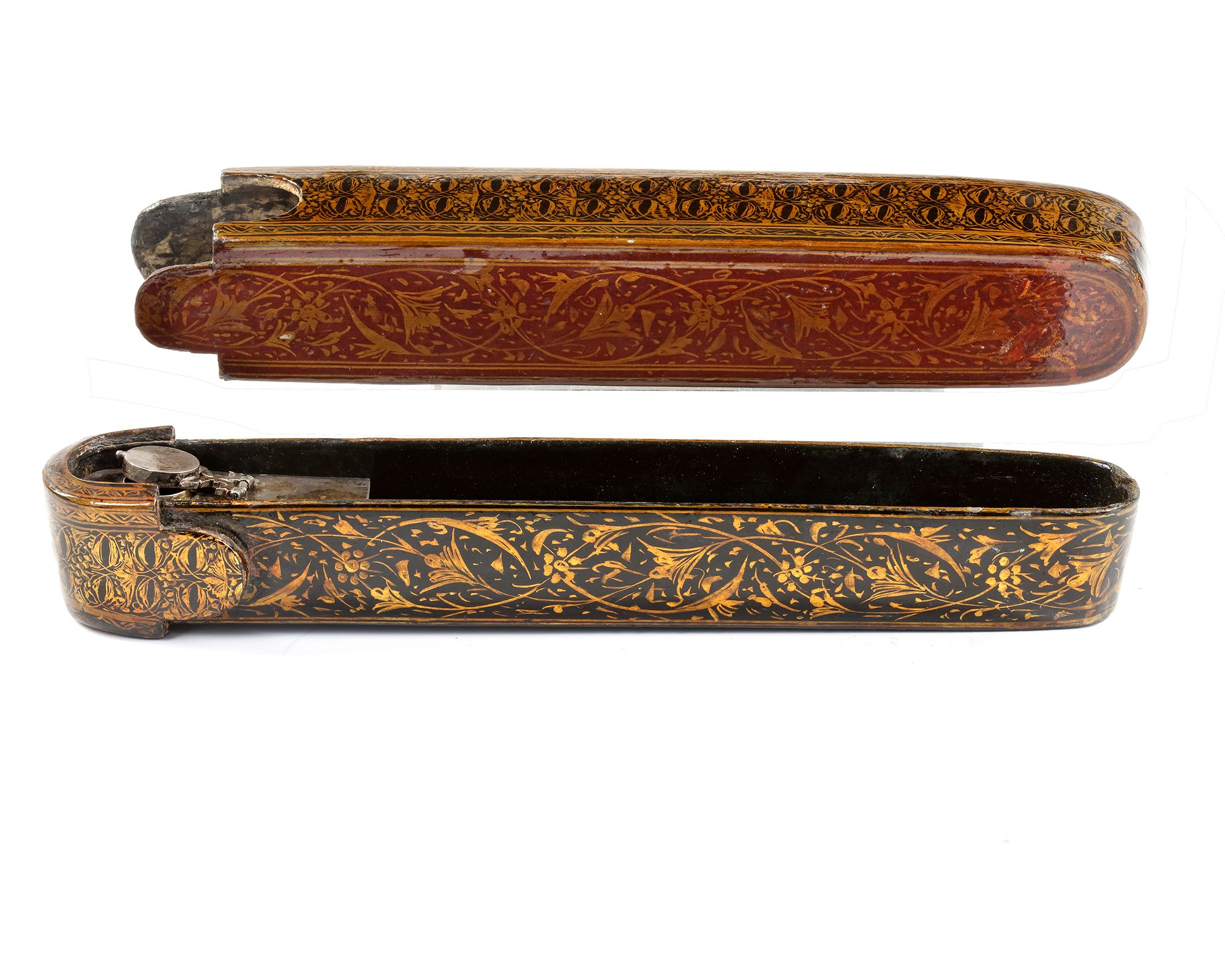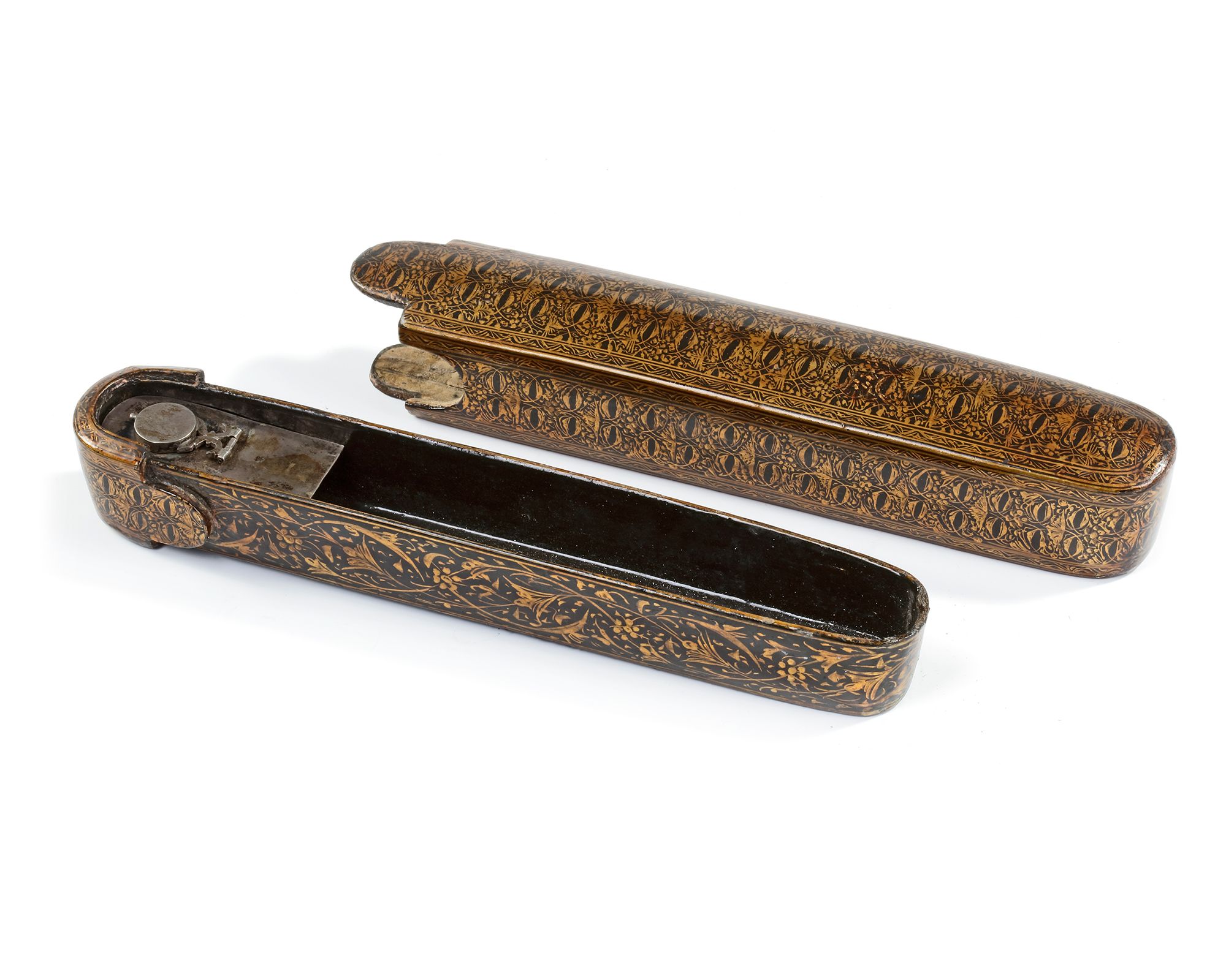 Decorated with foliage painted in gold on a black lacquered background, with silver inkwell. Length: 22.5 cm.