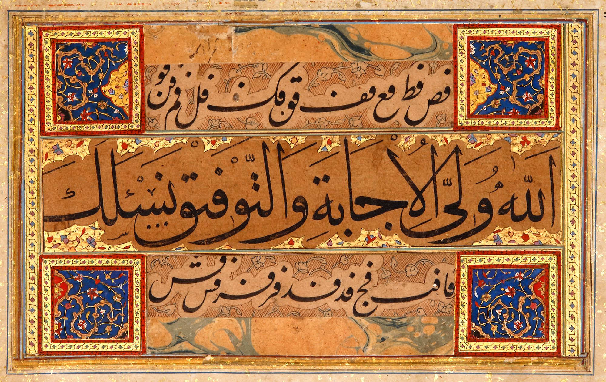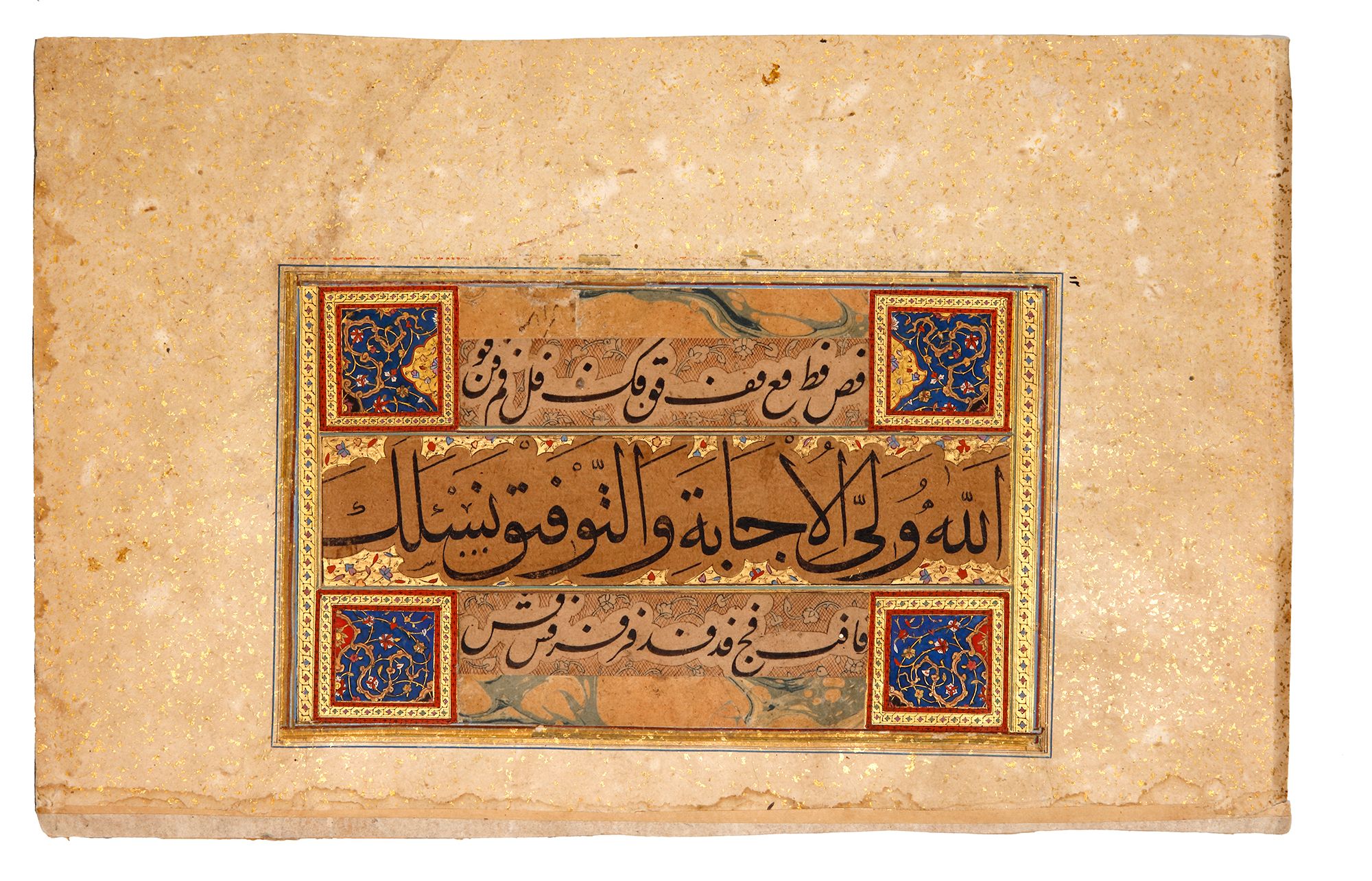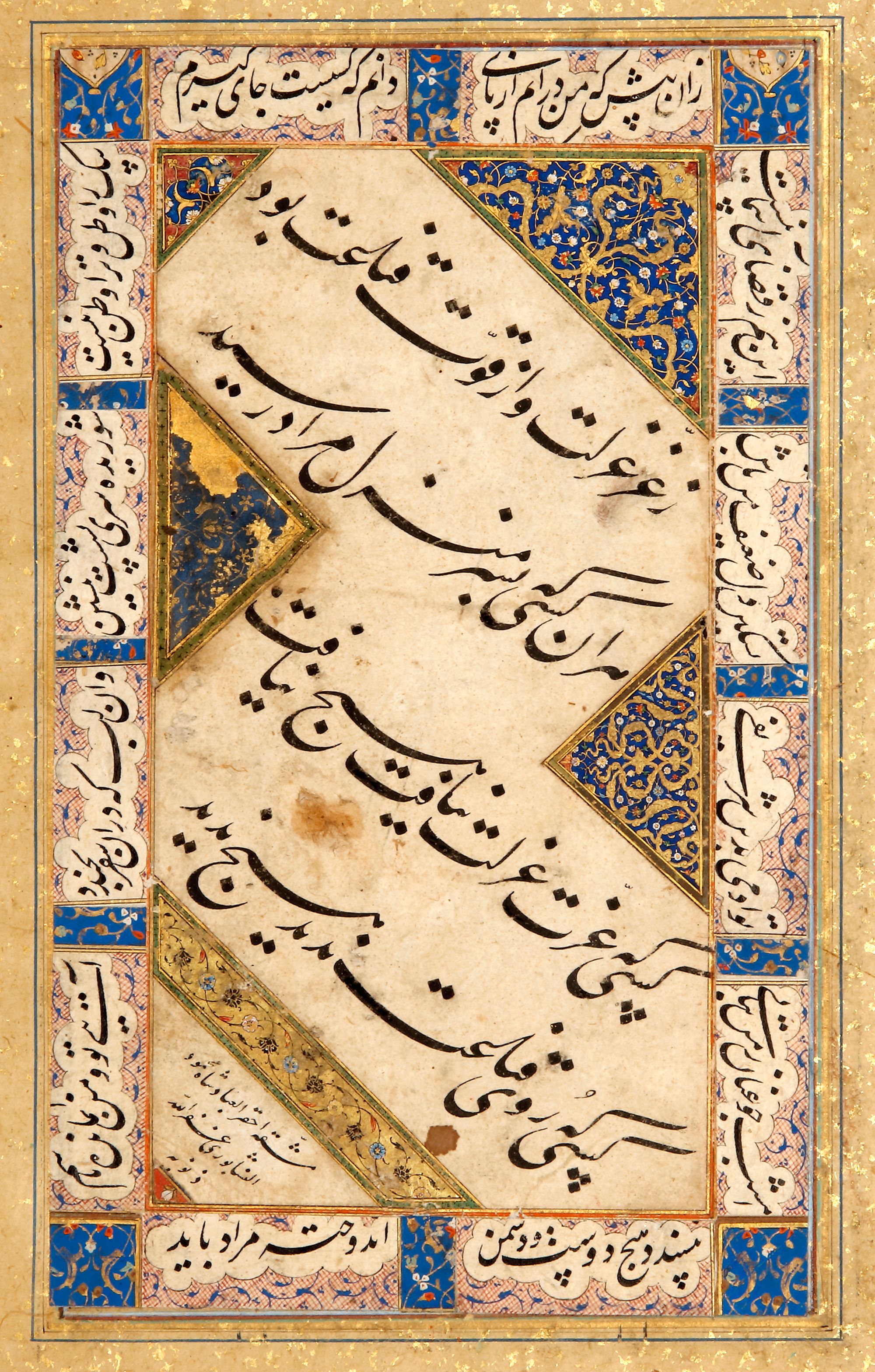 Persian manuscript on paper, verso with 4 lines of elegant black nastaliq in clouds reserved against a hatched ground decorated with meandering floral vine, lower left corner signed Shah Mahmud al-Nishapuri, of black nastaliq below, a line of of large gold-speckled black thuluth in a cloud reserved against a gold and polychrome illuminated ground to the left, gold-speckled margins; recto with a line of large black thuluth in a cloud reserved against a hatched ground, flanked above and below by a line of gold-speckled black nastaliq in clouds reserved against a gold and polychrome illuminated ground, each corner with a gold and polychrome illuminated panel, gold speckled margins, minor smudges and light creases.