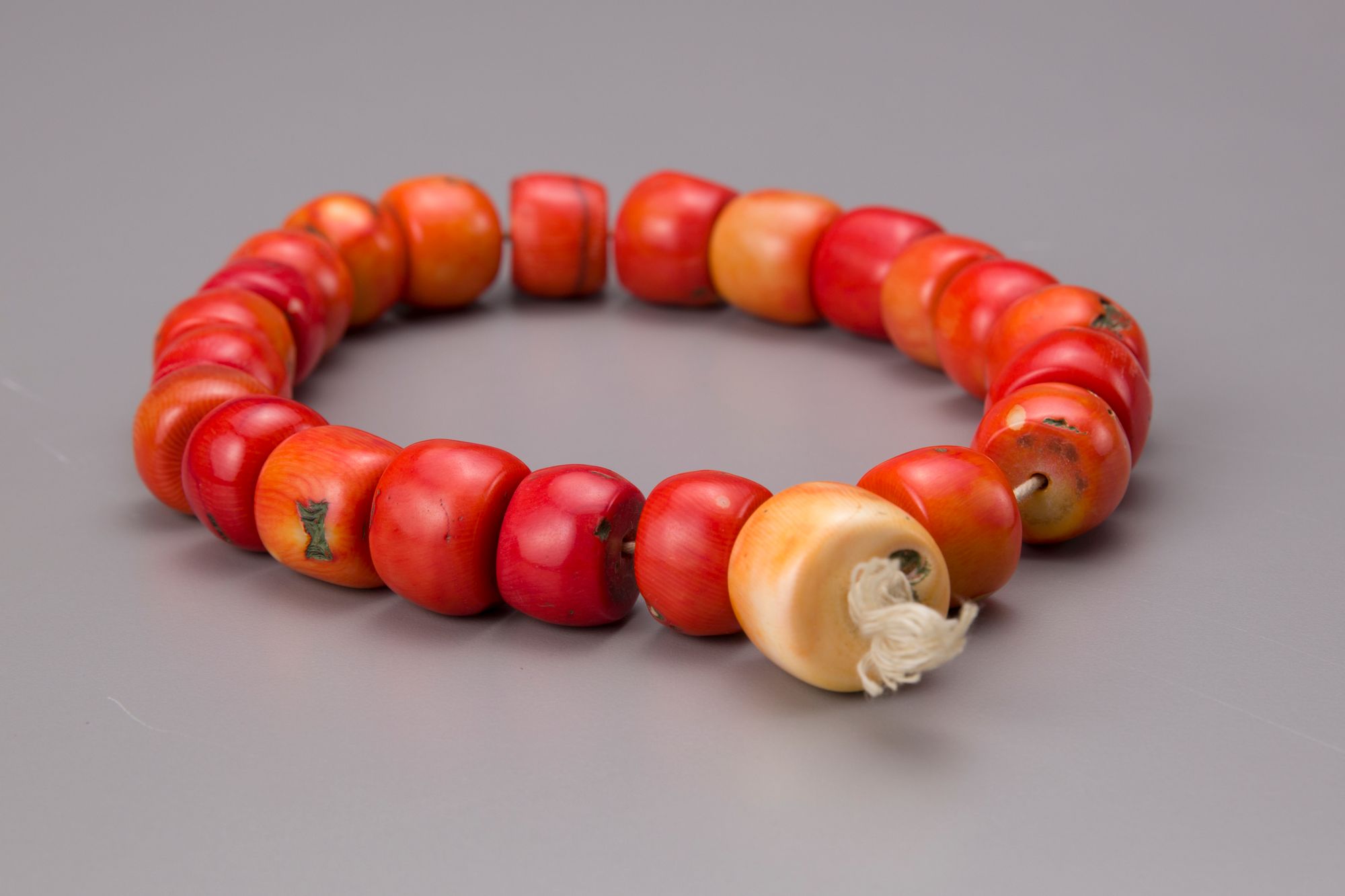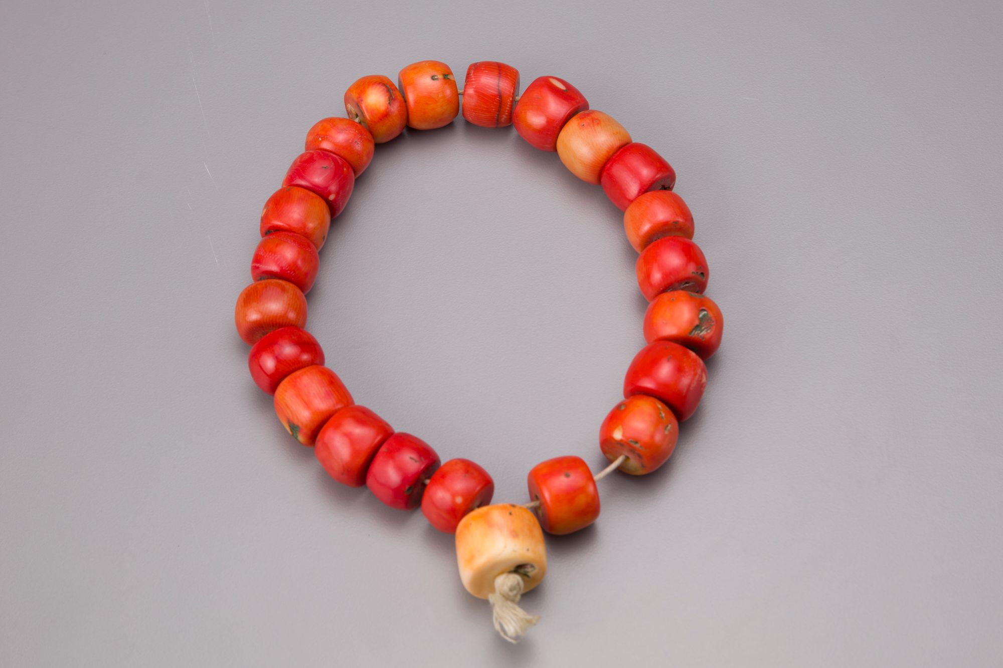 Handcrafted necklace featuring 23 natural beads in rich red-orange hues, strung on cord with a distinctive end bead. Diam 2 cm.