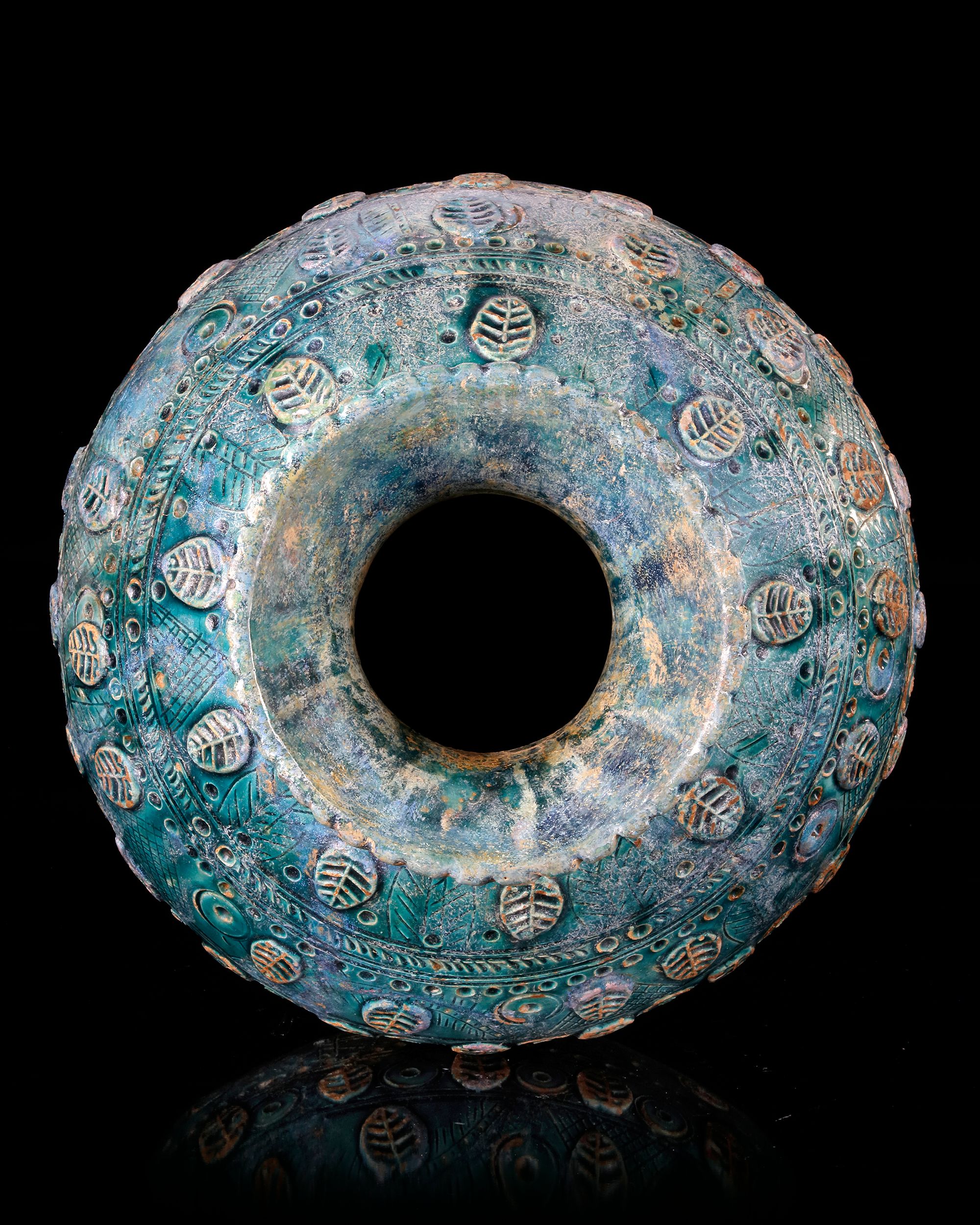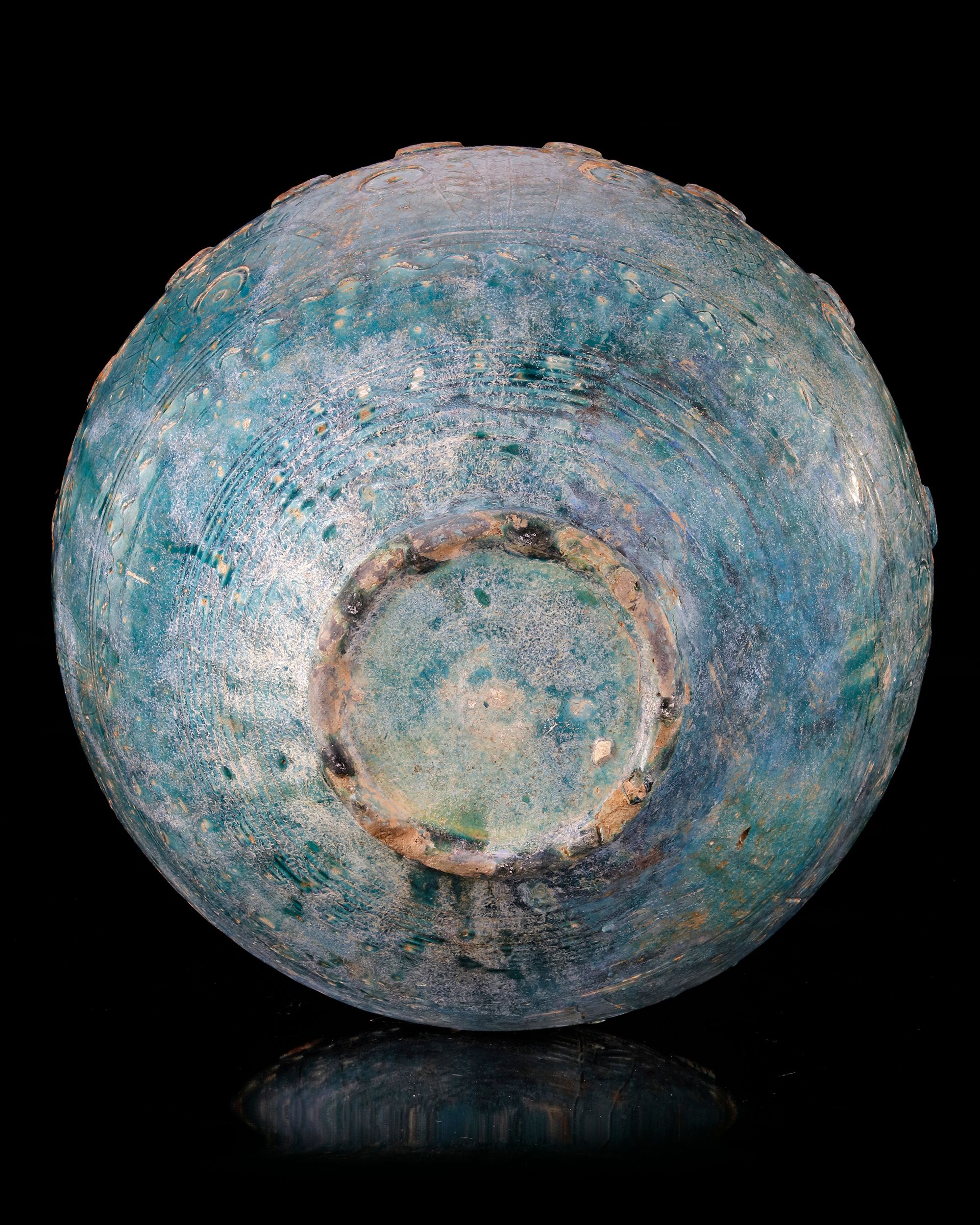 This type of alkaline-glazed pottery, intended for storage of food stuffs or drinking water, had been produced in kilns along the Upper Euphrates since at least the Parthian period continuing through the Umayyad and early Abbasid periods, with subtle changes in shape and design. The distinctive silvery iridescence offset by the turquoise glaze only adds to their decorative appeal. Their story is also fascinating, for examples have been found as far afield as Fujian province in China. A tomb at Lotus Peak on the outskirts of Fuzhou, dedicated to one Liu Hua, who died in 930 AD, wife of King Wang Yangjun of the Min Kingdom (909-945 AD), yielded three similar turquoise-glazed jars, testament to the trading activities of Persian and Arab merchants along the southern coast of China at this time.