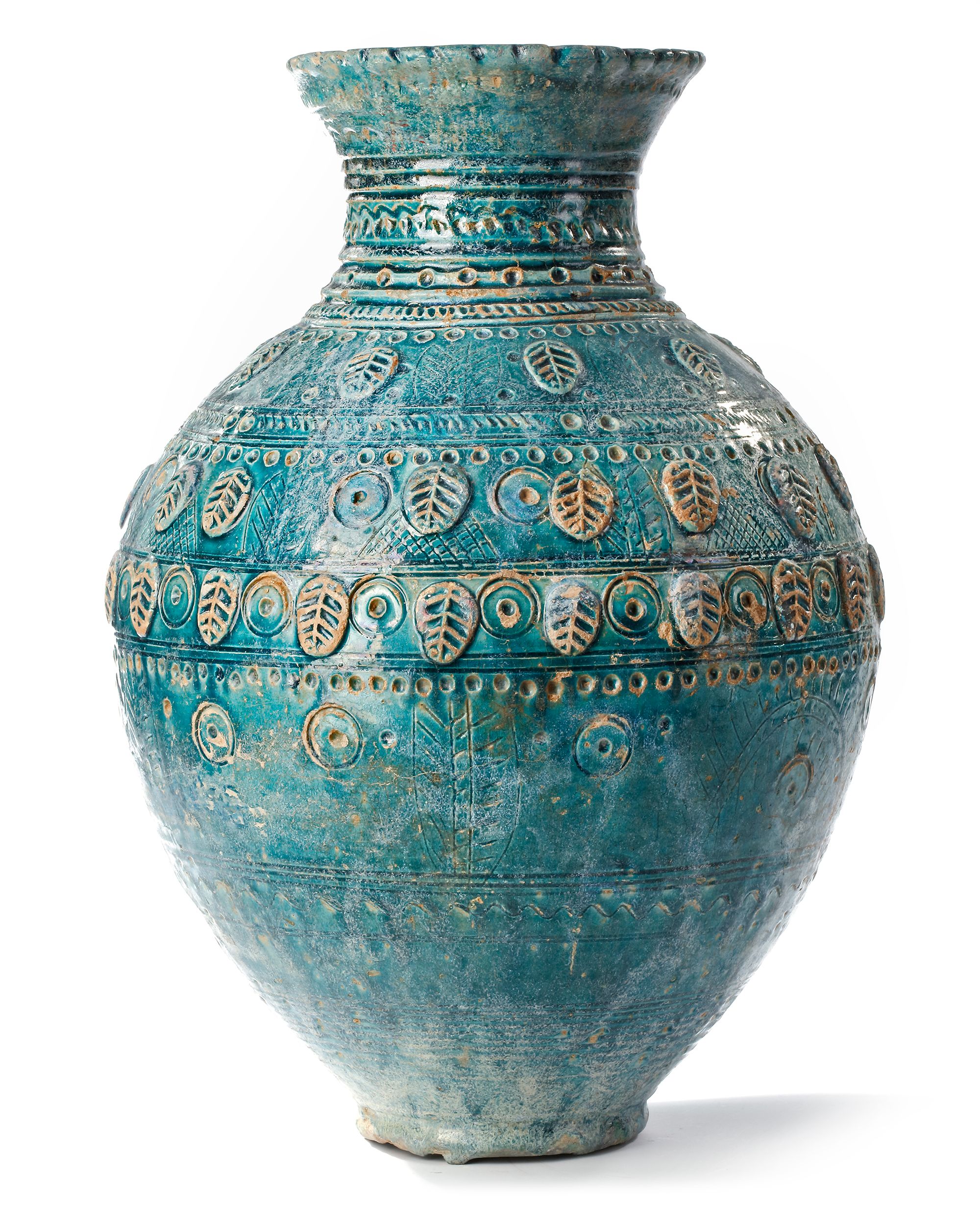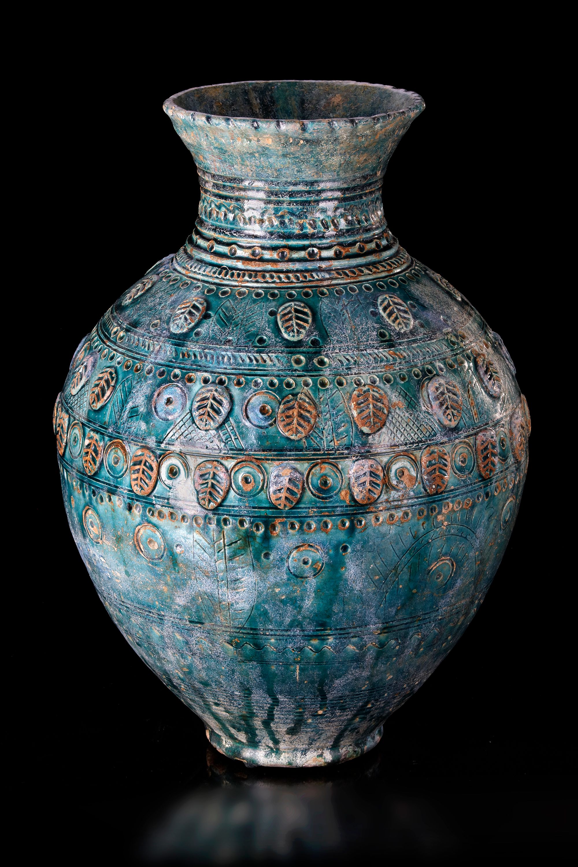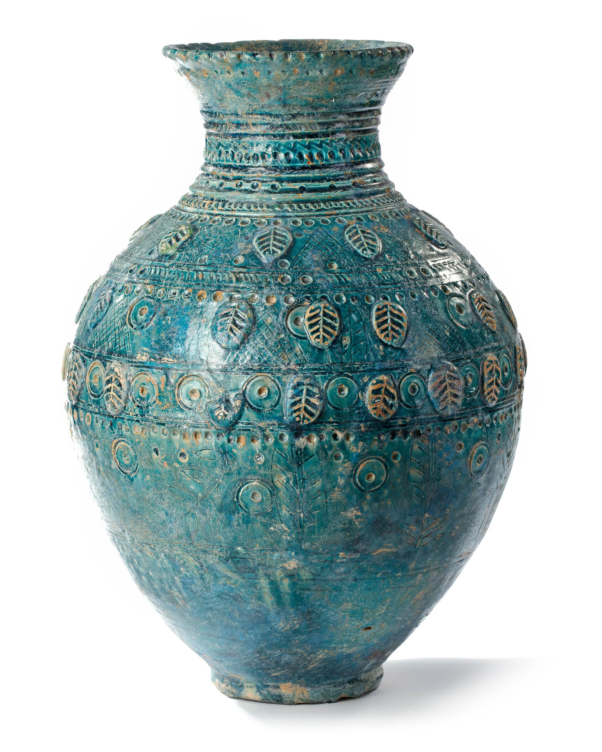 The egg-shaped jar, is covered entirely with a blue-greenglaze, which is common in Sassanid ceramic production. The decoration moulded, applied and stamped with incised detailing, the body with a band of alternating panels containing crosses and cable design with applied and stamped floral motifs, above and below a band of applied bosses in the form of flower heads, the shoulder with a band of foliate motifs arranged in a zig-zag pattern on a ground of incised dots, the neck with a frieze of moulded palmette motifs.