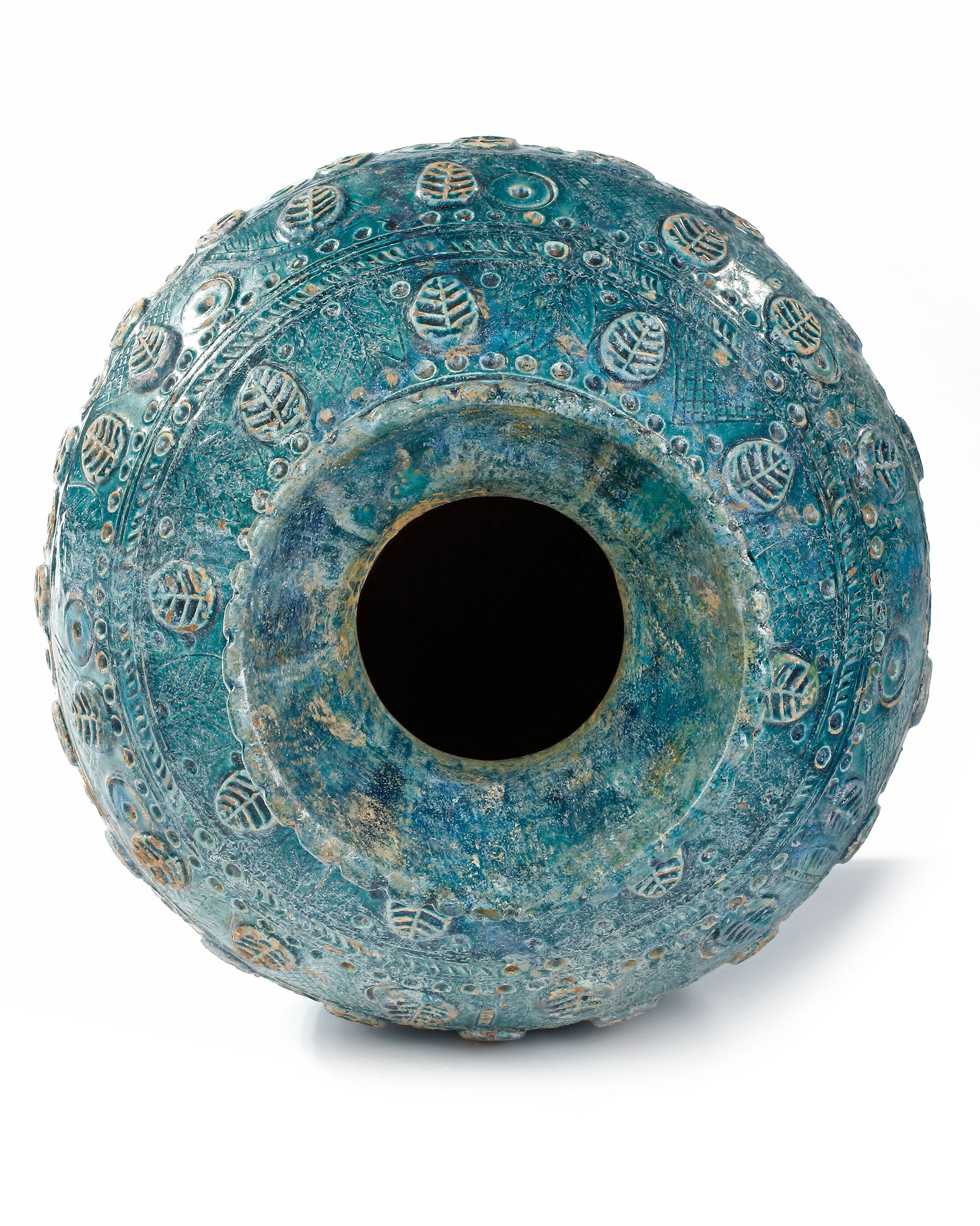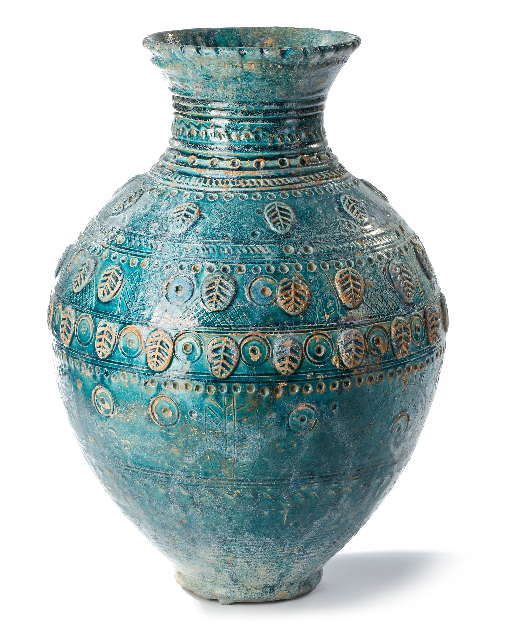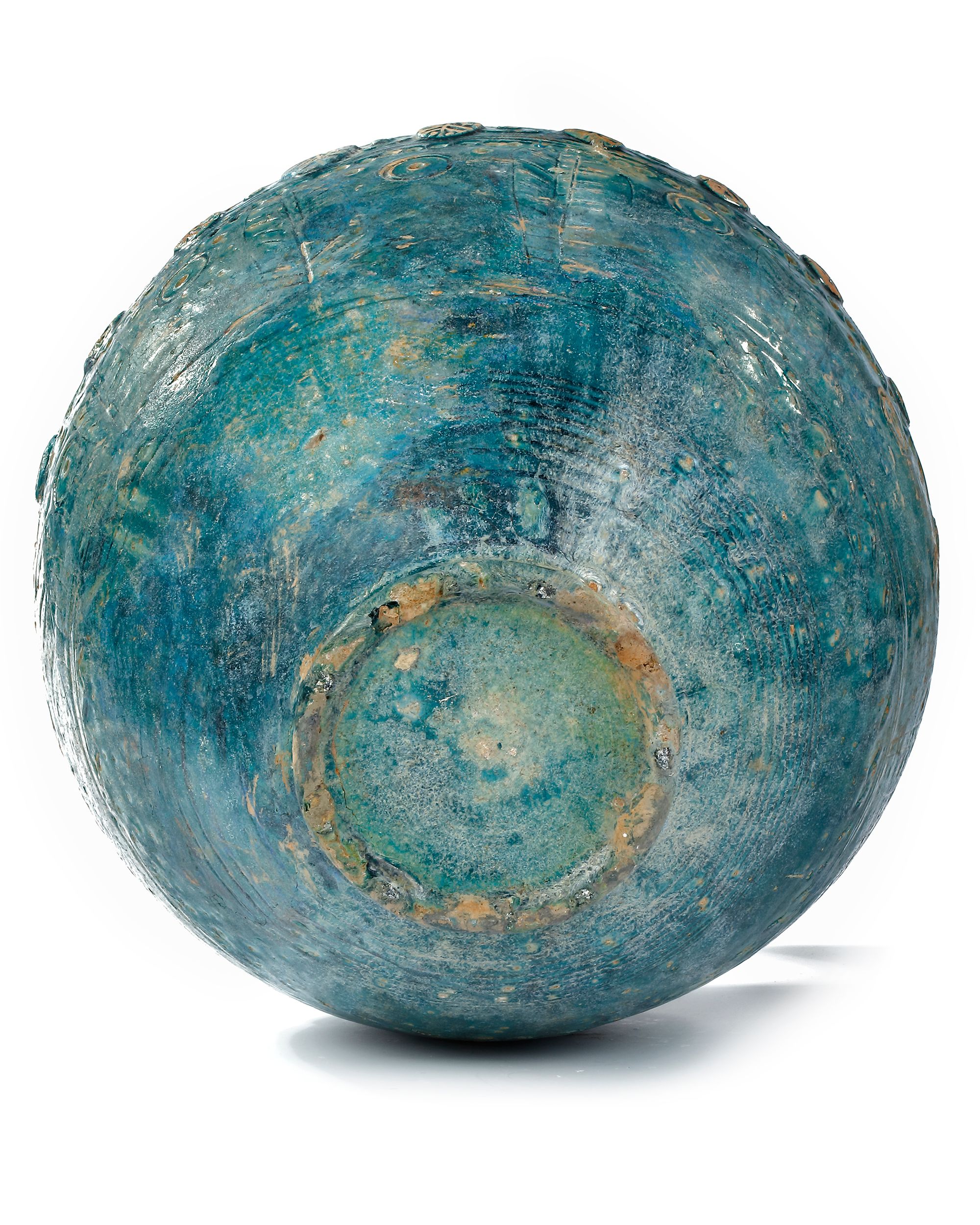 The egg-shaped jar, is covered entirely with a blue-greenglaze, which is common in Sassanid ceramic production. The decoration moulded, applied and stamped with incised detailing, the body with a band of alternating panels containing crosses and cable design with applied and stamped floral motifs, above and below a band of applied bosses in the form of flower heads, the shoulder with a band of foliate motifs arranged in a zig-zag pattern on a ground of incised dots, the neck with a frieze of moulded palmette motifs.