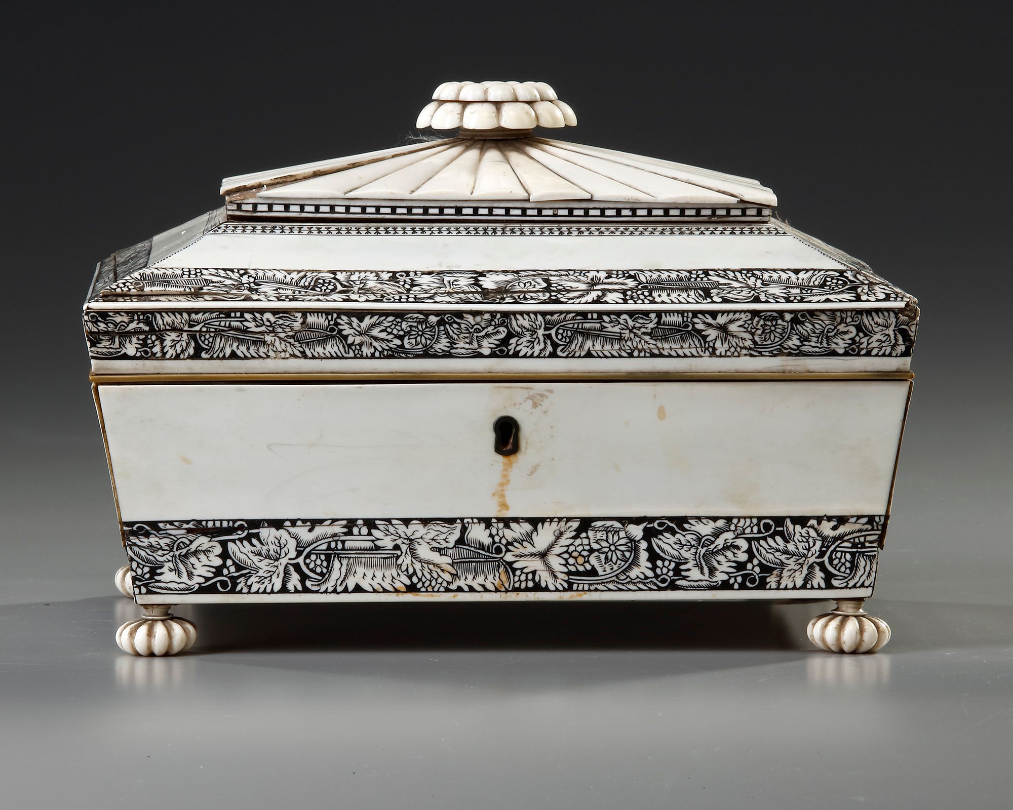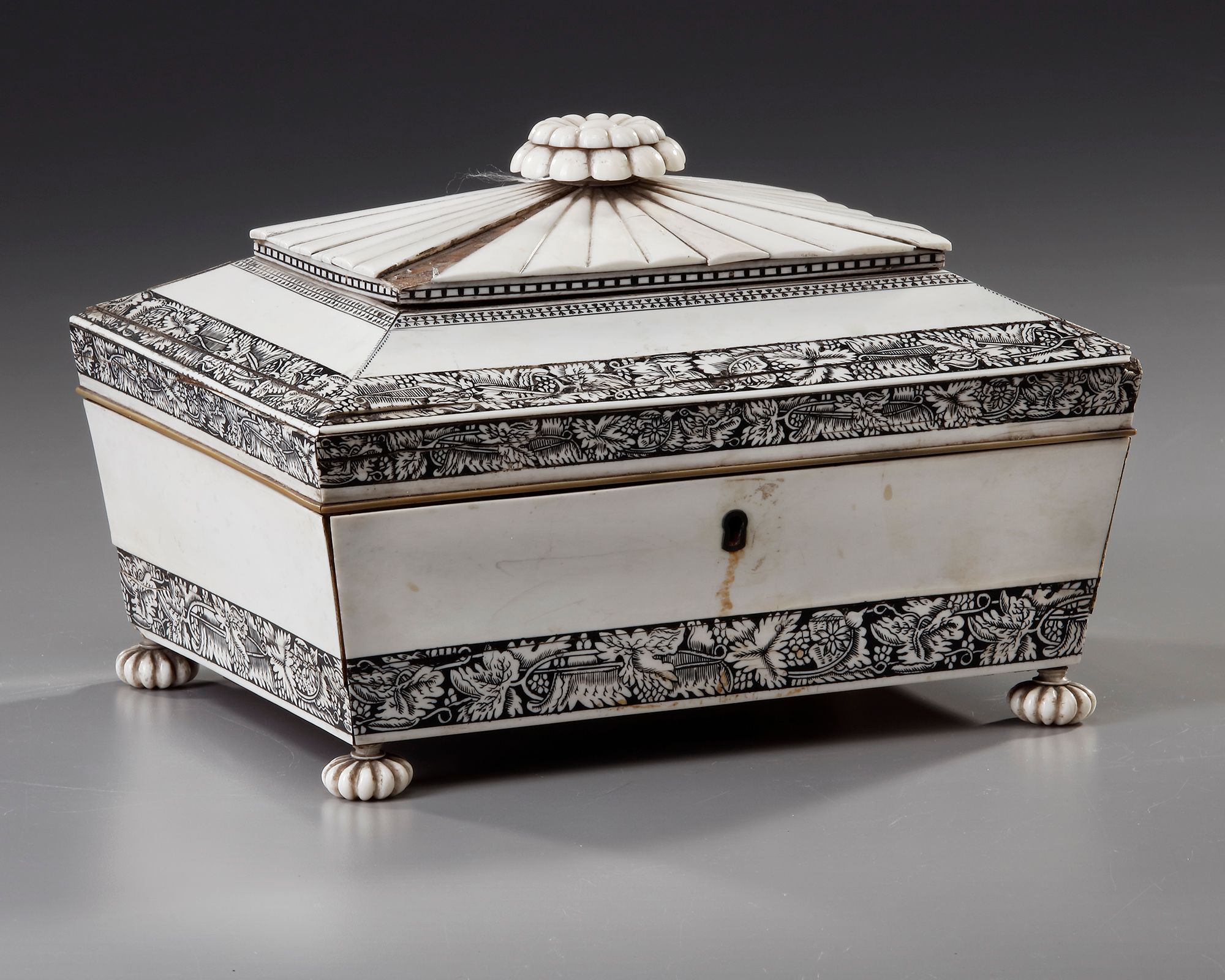 Of typical rectangular shape, imitating the design of a jewellery casket or sarcophagus, resting on four rounded and gadrooned ivory feet, rising to an everted hinged lid with an ivory sunburst section at the top with a double rosette ivory finial in the centre, the edges enhanced with incised and black-painted decorative bands with lush vine trellis, foliage and grape bunches, a typical motif of the Anglo-Indian Vizagapatam ivory production, the interior divided into two levels, the upper level made of a lift-out tray with several open and lidded compartments, the plain lower level constituting an extra storage element.