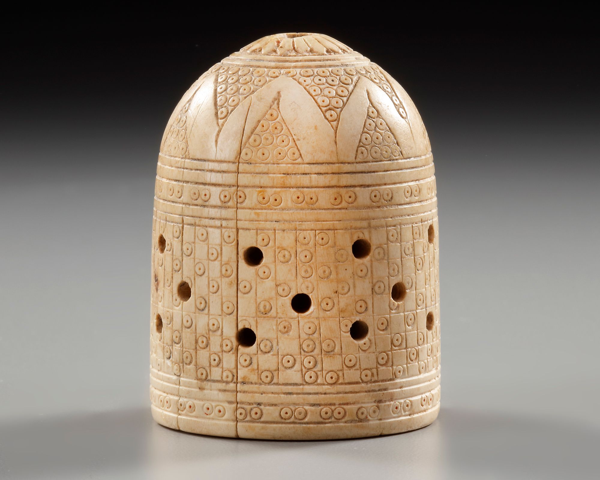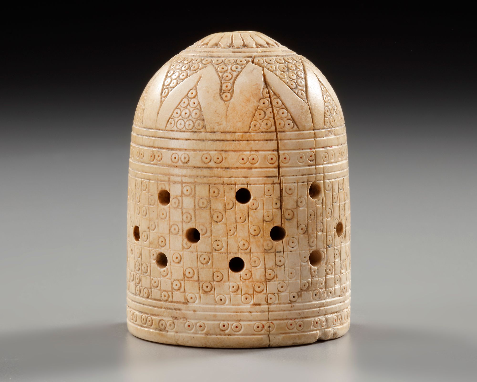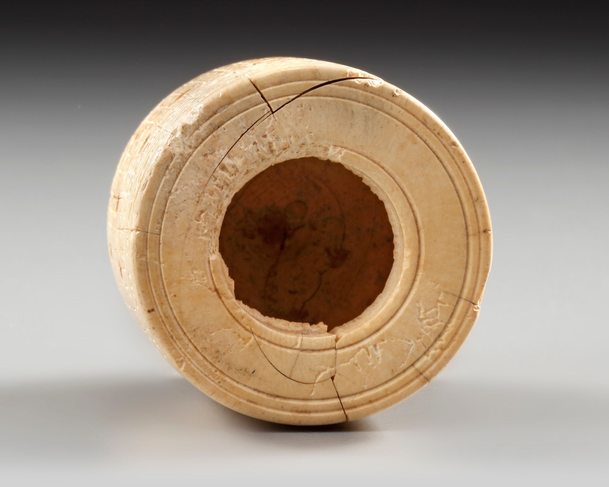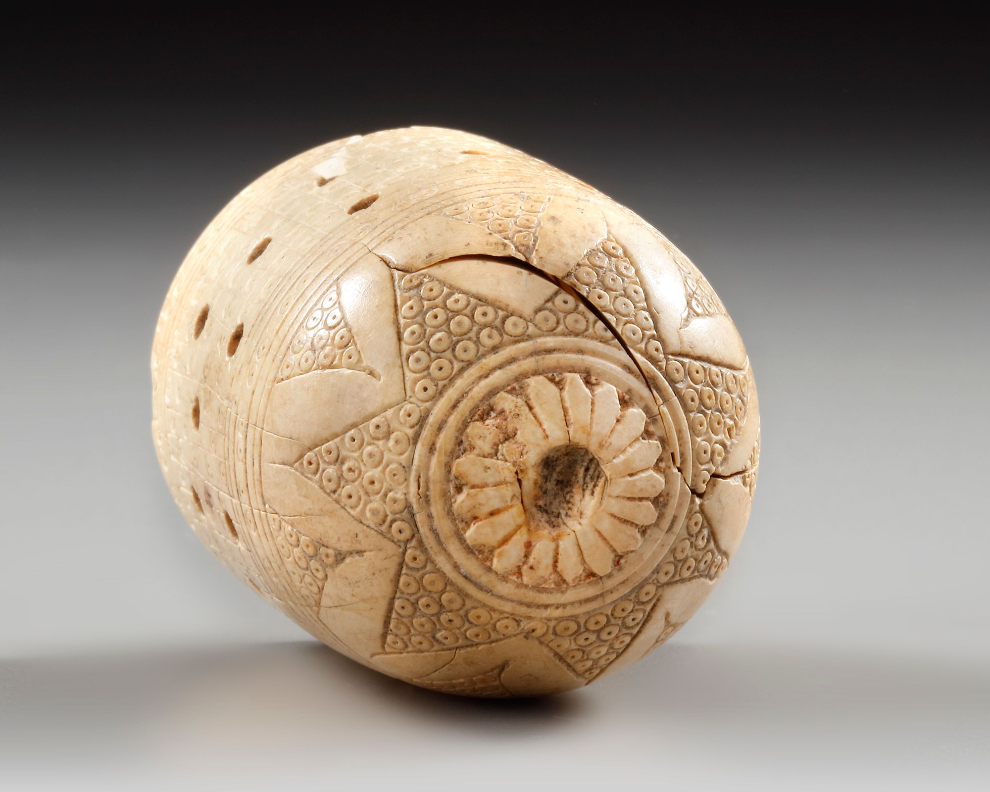 The dot-in-circle motif recalls designs presumed to be of magical significance, most likely an abstract eye to ward off the evil-eye, which serve an apotropaic function. Easily reproduced with a tool and visible in many cultures and times, this symbol may have lost its meaning, and became simply a decorative pattern.