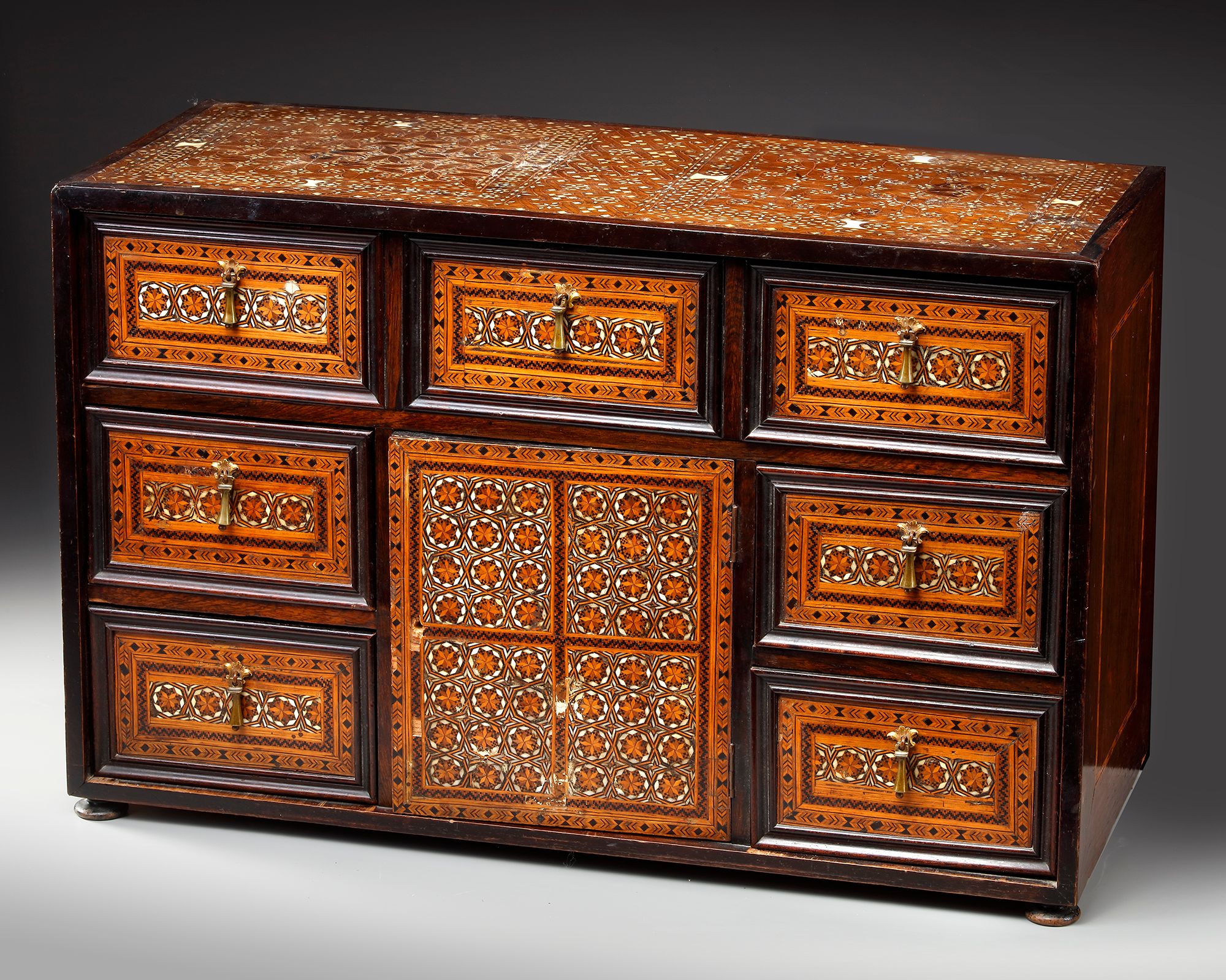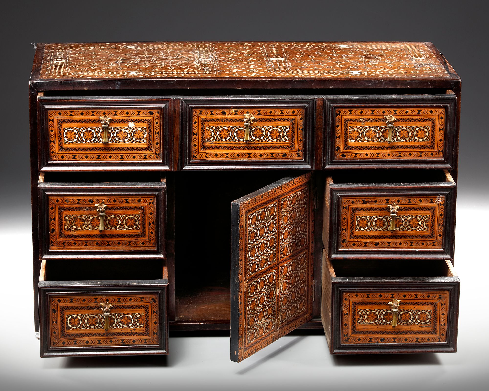 Of rectangular form on four round feet, the hinged front opening to reveal seven drawers and two hinged doors, the drawers with iron hinged handles, inlaid in the intarsia technique with bone, stained bone to the sides, fronts of drawers and inner and outer side of the front with repeat designs.