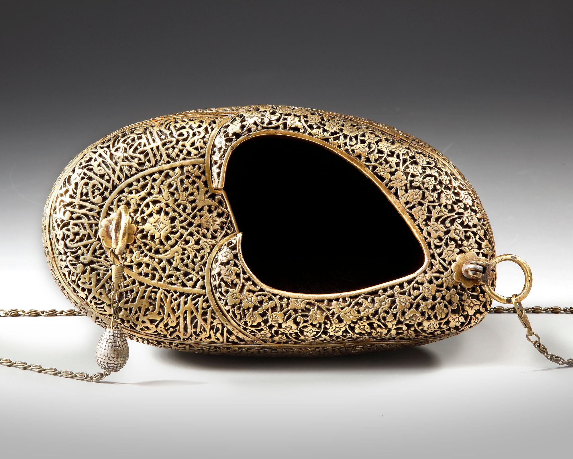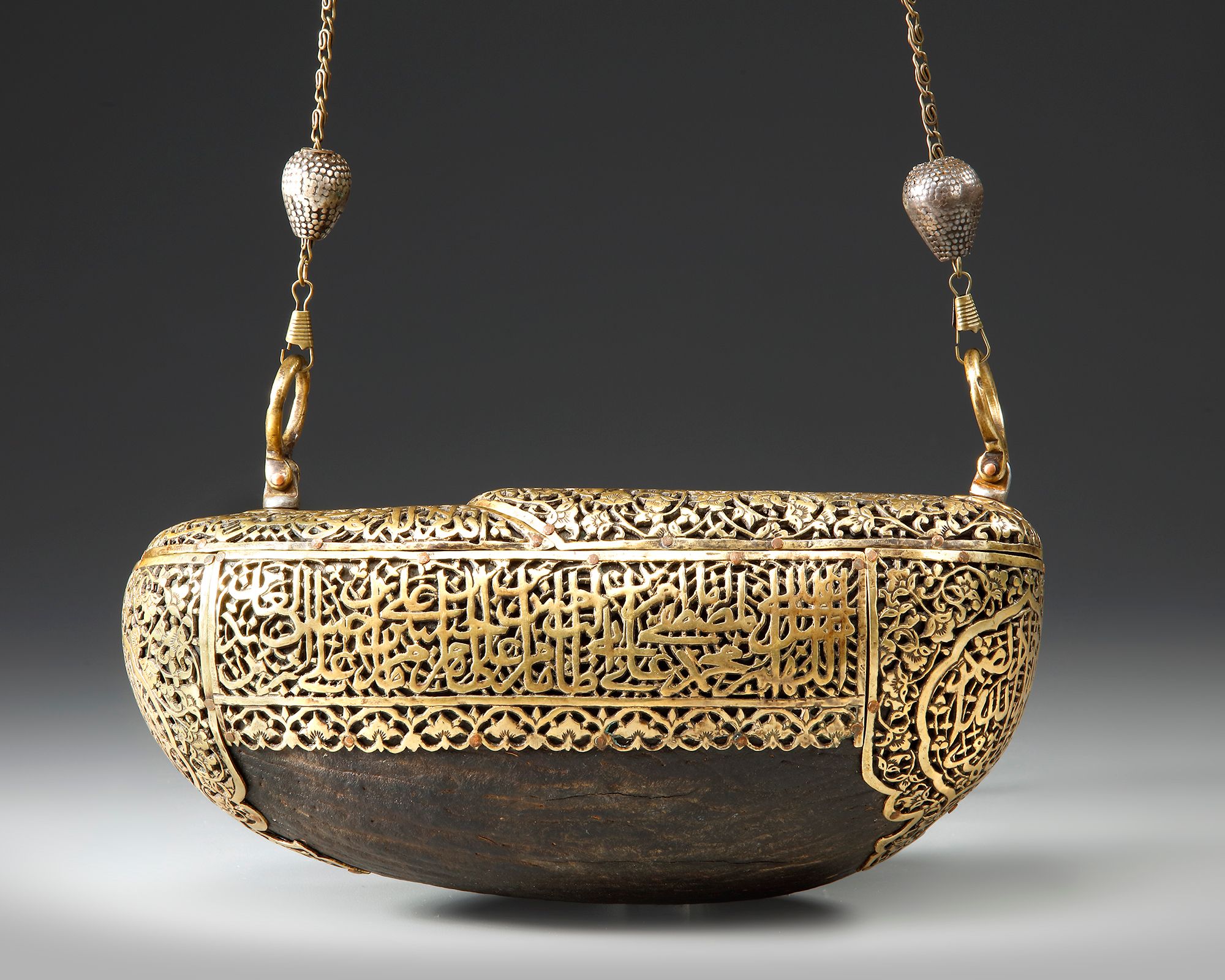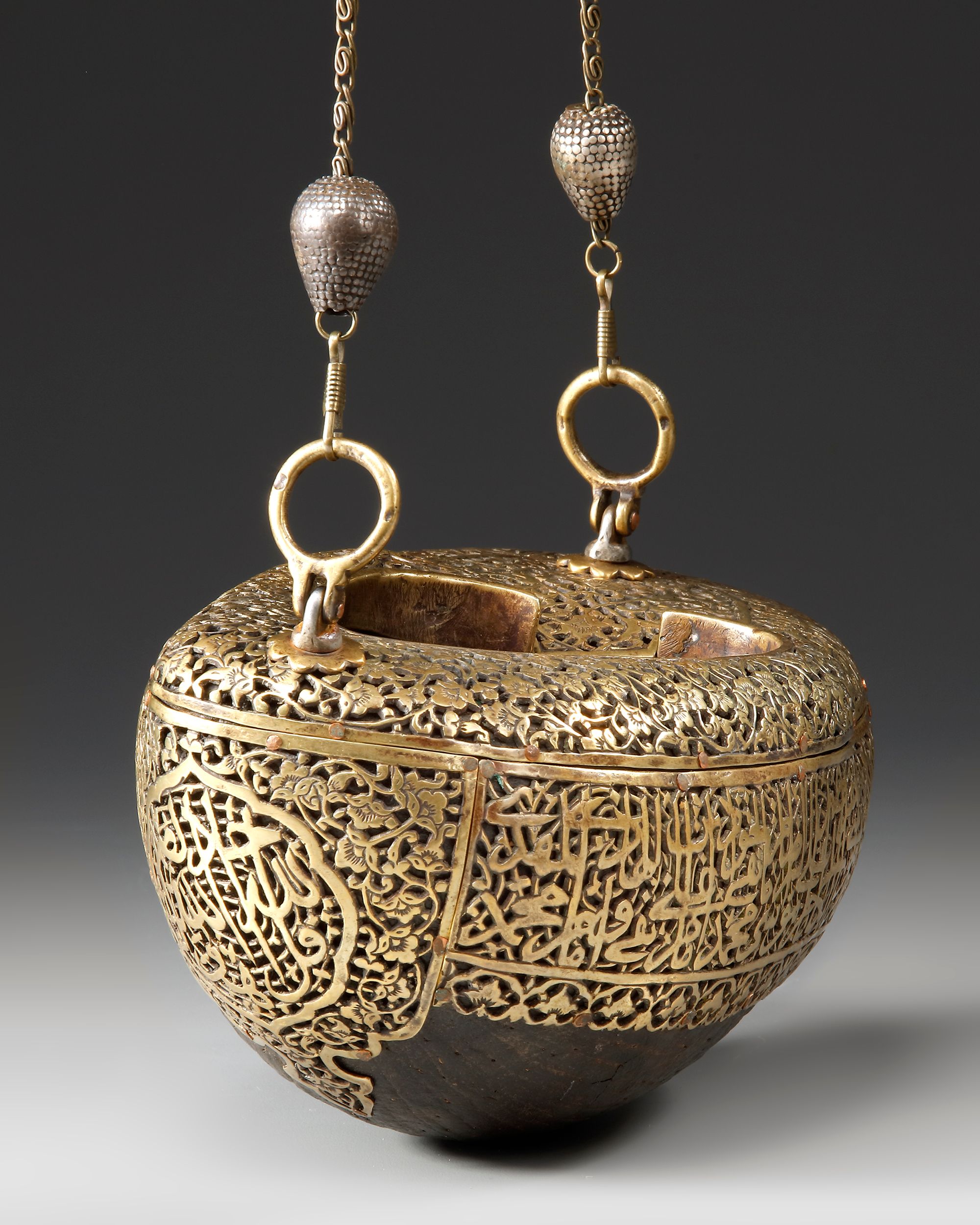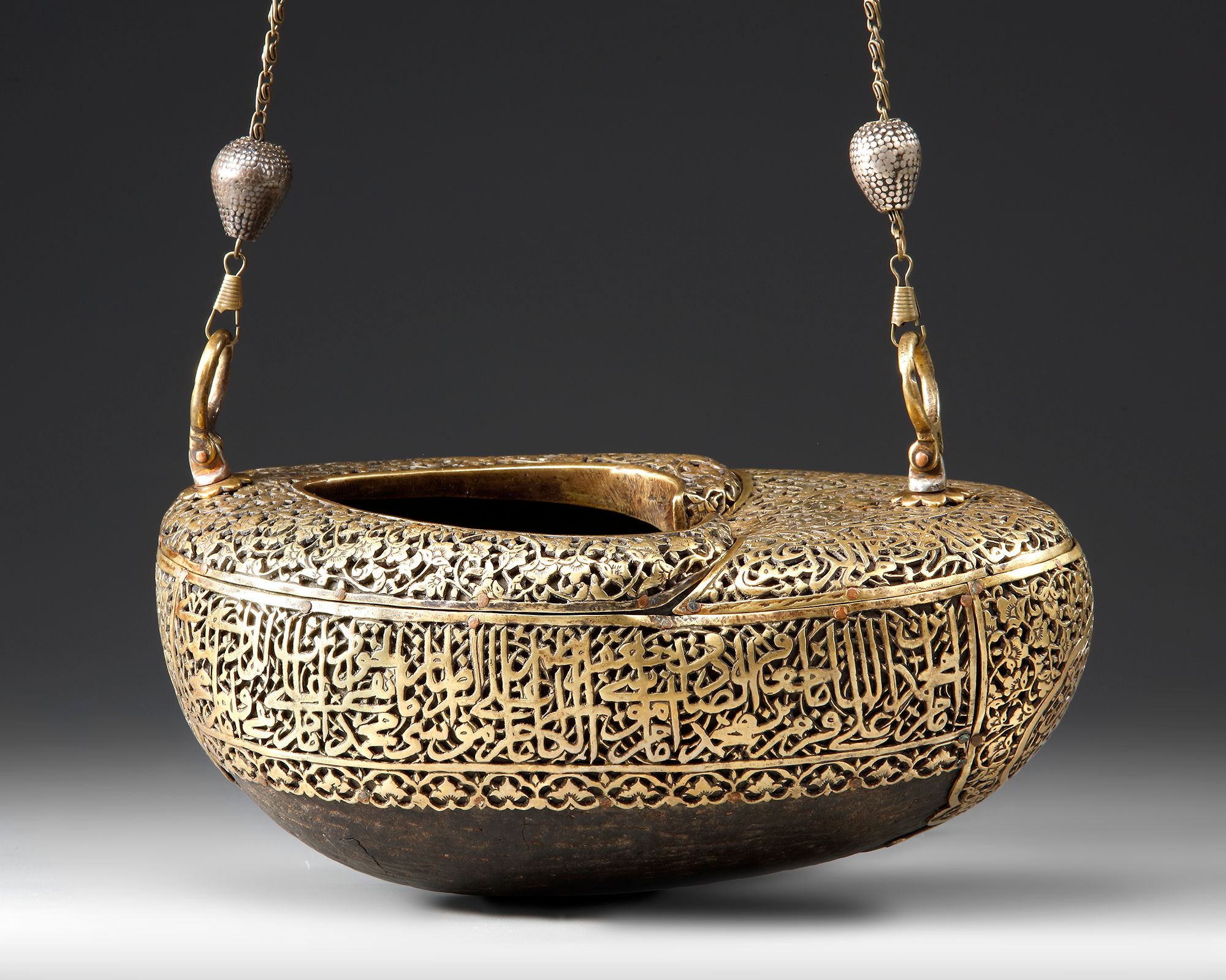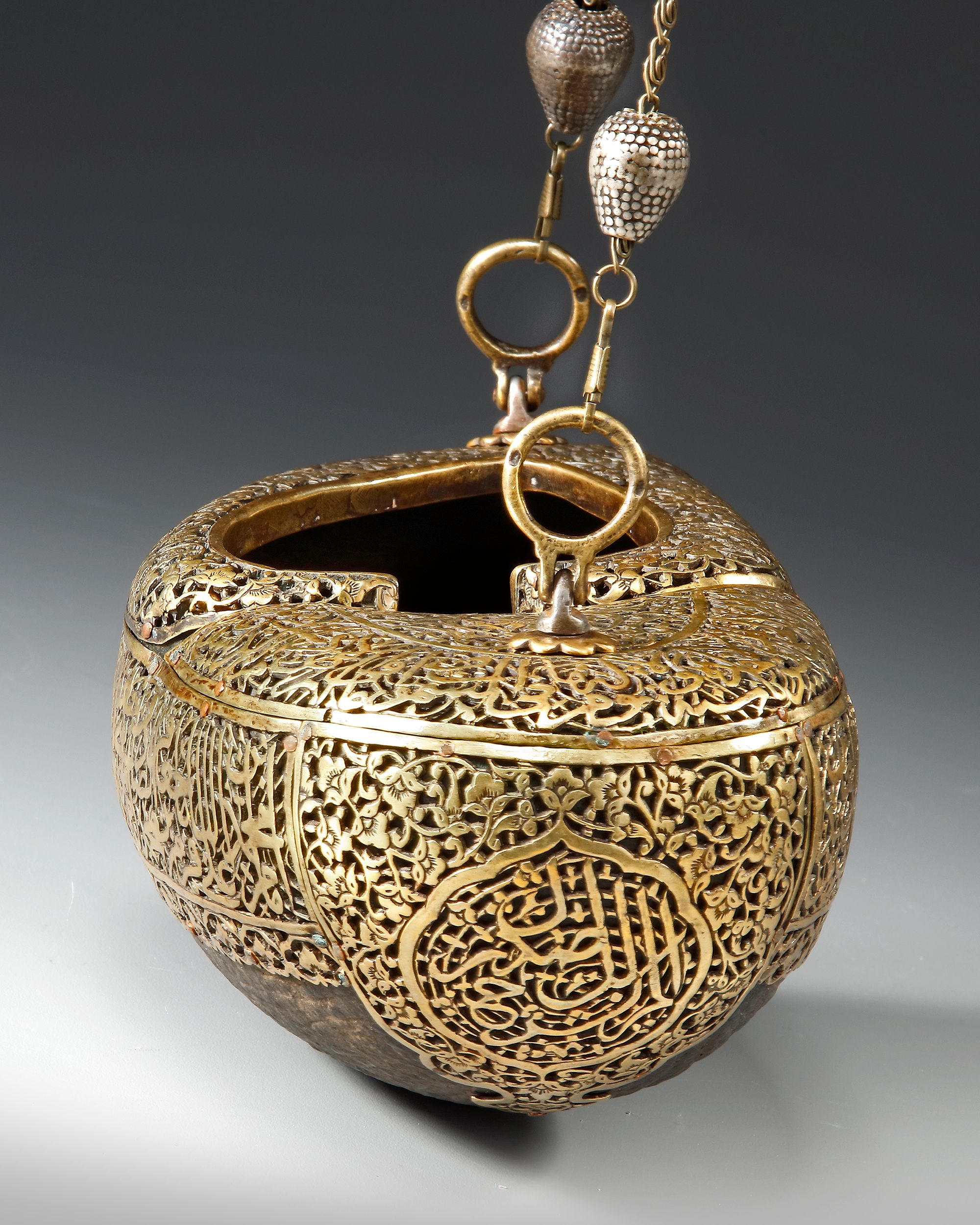 Of typical form, mounted with brass panels, decorated in open work with a band of inscription-filled cartouches, surrounded by bands containing scrolling floral vines, with suspension loops and chain.
