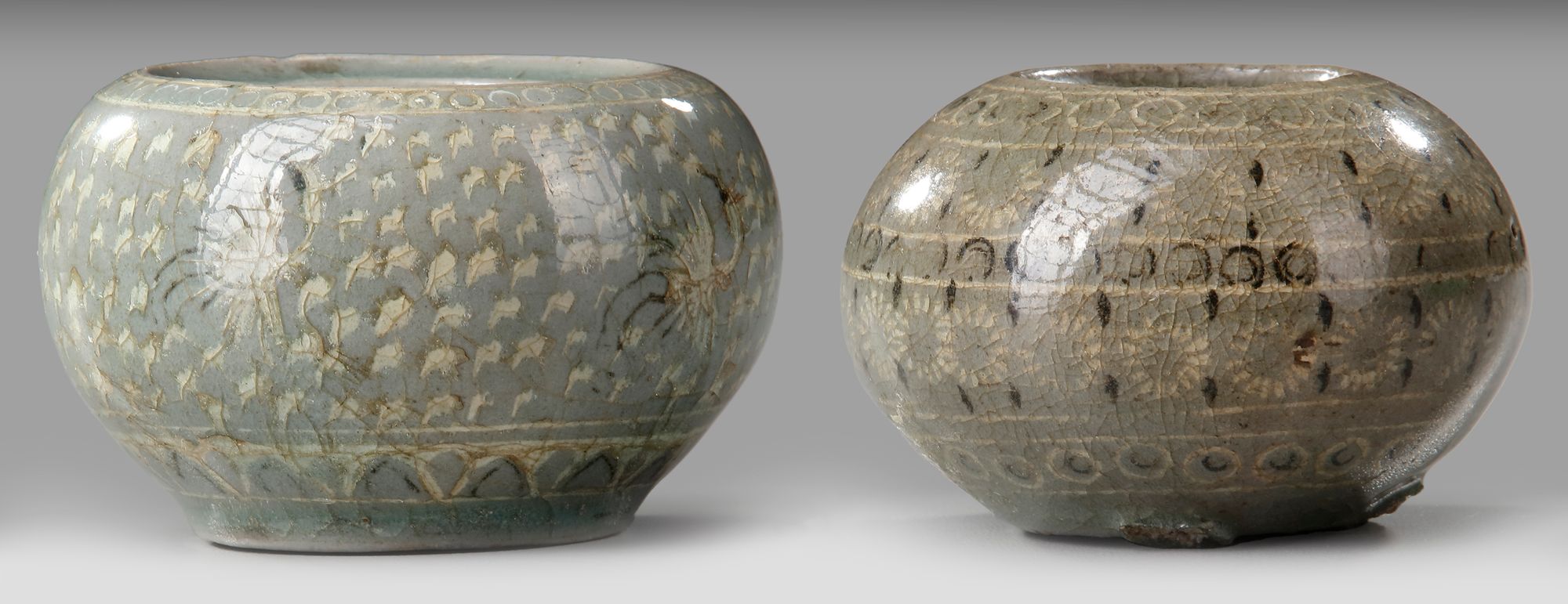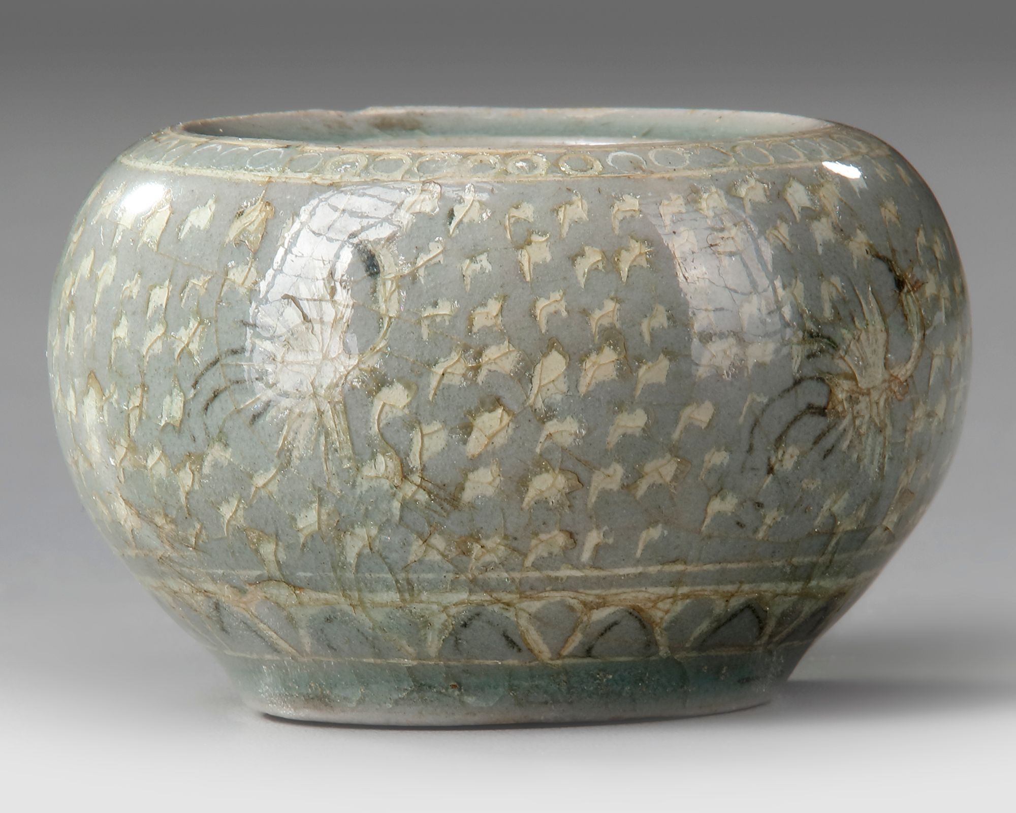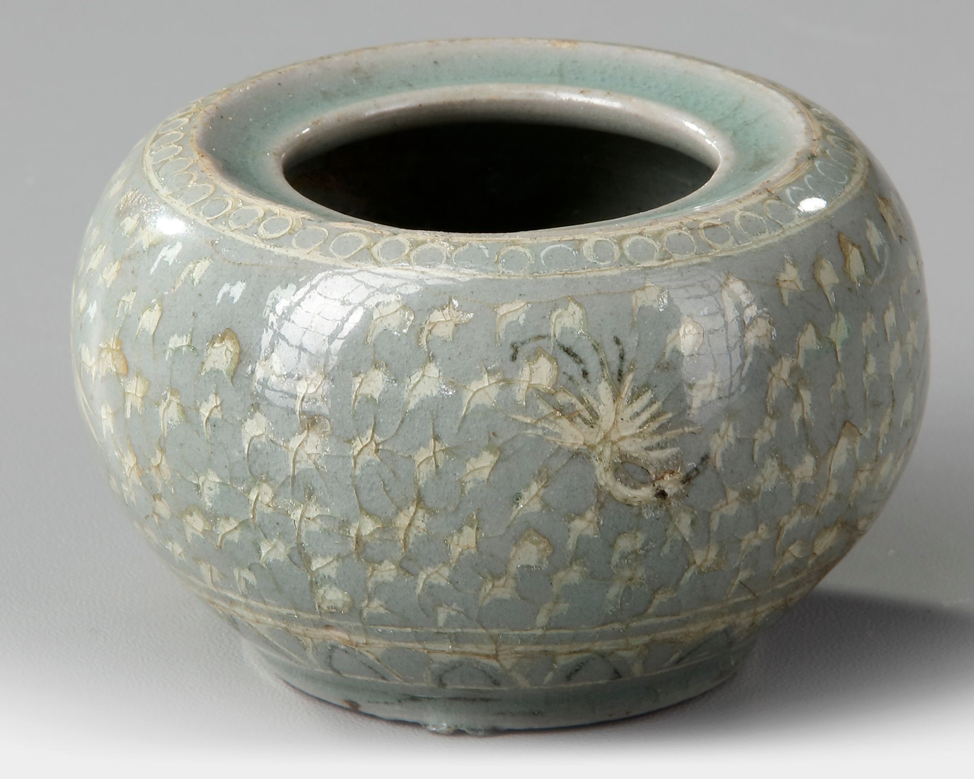 A small celadon crackle glaze jar, decoration with cranes and clouds.