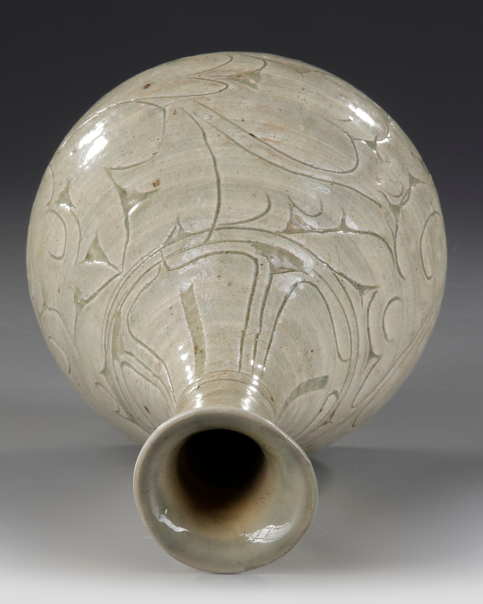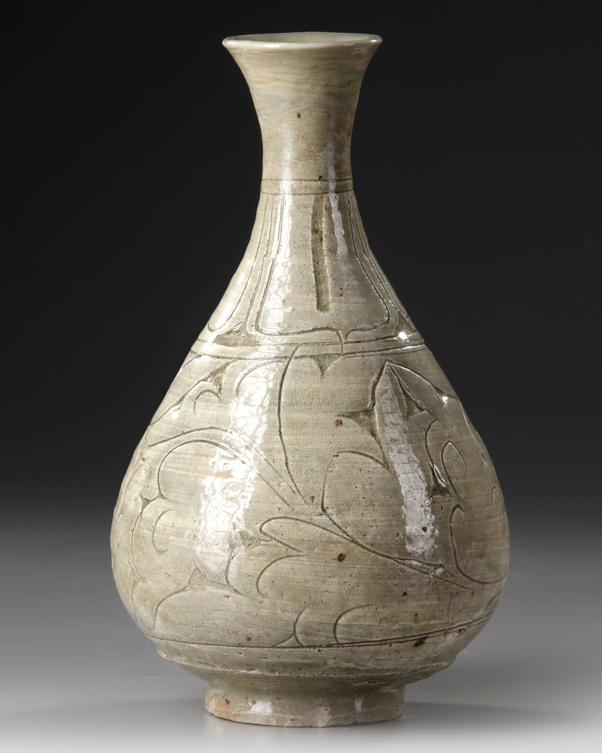 Of pear form set on an inset, high ring foot, ornamented with a wide band of lotus leaves defined by deeply incised lines and a narrow band of lappets, also created by incised lines and by larger channels scraped away in Sgraffito technique, both panels separated by incised lines, the body covered overall by a green-tinged transparent crackled glaze, olive or emerald in the carved and incised areas.