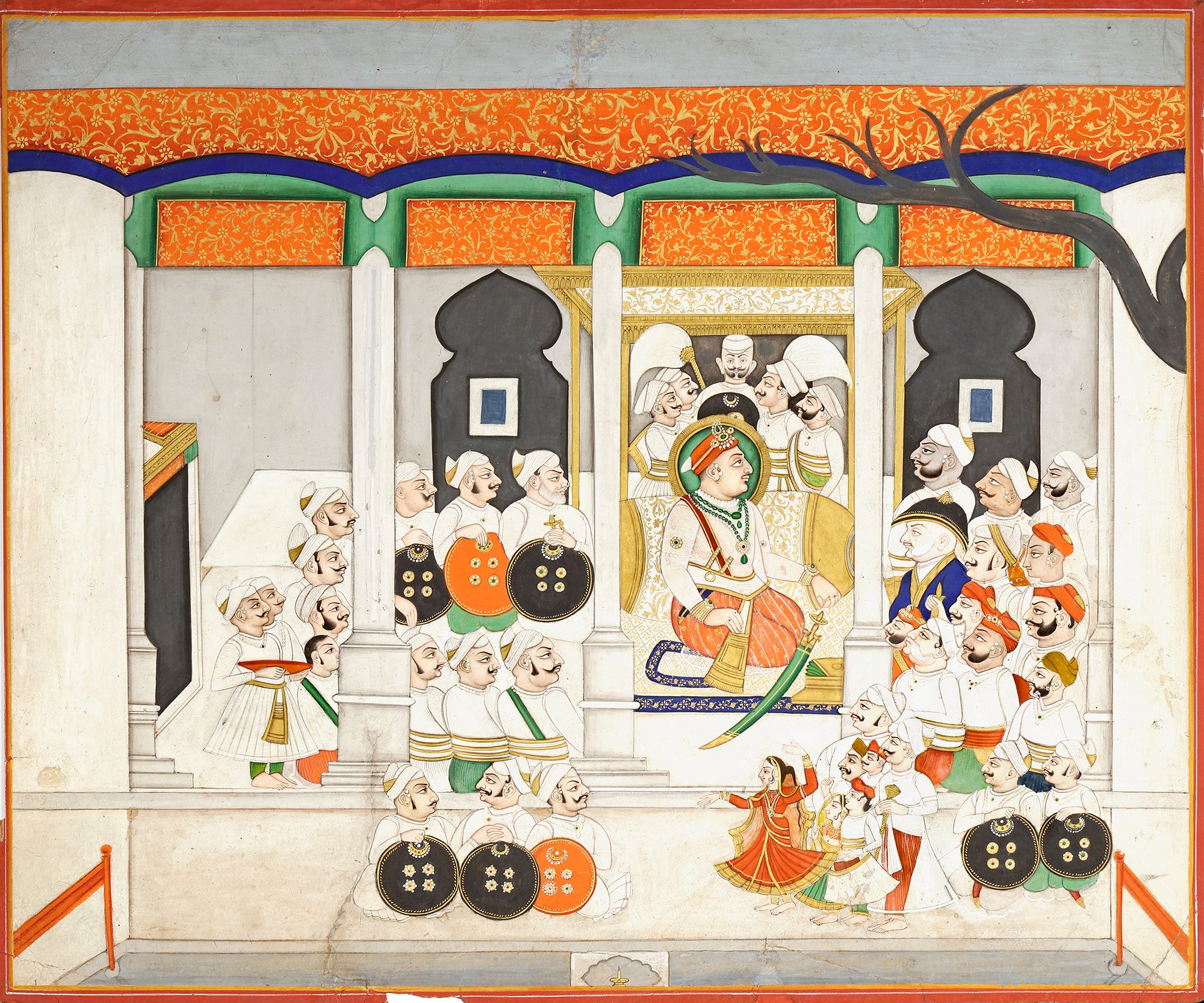 Maharaja of Kotah holding a durbar with his courtiers and a British Regent. Below dancers and musicians entertaining the audience.