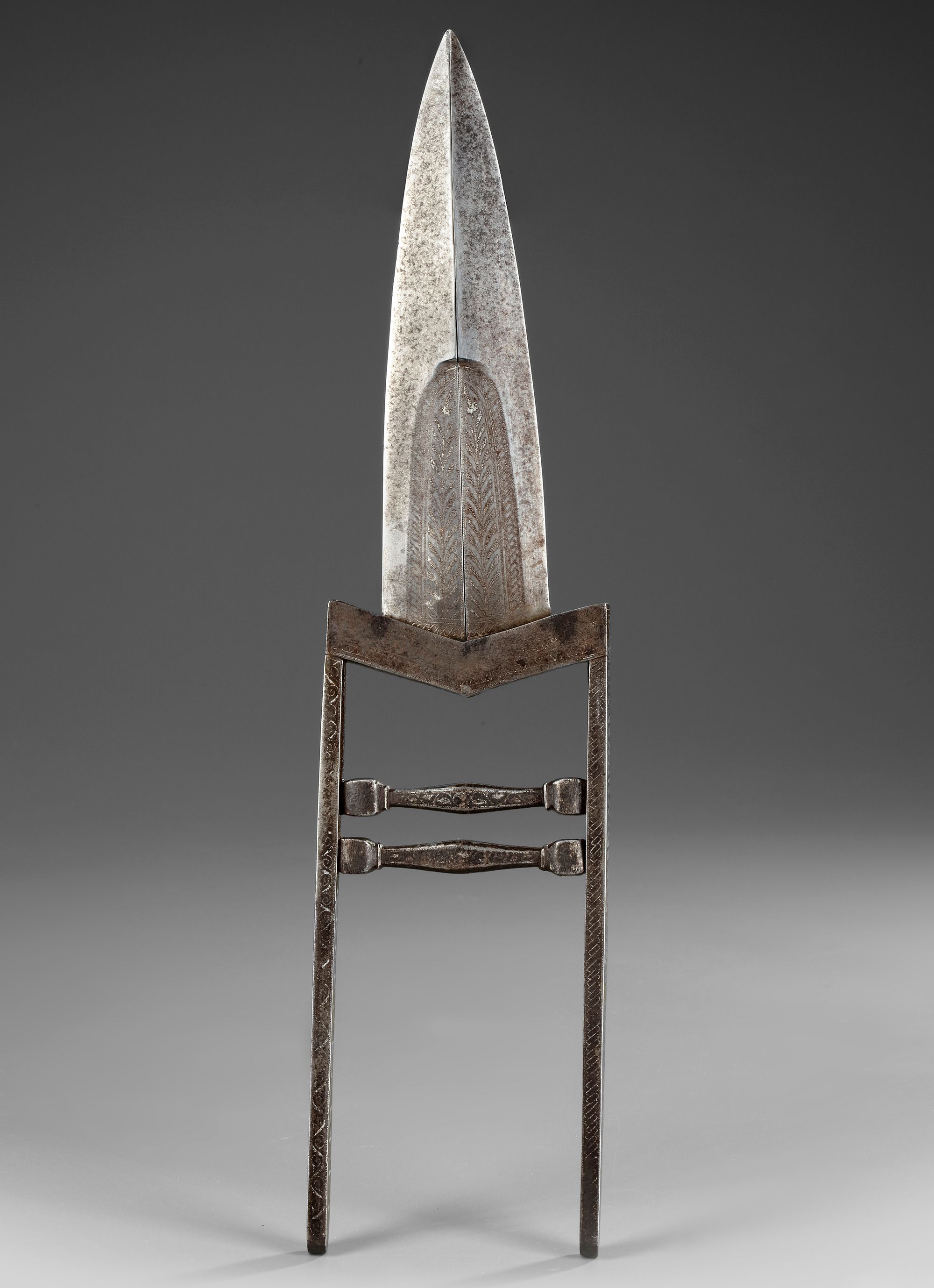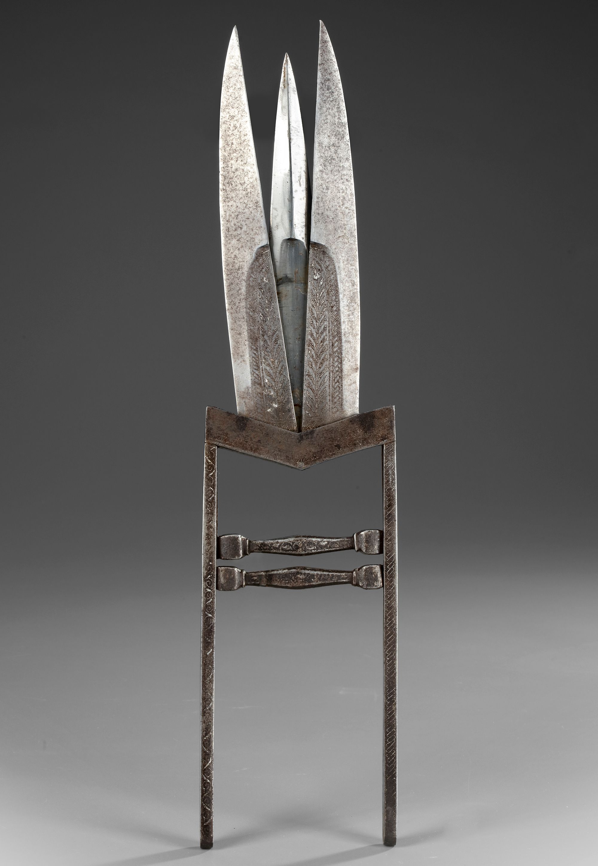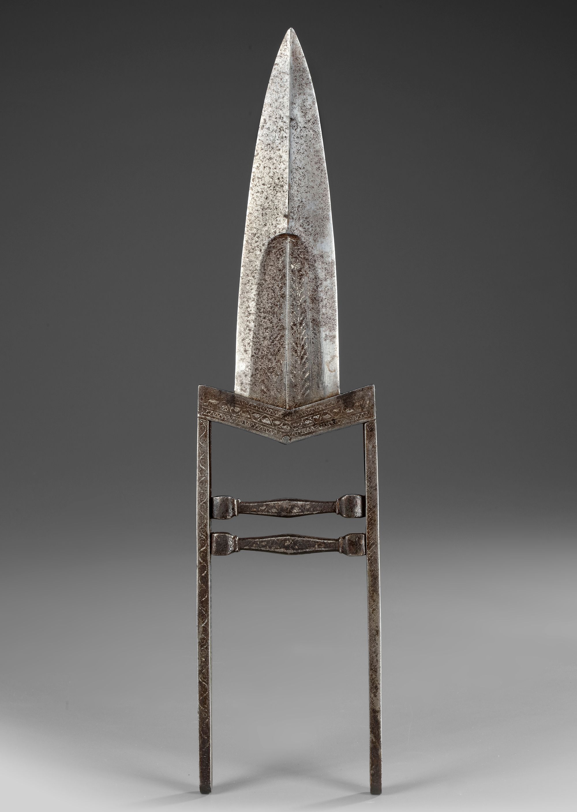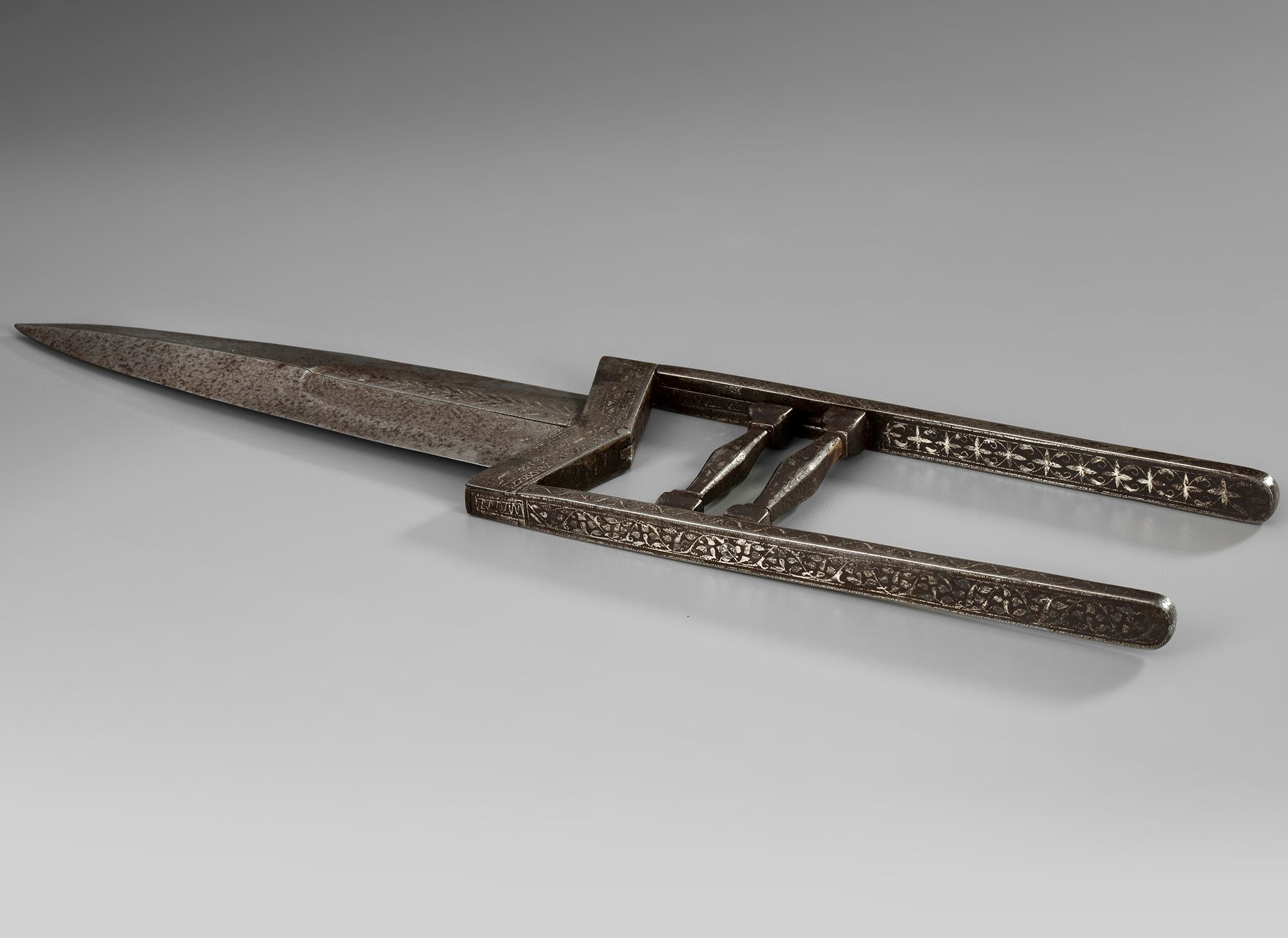 Daggers of this ancient Indian type are known variously as a katar (piercing dagger) or jamadhar (death tooth). Gripped in the fist, they were intended to deliver a deadly punching blow and were used in both war and the hunt. When the grip is squeezed, the blade splits into two and reveals another blade at the center.