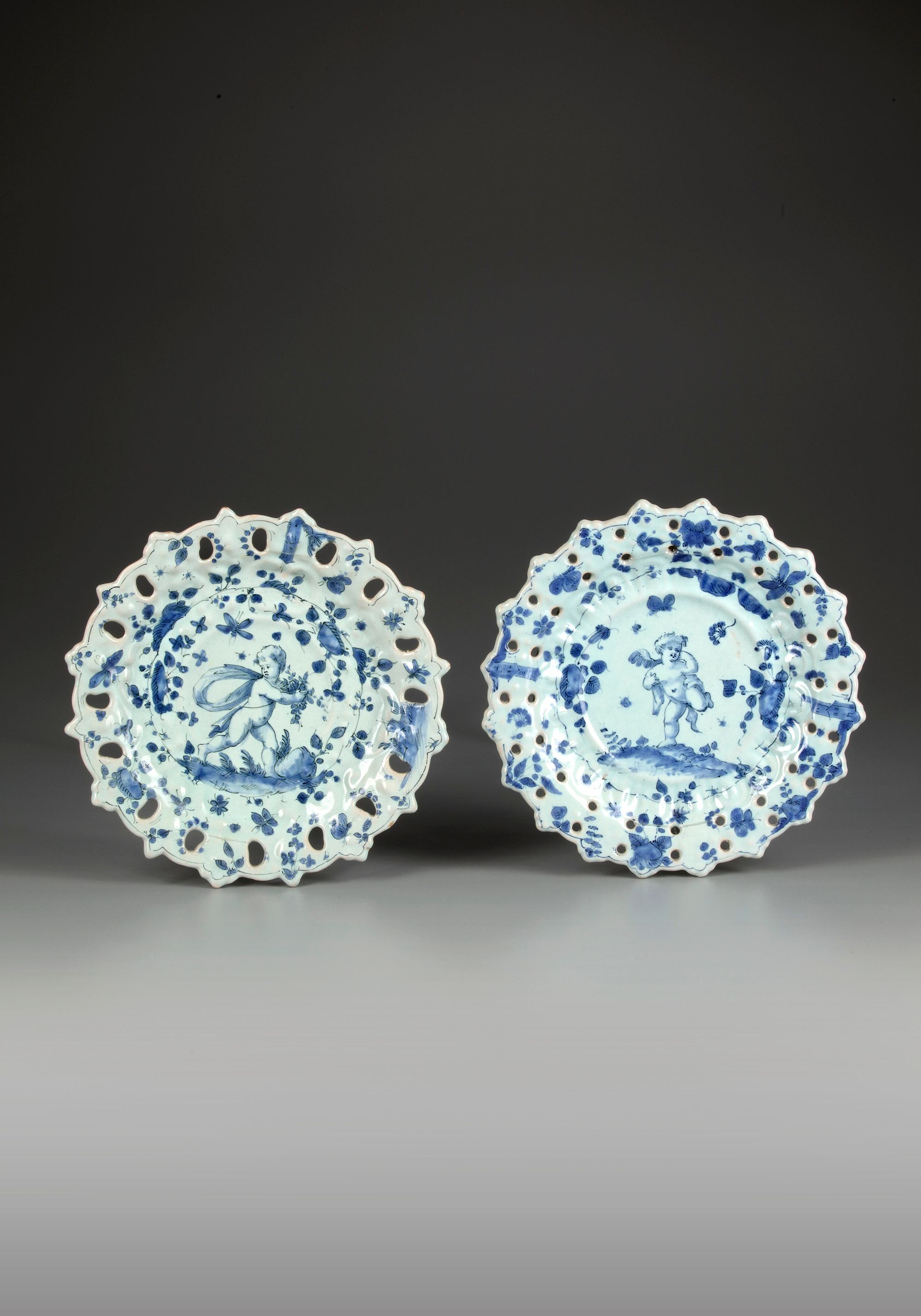 Depicting putti amidst insects and flowers. Openwork rim. Good condition