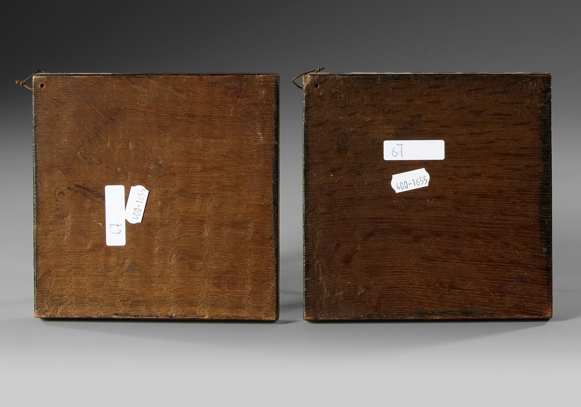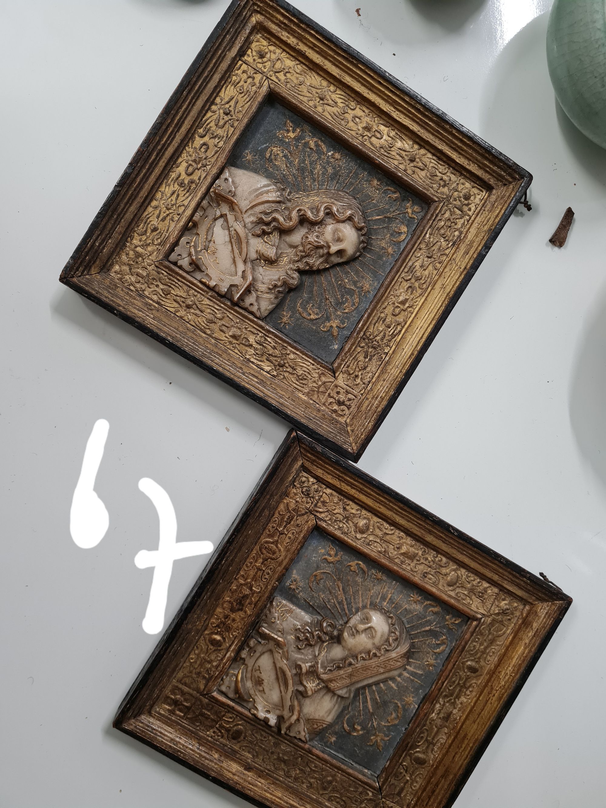 A pair of Mechelen alabaster plaques depicting Mary and Jesus.Monogrammed for Tobias Tissenaken, deaken of the Lucasgilde in 1619.